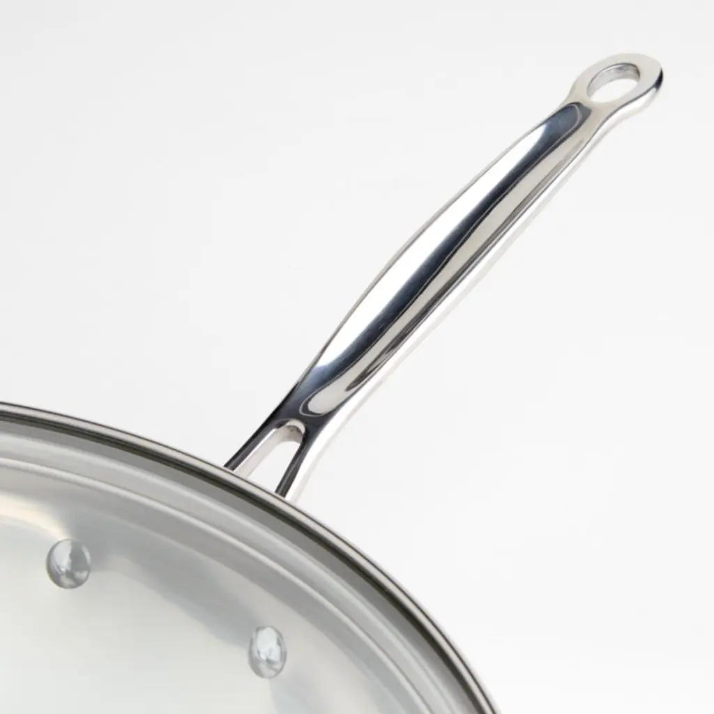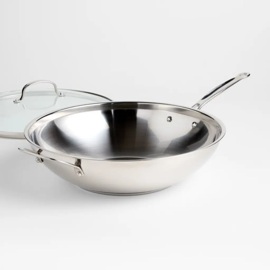 Stir fry vegetables, meat and more beautifully in this deeply curved pan designed for high-heat cooking. Mirror-finished stainless steel that won't discolor encapsulates an aluminum base that spreads heat evenly, and the tight-fitting glass lid seals in moisture. Oven-safe, suitable for use with all stovetops, and dishwasher-safe for quick cleanup after meals, the lidded stir fry pan features interior measurement markings and a drip-free pouring rim for ease of use.Cuisinart has been creating inventive and accessible kitchen appliances, cookware and accessories for nearly 50 years.