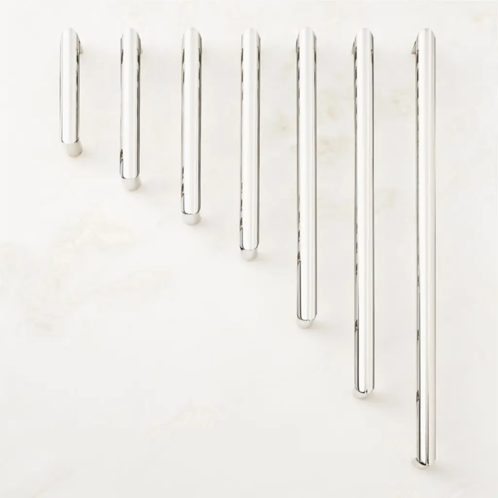 Crafted of solid brass, curved polished nickel cabinet handle by Barcelona-based Mermelada Estudio evokes a modern sensibility. Pair with the Curveaux knob for a cohesive look. CB2 exclusive.