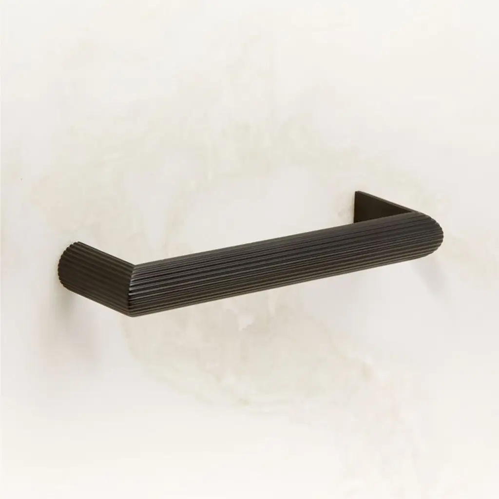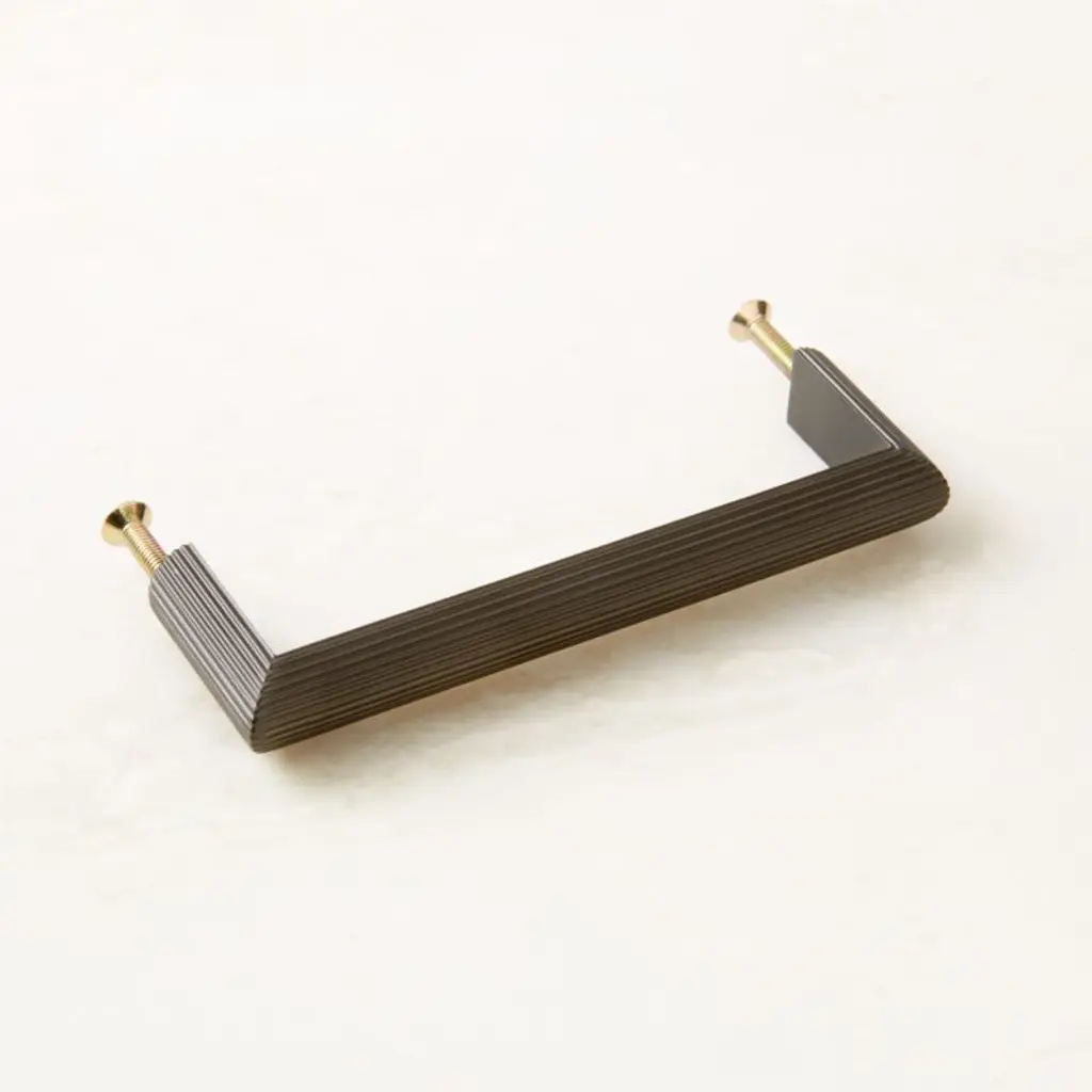 Crafted of solid brass, curved black cabinet handle by Barcelona-based Mermelada Estudio is scored with bold lines for a modern sensibility. Pair with the Curveaux scored knob for a cohesive look. CB2 exclusive.