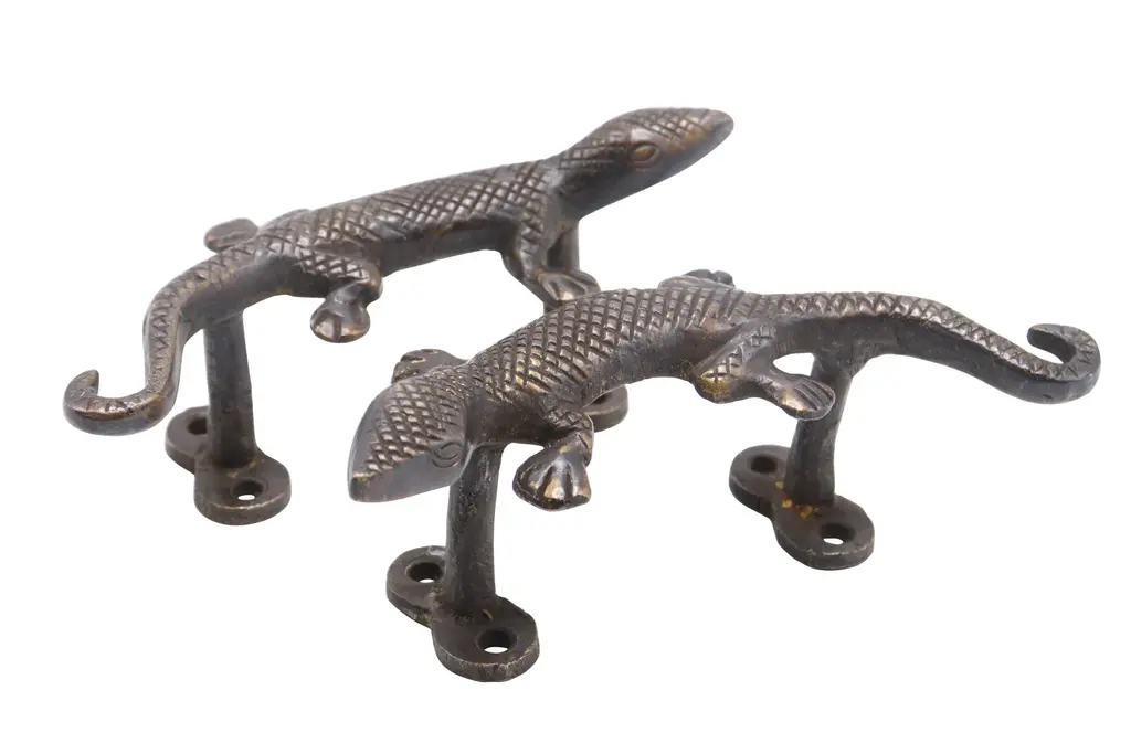 A pair of dark brass lizard door handles or cabinet pulls. Pressed with simple details to convey skin, eyes and toes. Dimensions per handle.