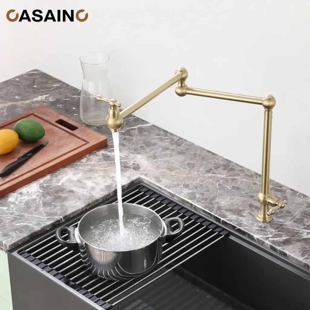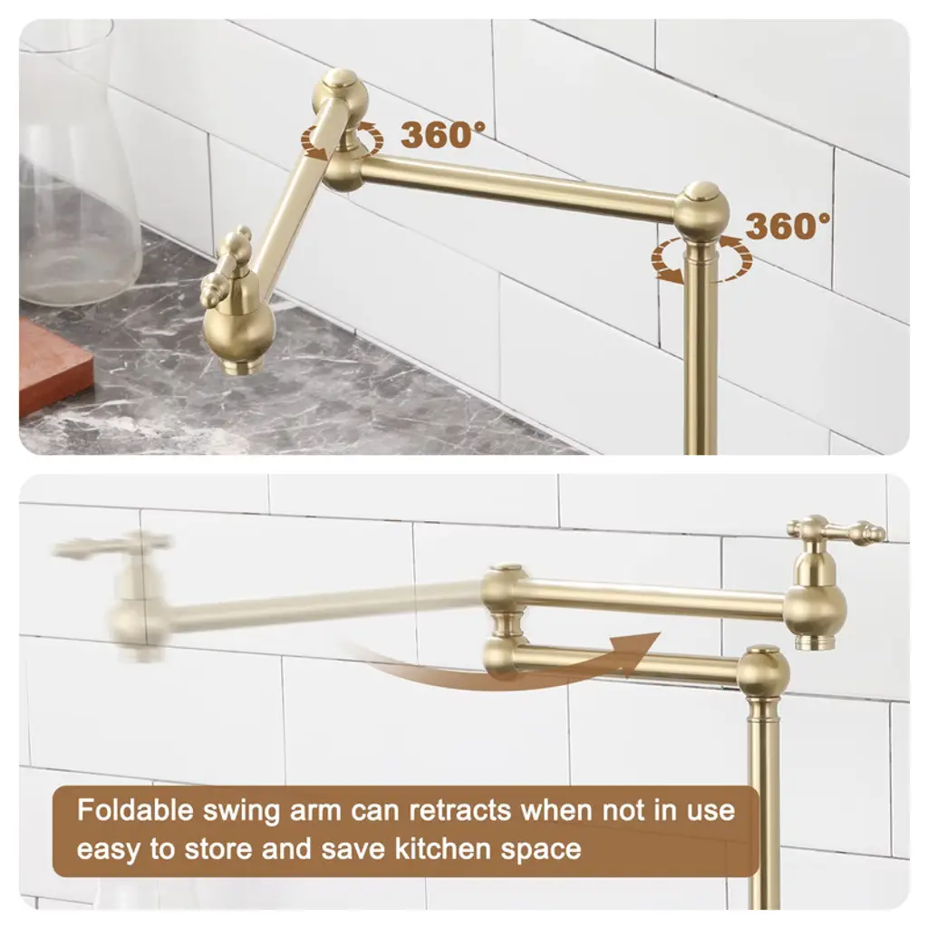 Reimagine the look of your kitchen by adding a classic, industrial look with this kitchen faucet. This pot filler faucet brings professional convenience to home cooks. With a double-switch water control, the swing spout can wash at multiple angles for more flexible use. The faucet also can fold away when not in use, allowing you to save space.