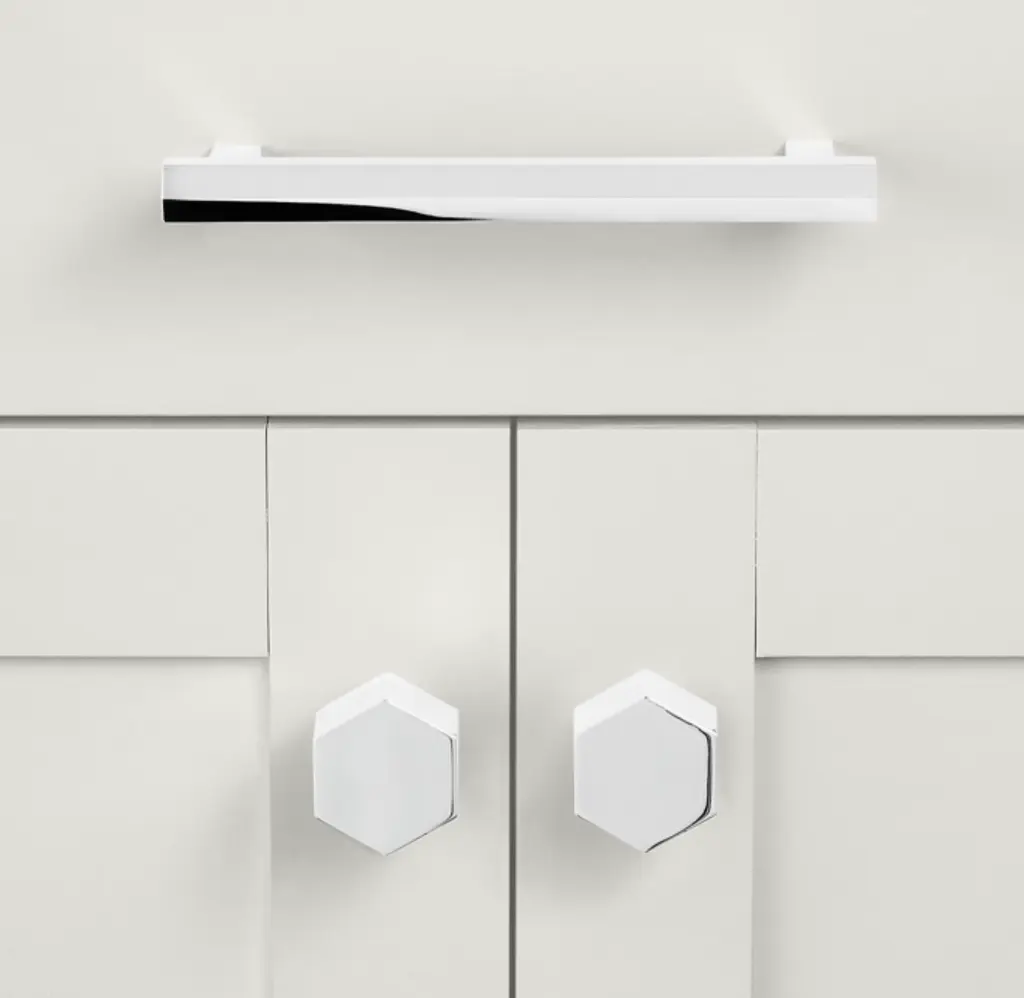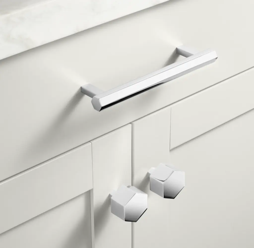 Jonathan Browning's minimalist Dover collection plays up the beauty of pure geometry. The pull's six facets reflect ambient light with multilayered complexity, producing a highlight, a midtone, and a shadow. Hexagonal knobs echo the motif.