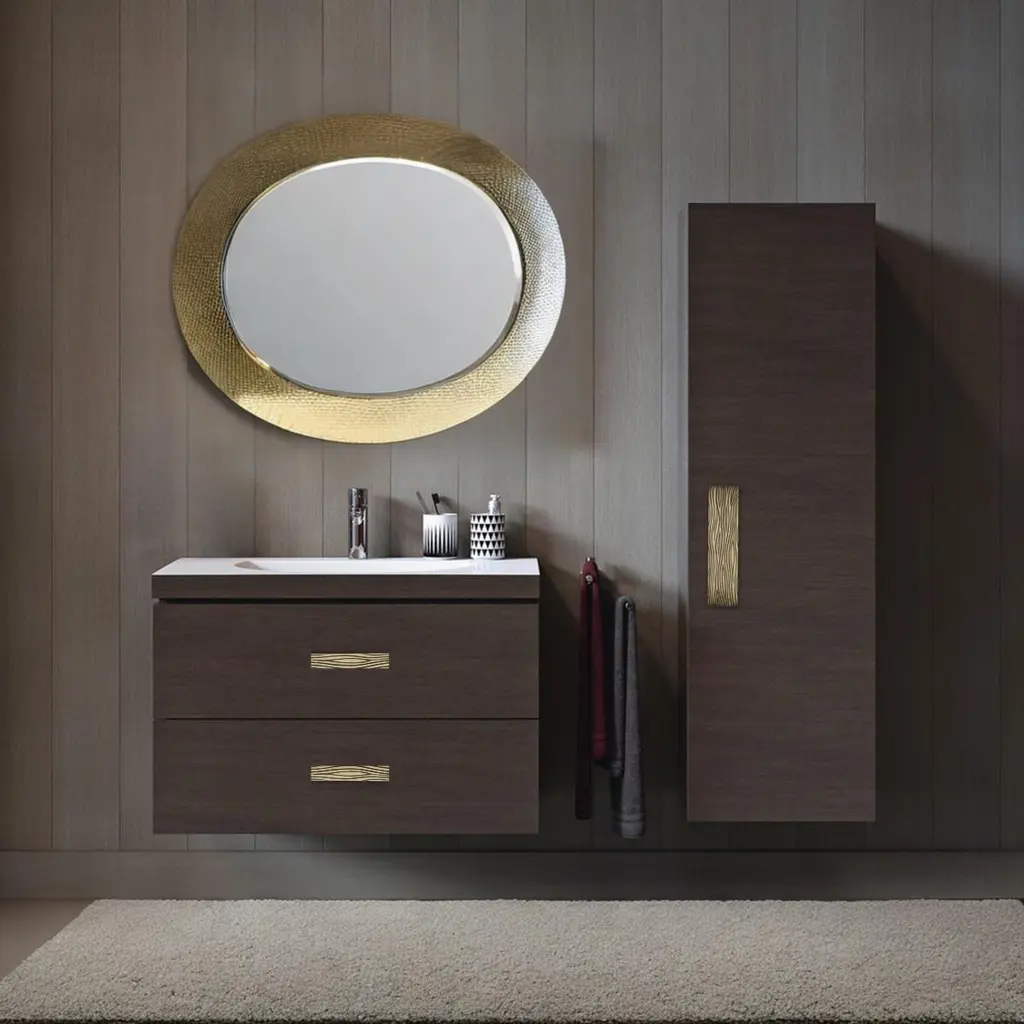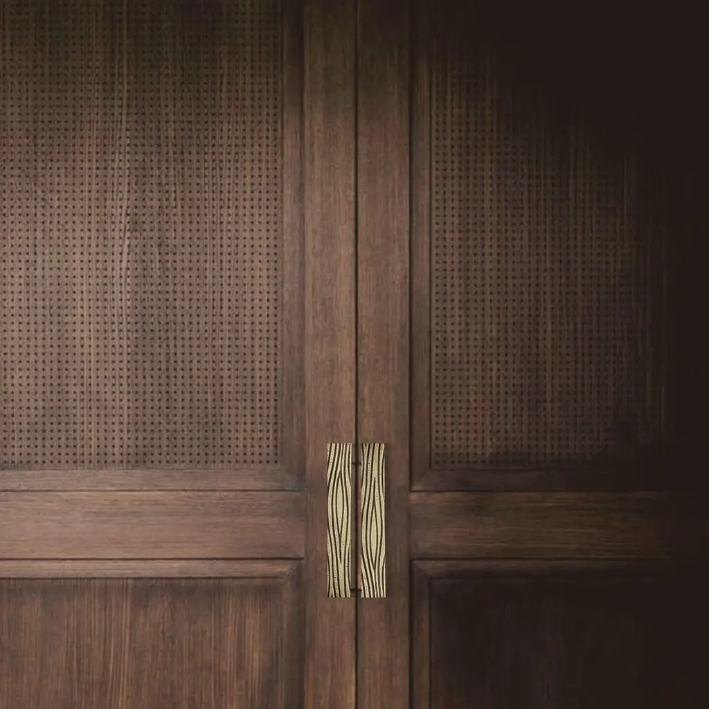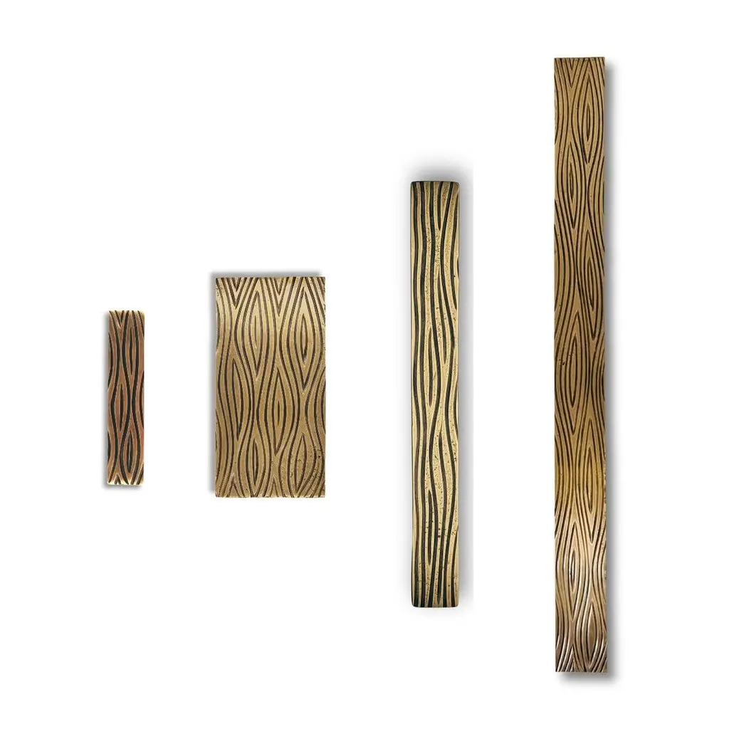 Use: Indoor or protected outdoorMade of solid brass, this rectangular drawer pull belongs to the Earth Prints collection, which explores natural forms and free-flowing textures. Its surface is hand-engraved with a sinuous pattern composed of elongated curves and narrow lines.The recessed sections are finished in gunmetal, while the raised areas retain an aged gold patina. This contrast of tones and depths enhances the reading of the pattern and reveals subtle variations in the material.Measuring 15 cm by 3 cm, this drawer pull is suitable for drawers, cabinet doors, or integrated furniture fronts. It features a through-mount attachment, ensuring secure installation on various surfaces.Designed for indoor or protected outdoor use, it adds a tactile, graphic element to any surface it adorns.note: Differences from the sample/photo provided should not be considered manufacturing defects, but rather a characteristic of the manual process, which may result in variations in color and uniformity.When placed outdoors, finishes may undergo color changes, which should not be considered a defect. Brass is a living material that gradually develops a patina over the years.