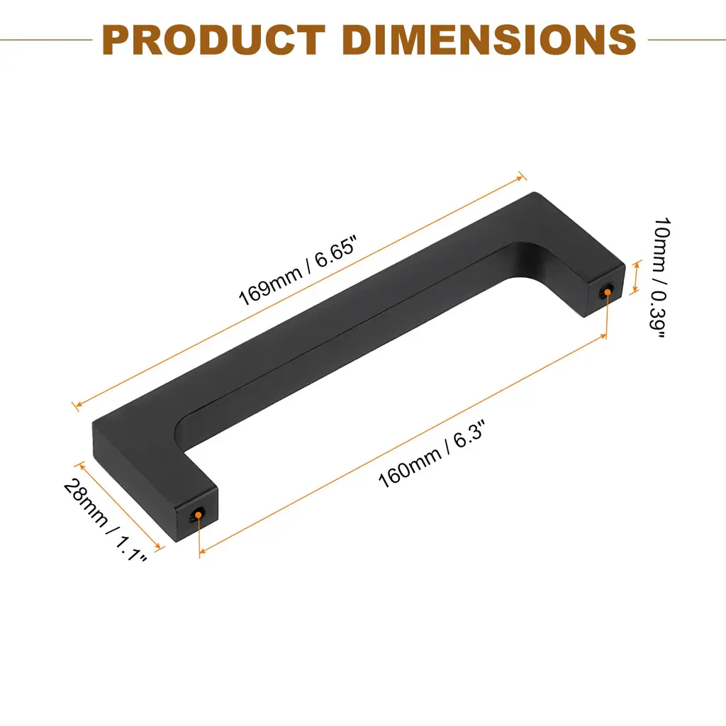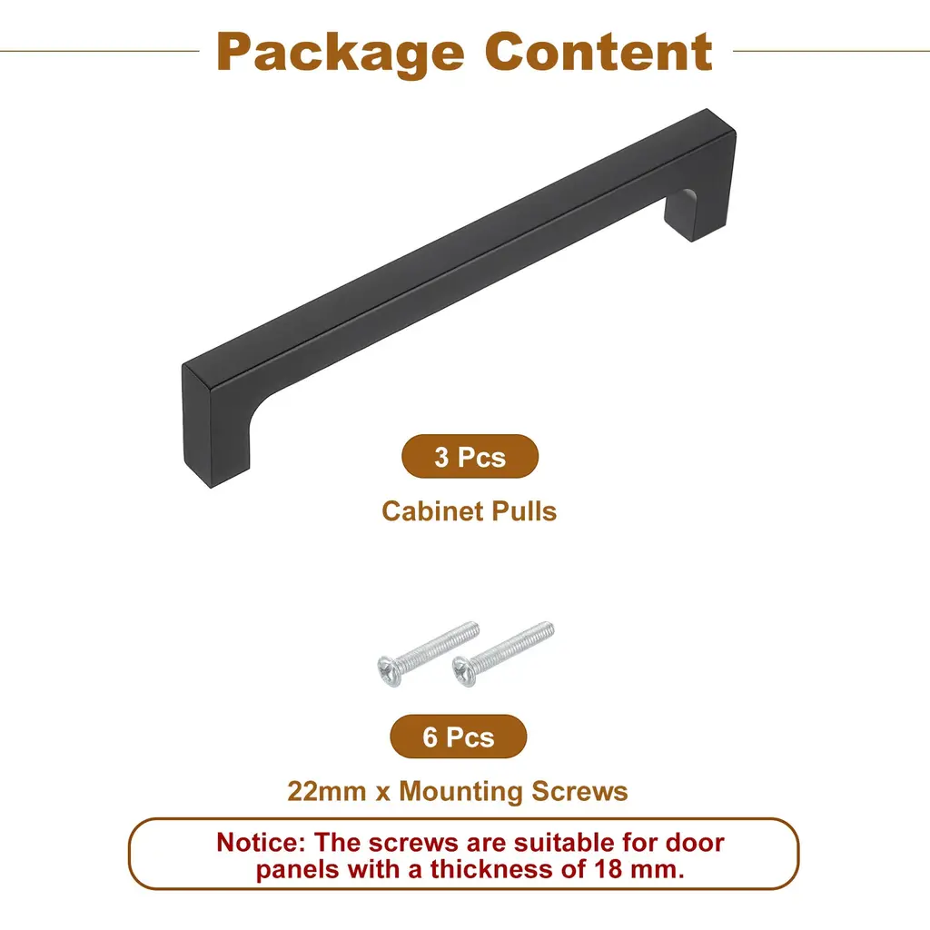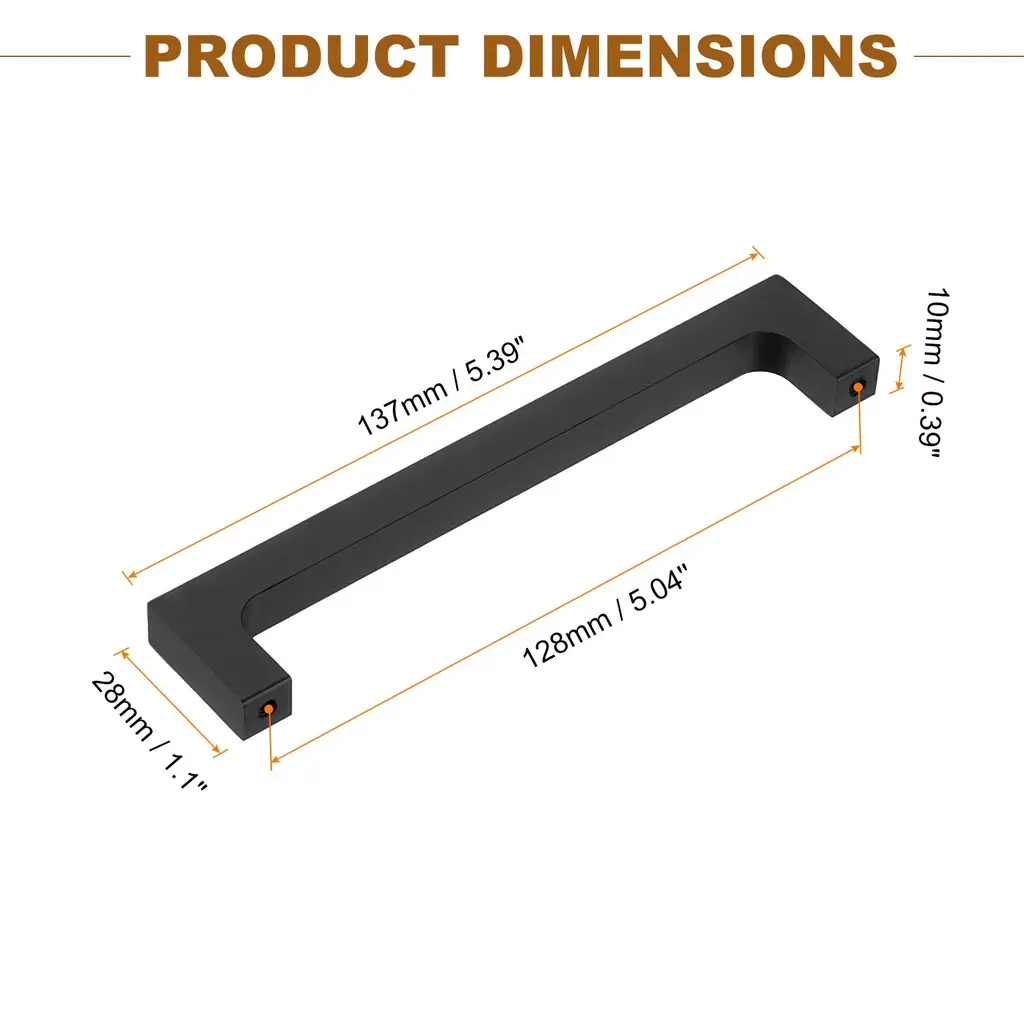 [Good Material] - Made from good quality aluminum alloy, our cabinet pull offers lightweight durability and corrosion resistance. The material's strength ensures long-lasting performance, making it a reliable choice for kitchen cabinets and drawers.[Simple Appearance] - Enhance the appearance of your cabinets with our sleek and modern cabinet pulls. The simple yet elegant design adds a touch of sophistication to your kitchen decor, creating a cohesive and stylish look in your living spaces.[Easy to Install] - The ergonomic design and standard hole spacing make installation quick and straightforward, allowing you to easily upgrade your cabinetry. If you are replacing handles, please measure and make sure the center-to-center spacing of the two holes on your cabinet matches the spacing of our handles, and you will have a more suitable hardware handle.[Scope of Application] - Explore the wide range of uses for our cabinet handles in kitchens, bathrooms, and furniture projects. From cabinet doors to drawers, these versatile pulls offer a stylish and functional solution for updating and customizing your cabinetry.Specification:Overall Size: 137 x 10 x 28 mm / 5.39" x 0.39" x 1.1" (L x W x H)Hole Spacing: 128mm / 5.04''Material: Aluminum AlloyColor: BlackPackage Content: 1Pcs x Cabinet Pulls, 2Pcs x 22mm Mounting Screws