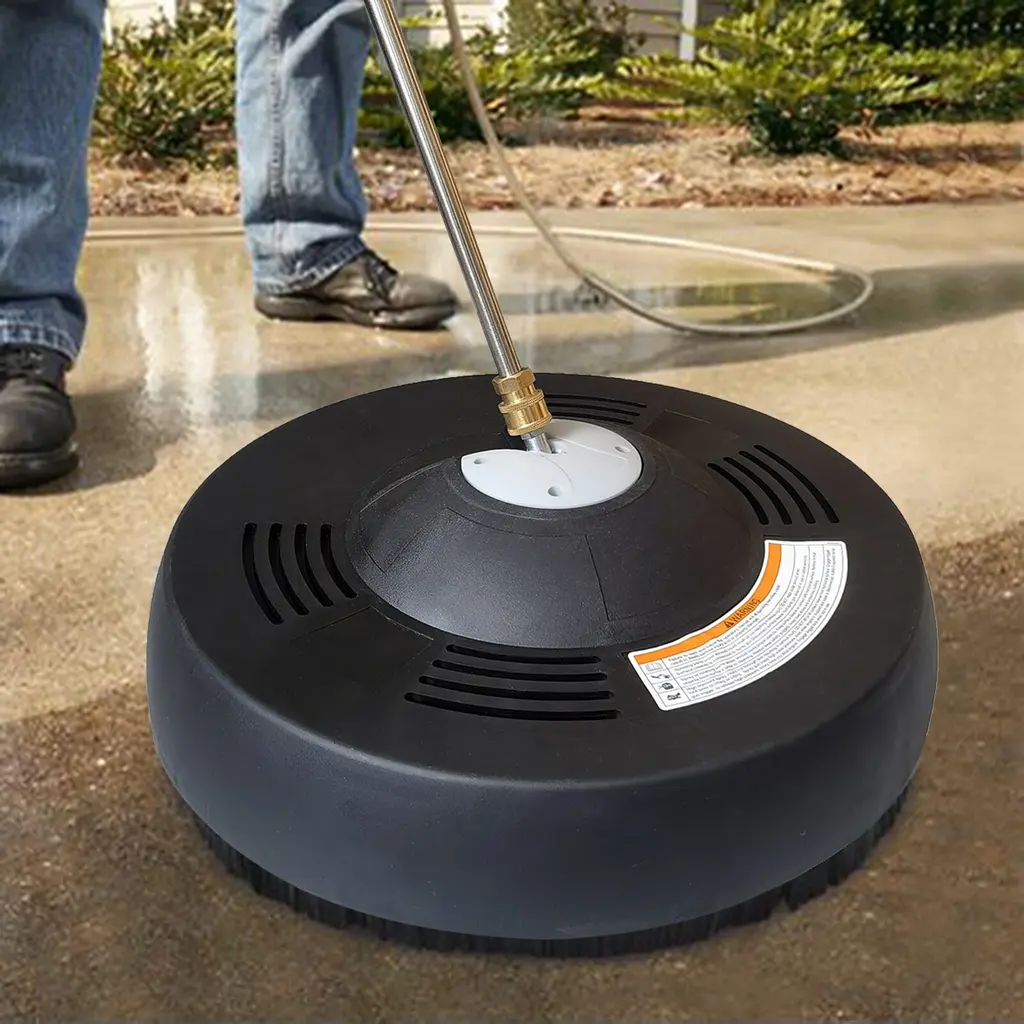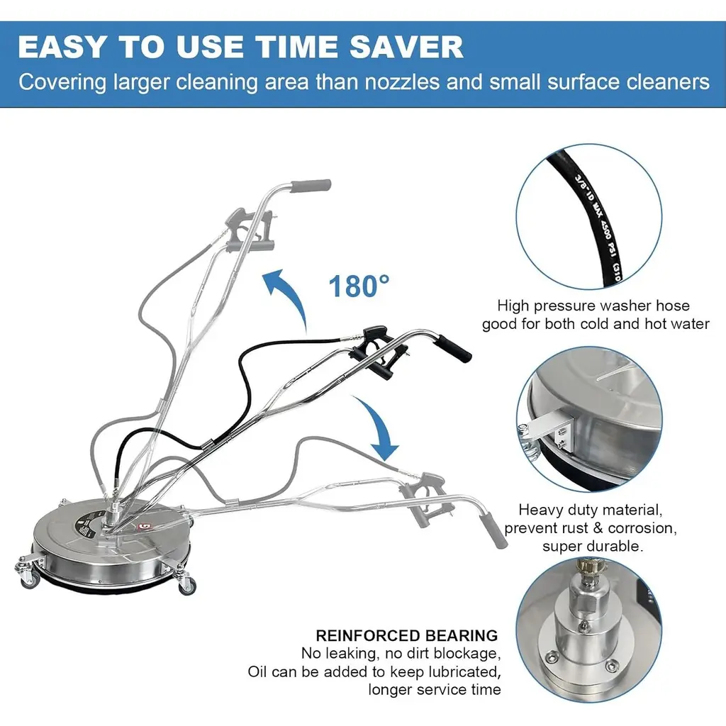 Professional Surface Cleaner: If you have a large flat surfaces such as patios, driveway, sidewalk, porch or deck, this pressure washer surface cleaner will get the job done, our pressure washer surface cleaner have two size for home use, easy to widely use and enhance the relationship between family. And also could be used on vertical surfaces like brick walls, stucco and others.Enhanced Mobility and Comfort: Power Washer Surface Cleaner equipped with four wheels and dual handles, these special features ensure easy mobility and control during operation. The thoughtful design also allows you to maneuver smoothly, preventing strain on the arms and backs, ensuring a comfortable cleaning experience. Compare to traditional models, this design not only saves 80% labor and time, but provides better flexibility, stability and comfort.Lightweight Yet Strong Enough: If you want your money to be well spent, try this high pressure washer surface cleaner accessory which uses lightweight PP material and fully sealed bearing. The upgraded bearing will prevent leaking and blocking, And it can add oil to lubricate the bearings keeping you dry and safe. The heavy-duty construction design can hold the most powerful water pressure.Easy of Assembly and Compatibility: This 30in surface cleaner attachment is 5200 PSI & 13.8 GPM, this 20in surface cleaner attachment is 4600 PSI & 11.5 GPM, equipped with 3/8" Quick Plug inlet allows for quick and secure attachment to your pressure washer hose, ensuring hassle-free attachment to almost all gas and electric pressure washers which are above 2000 PSI & 2 GPM. Also available for hot water machine. The easy setup makes this pressure washer accessory a versatile choice for homeowners and professionals alike.User-Friendly Design: Equipped with an adjustable handle for ease of use. Simply activate the pressure washer and press the trigger to initiate water flow through the nozzles. By walking behind the device at a steady pace, you can efficiently clean surfaces as you move.