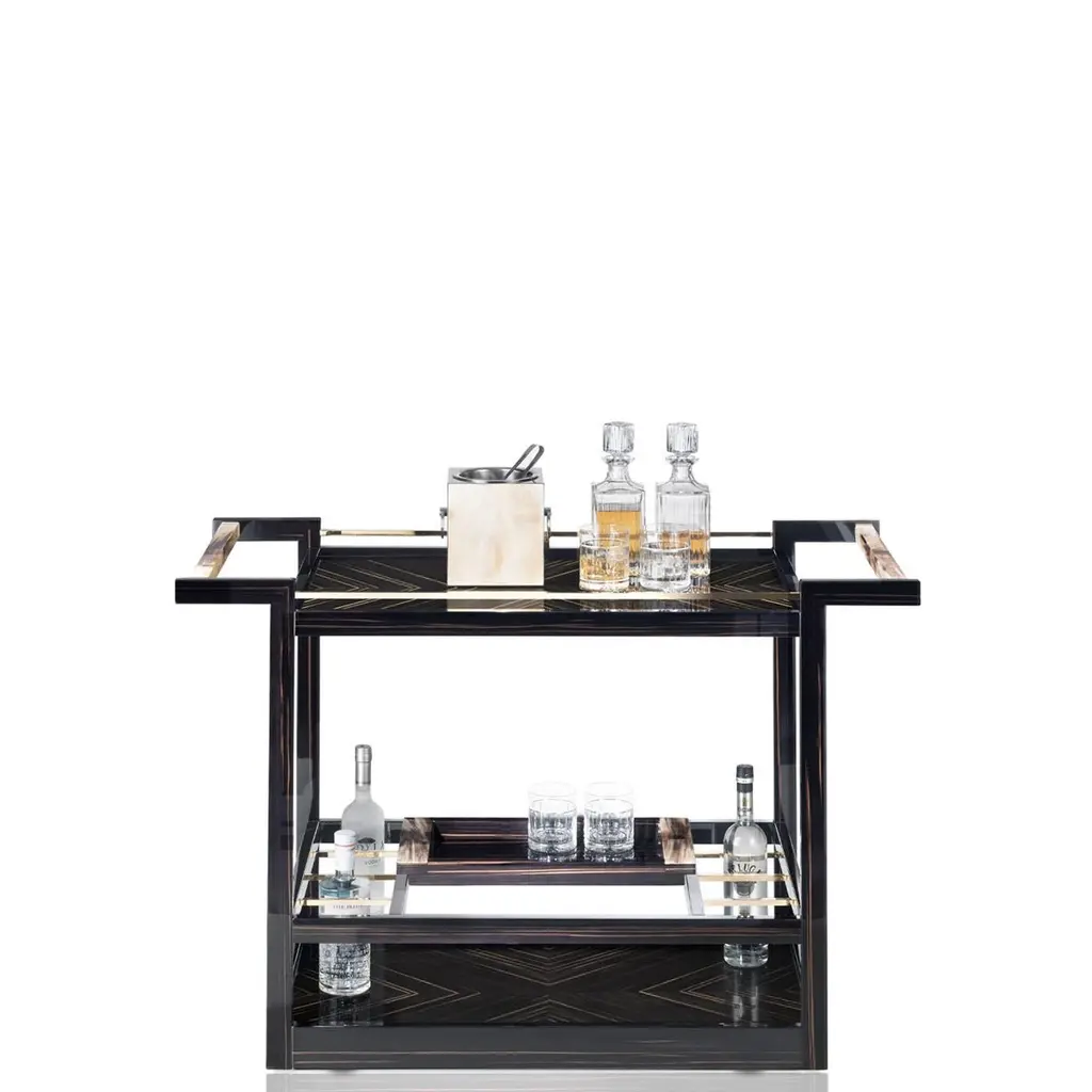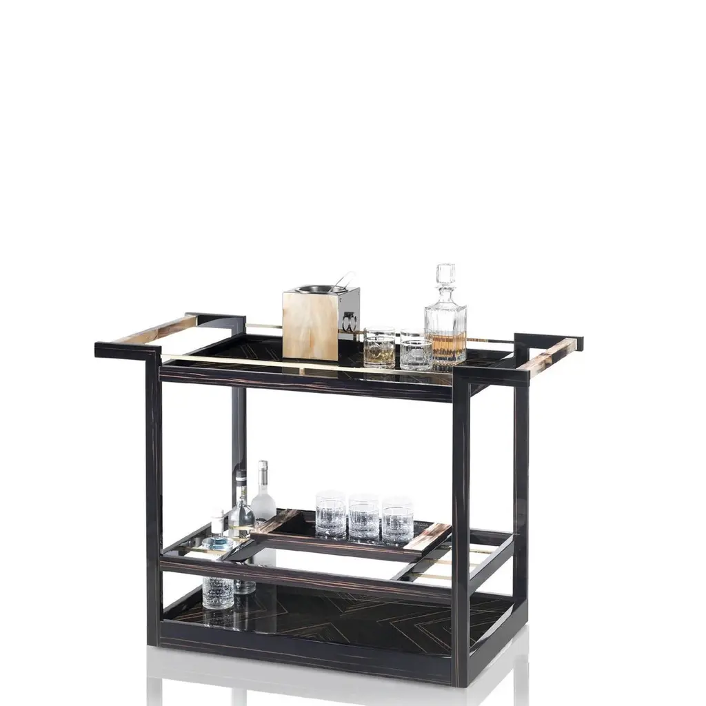 Meant for entertaining your guests, Elia trolley is the perfect choice to stock your bar essentials or serve delicacies and drinks without compromising elegance. The sleek design of the structure in glossy ebony is enriched by exquisite details in Corno Italiano setting this serving cart apart. Practicality is ensured by two bottle racks in 24k gold plated brass and a removable serving tray in Corno Italiano and ebony veneer with gloss finish. Equipped with rubber castors, it ensures easy movement around your home.Note: Colors and shades of Corno Italiano processed by our Company are unique and due to the natural origin of raw material. For this reason Corno Italiano tones that can be seen in pictures are indicative and cannot be reproduced in finished products.