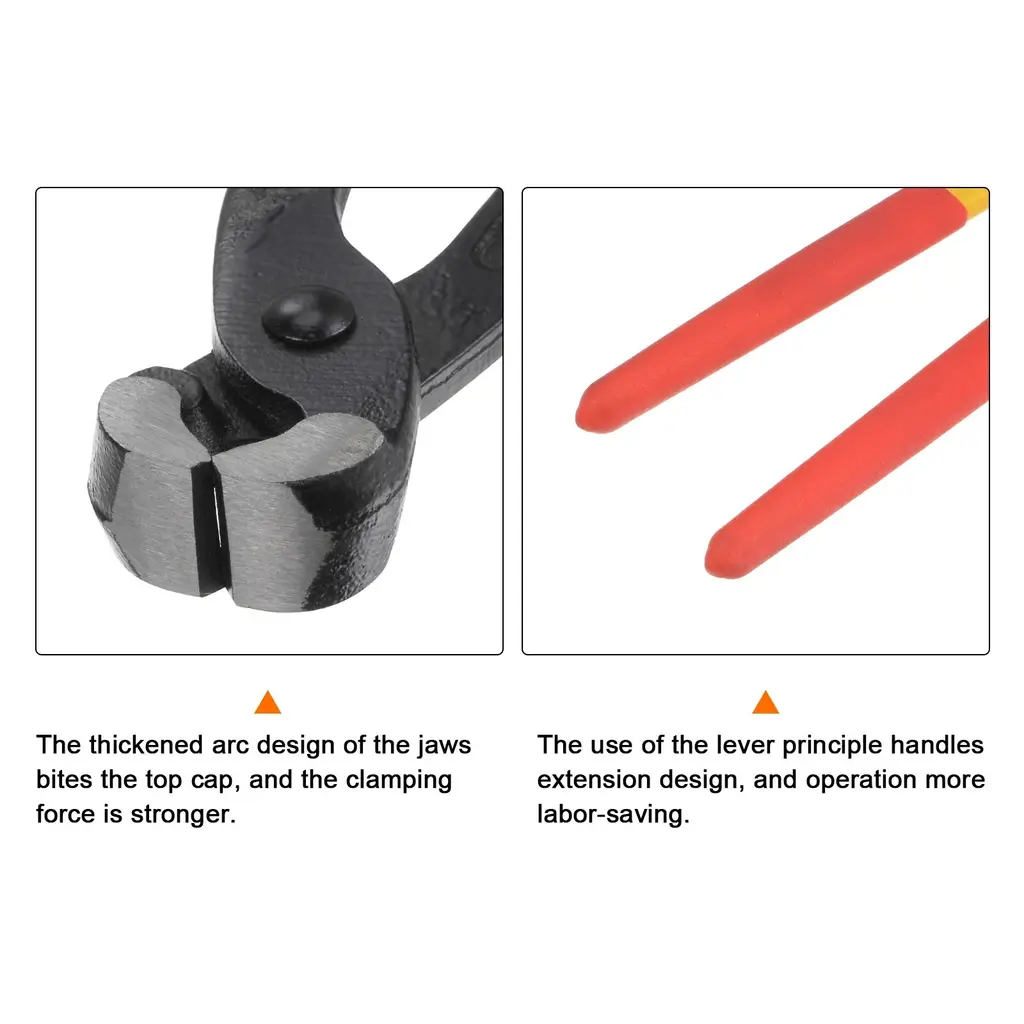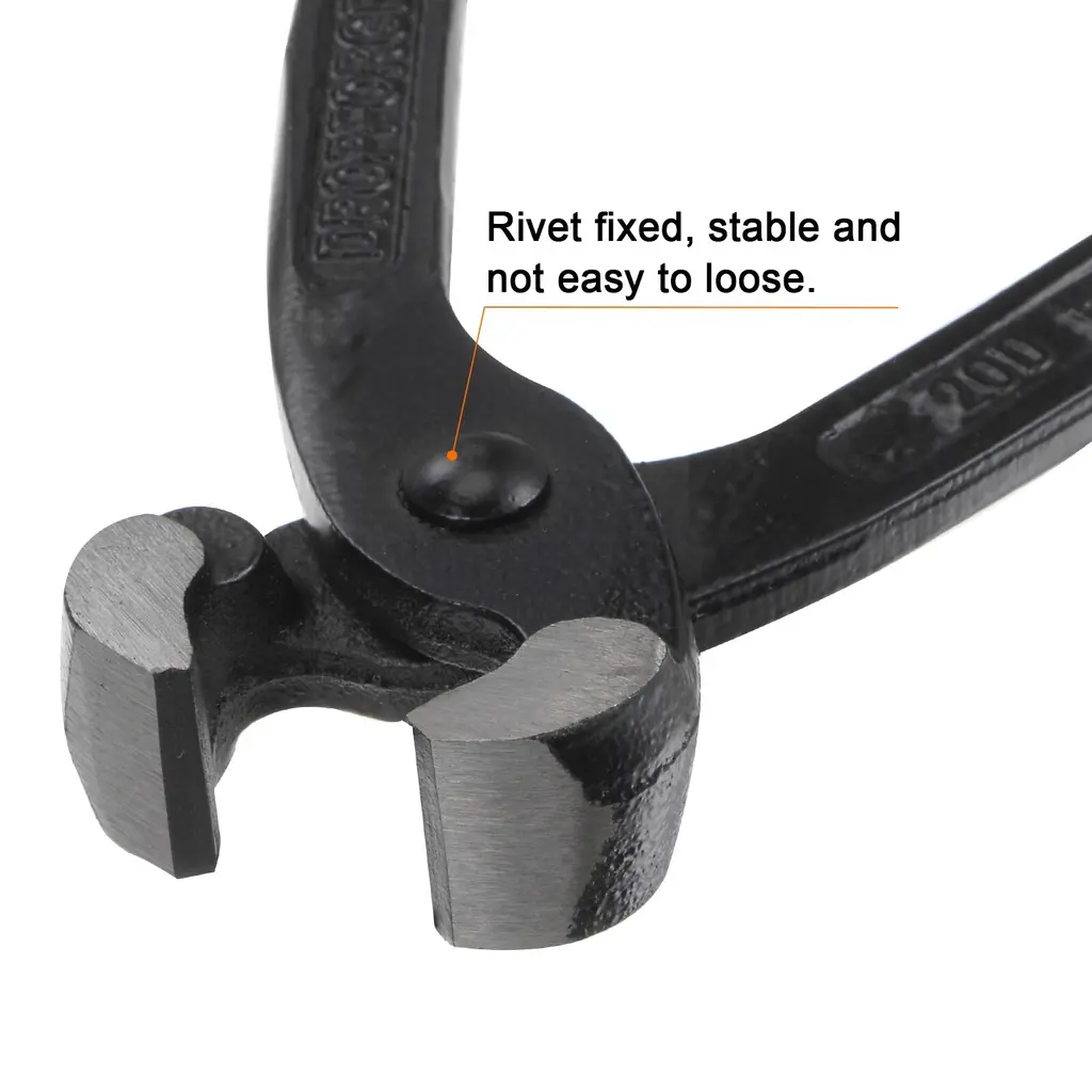 End-Nipper cutting pliers are made of drop-forged carbon steel with heat treatment for long-lasting durability and high strength.Nail pullers feature a high-leverage design with extended handles for firm control and stronger nail pulling. And the thickened arc design of the jaws can bite the top cap and hold it more strongly.The ergonomically designed plastic handles for anti-slip and comfortable grip, reduce hand tiring for long-term use.End cutter pliers are suitable for pulling out nails, cutting off nails, winding copper wires, wires, iron wires, aluminum wires, alloy wires, cable ties, guitar strings, etc, is a good helper for carpenters, shoemakers, floor installation and other professionals.