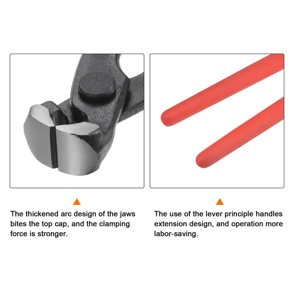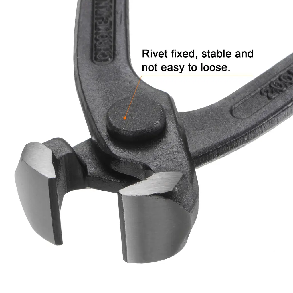 End-Nipper cutting pliers are made of drop-forged carbon steel with heat treatment for long-lasting durability and high strength.Nail pullers feature a high-leverage design with extended handles for firm control and stronger nail pulling. And the thickened arc design of the jaws can bite the top cap and hold it more strongly.The ergonomically designed plastic handles for anti-slip and comfortable grip, reduce hand tiring for long-term use.End cutter pliers are suitable for pulling out nails, cutting off nails, winding copper wires, wires, iron wires, aluminum wires, alloy wires, cable ties, guitar strings, etc, is a good helper for carpenters, shoemakers, floor installation and other professionals.