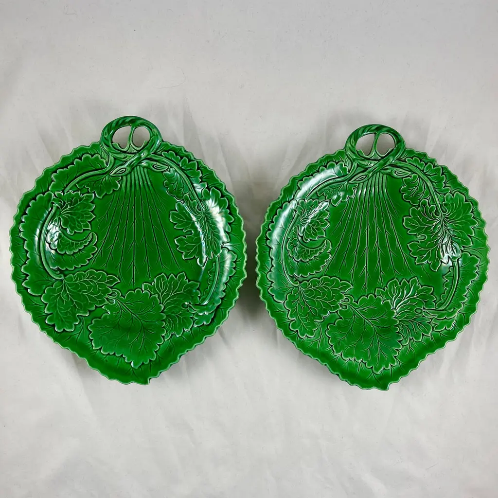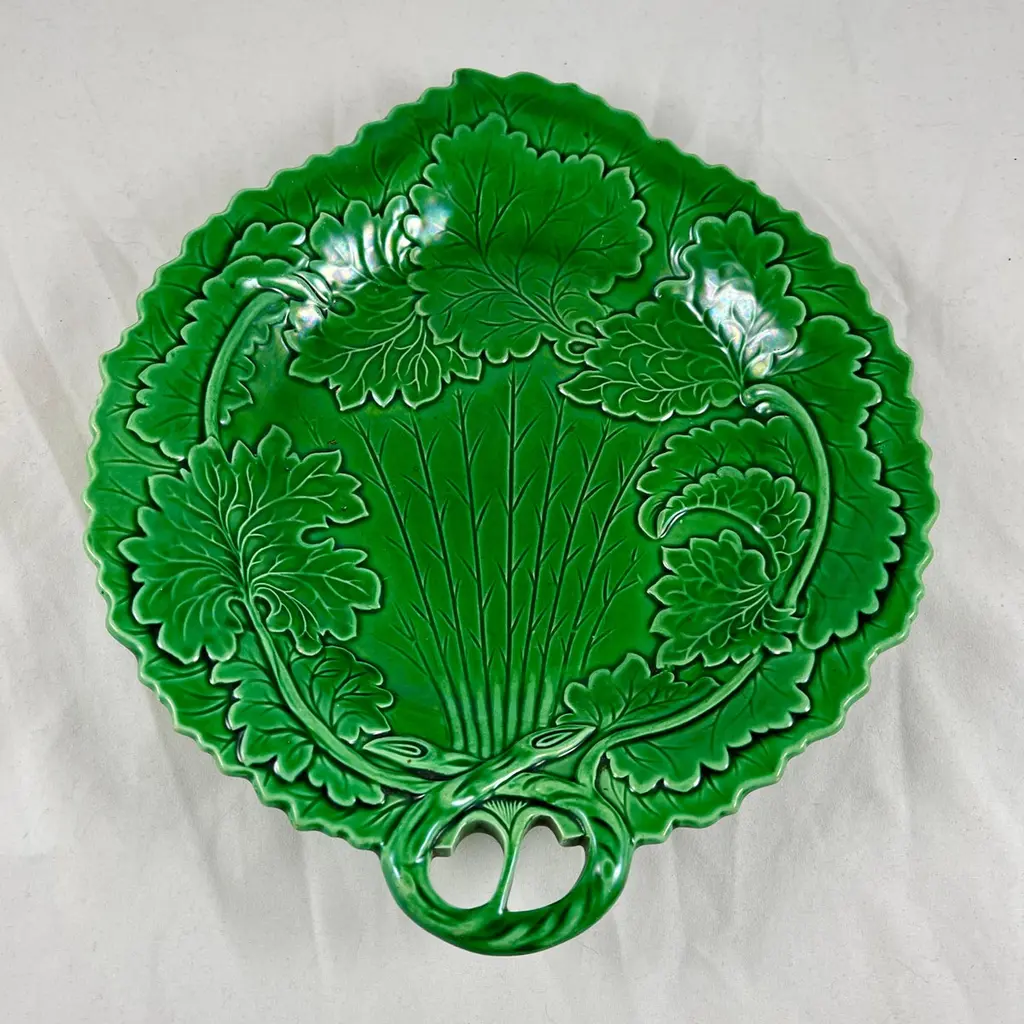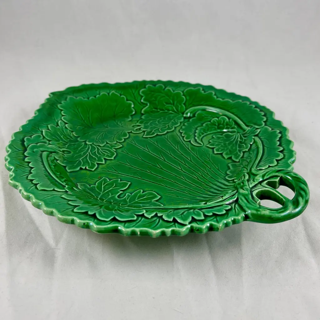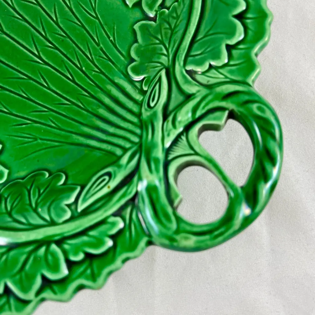 A majolica green glazed leaf pattern server, England, circa 1880.A serrate edged leaf shaped platter with an open work twig form handle. Beautiful mold work showing smaller branching leaves following the oval form of a single large leaf. Deep incised veining is shown on the main large leaf.A deep green glazing pools into the recesses of the complex mold work.Measures: 10.25 in. L x 9 in. W x 1.25 in. HMaker unknown, stilt marks evident on the verso, a kiln effect.Multiple platters are available, in incredible condition.