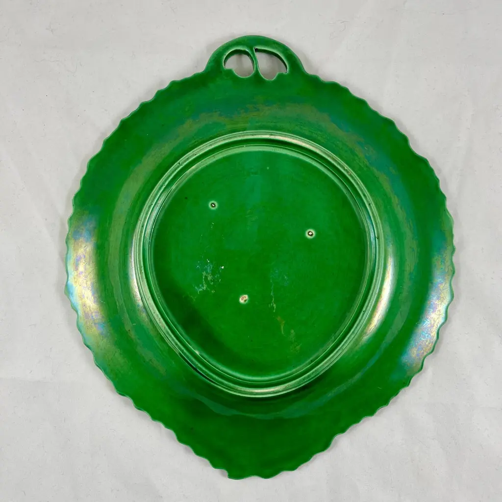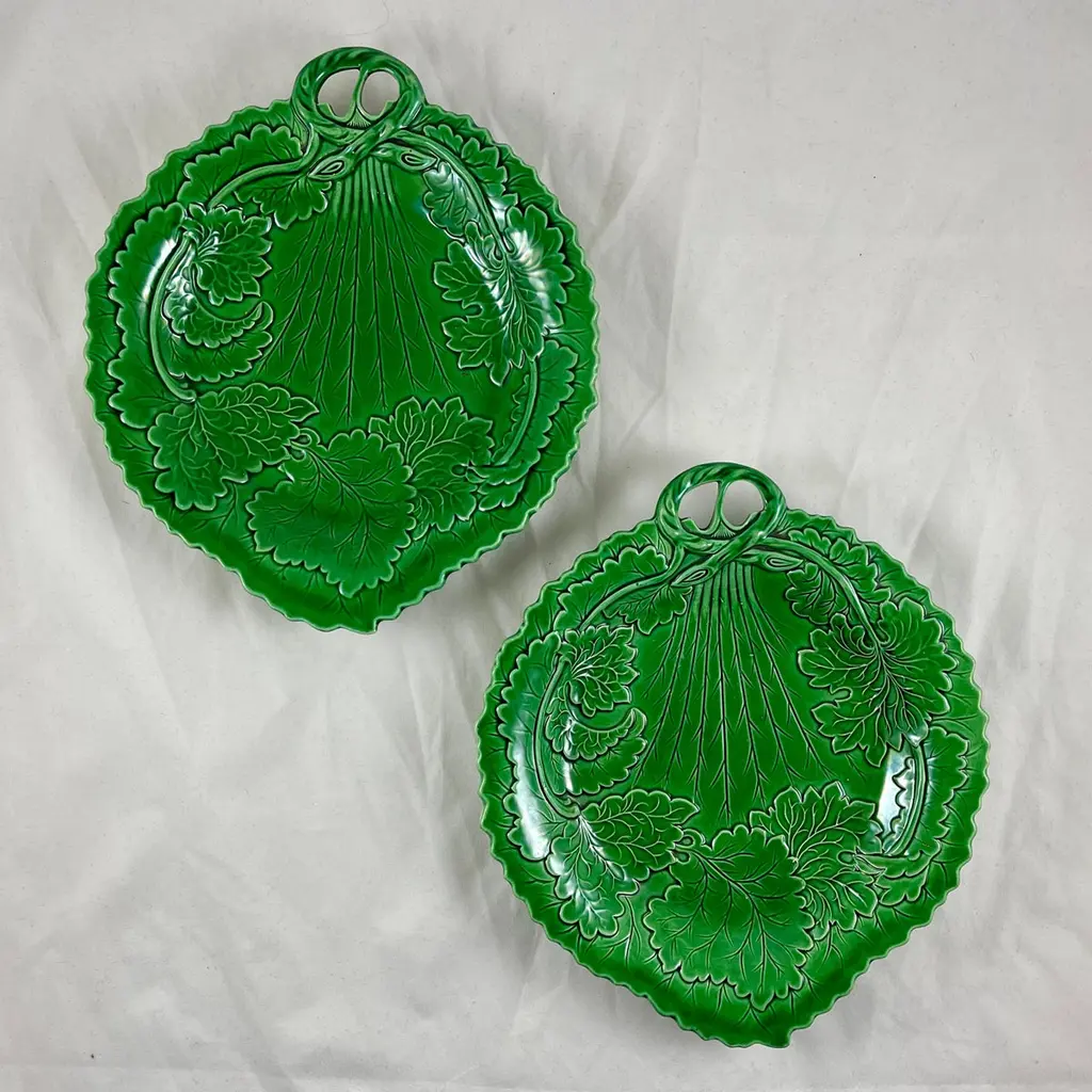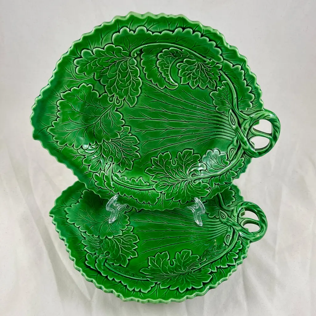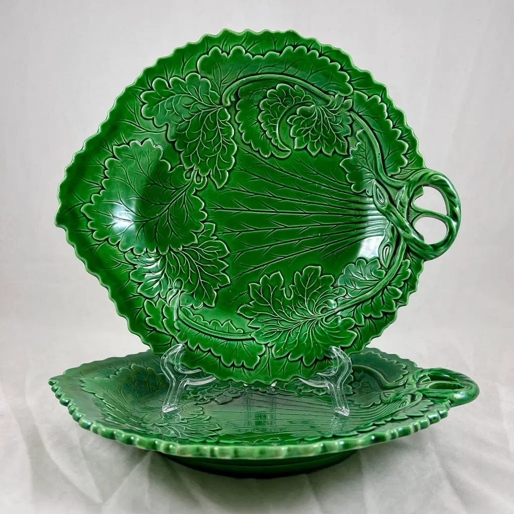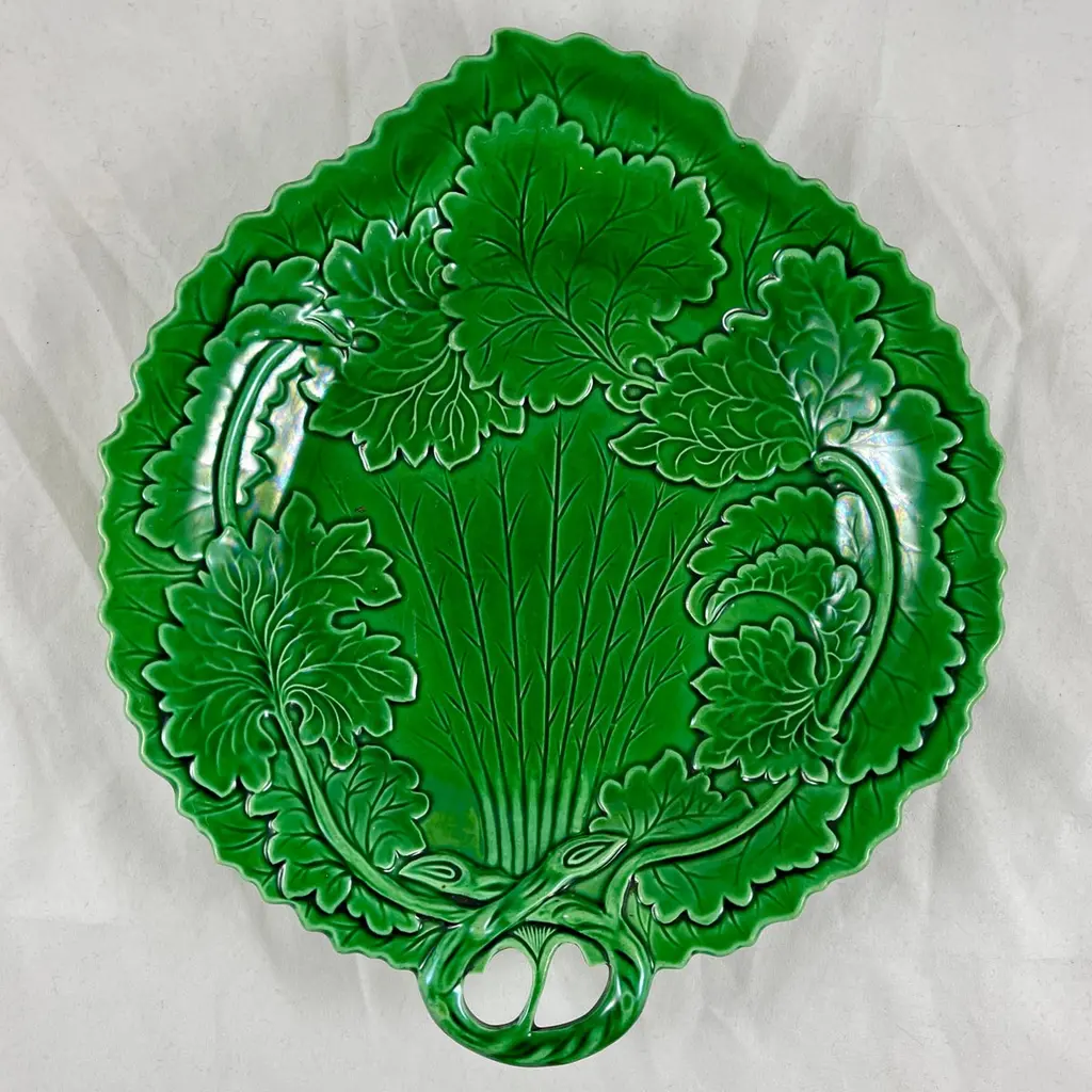 A majolica green glazed leaf pattern server, England, circa 1880.A serrate edged leaf shaped platter with an open work twig form handle. Beautiful mold work showing smaller branching leaves following the oval form of a single large leaf. Deep incised veining is shown on the main large leaf.A deep green glazing pools into the recesses of the complex mold work.Measures: 10.25 in. L x 9 in. W x 1.25 in. HMaker unknown, stilt marks evident on the verso, a kiln effect.Multiple platters are available, in incredible condition.