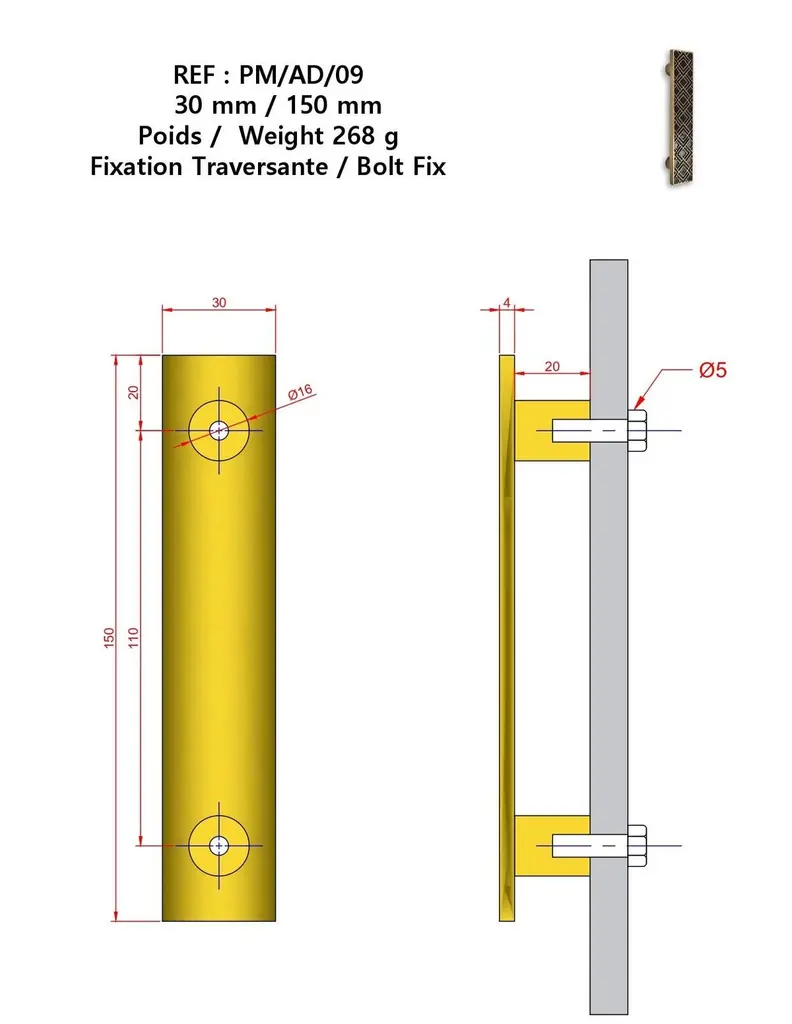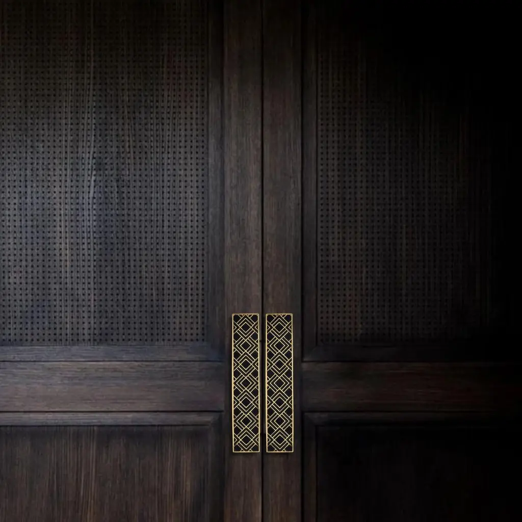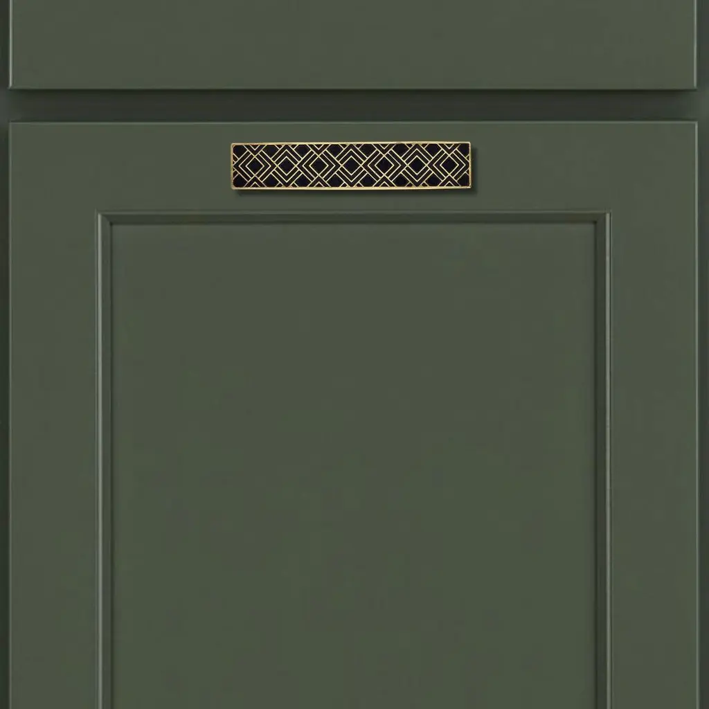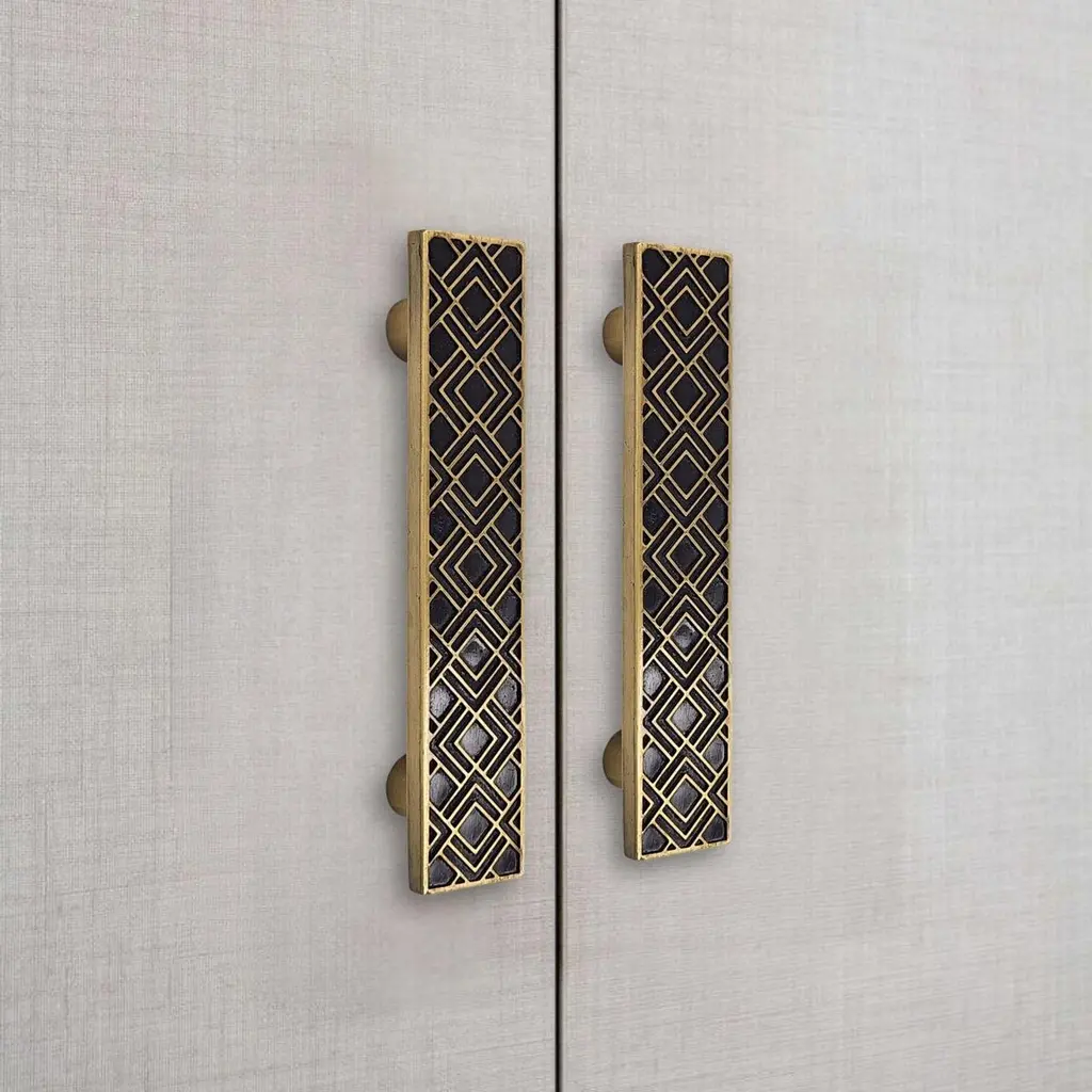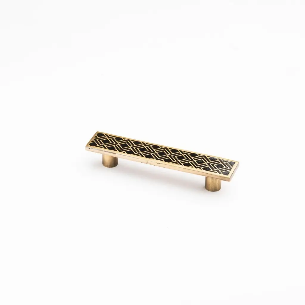 Use: Indoor This rectangular cabinet pull is crafted from solid brass using a traditional engraving process. The precise pattern draws inspiration from Art Deco ornamentation, featuring geometric lines that are carefully hand-filled with black resin. The contrast between material and tone enhances the clarity of the design and the refinement of the motif.The brass is finished with an aged gold patina that highlights the relief while maintaining a sharp reading of the pattern. Measuring 15 cm by 3 cm, the piece can be mounted either vertically or horizontally on doors, drawers, or cabinet fronts.It features a through-mount installation for secure and lasting attachment. Due to the handcrafted nature of the production, each piece may show subtle variations that underline its artisanal character. This drawer pull combines graphic appeal with durable quality, adding elegance to furniture with subtlety.note: Differences from the sample/photo provided should not be considered manufacturing defects, but rather a characteristic of the manual process, which may result in variations in color and uniformity.Brass is a living material that gradually develops a patina over the years.