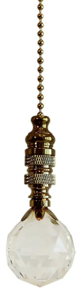 A new ceiling fan pull is the perfect way to complete your new or favorite ceiling fan. Quality fan pull that is sure to dress up your tired ceiling fan. All Home Concept fan pulls have a protective lacquer coating to prevent tarnishing or discoloration. Fan pull has a beaded metal chain, compatible with most ceiling fans. Chain measures 12" length (and can be cut shorter), 2.75" height and 1.5" width. Fan pull measures2" height and 1.25" width. Material: Faceted Crystal finish with Polished Brass Metal Chain.BALL SHAPED - 2" height x 1.25" width ball lamp finial with a 12" chain. A perfect sphere to customize your ceiling fan.FACETED CRYSTAL FINISH - Faceted Crystal finish will match most lamps.PERFECT SIZE - Proportional sized to fit most standard ceiling fans. Finial measures 2" Height and 1.25" width. Threaded at 1/4" wide opening, threaded for standard 27 threads per inch.FUNCTIONAL - Extends your ceiling fan on/off switch and upgrades its style.EASY TO USE - Simple snap the chain into your existing ball-chain connector on your fan. 12" ball chain can be cut shorter if desired.