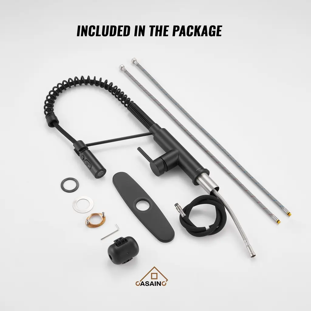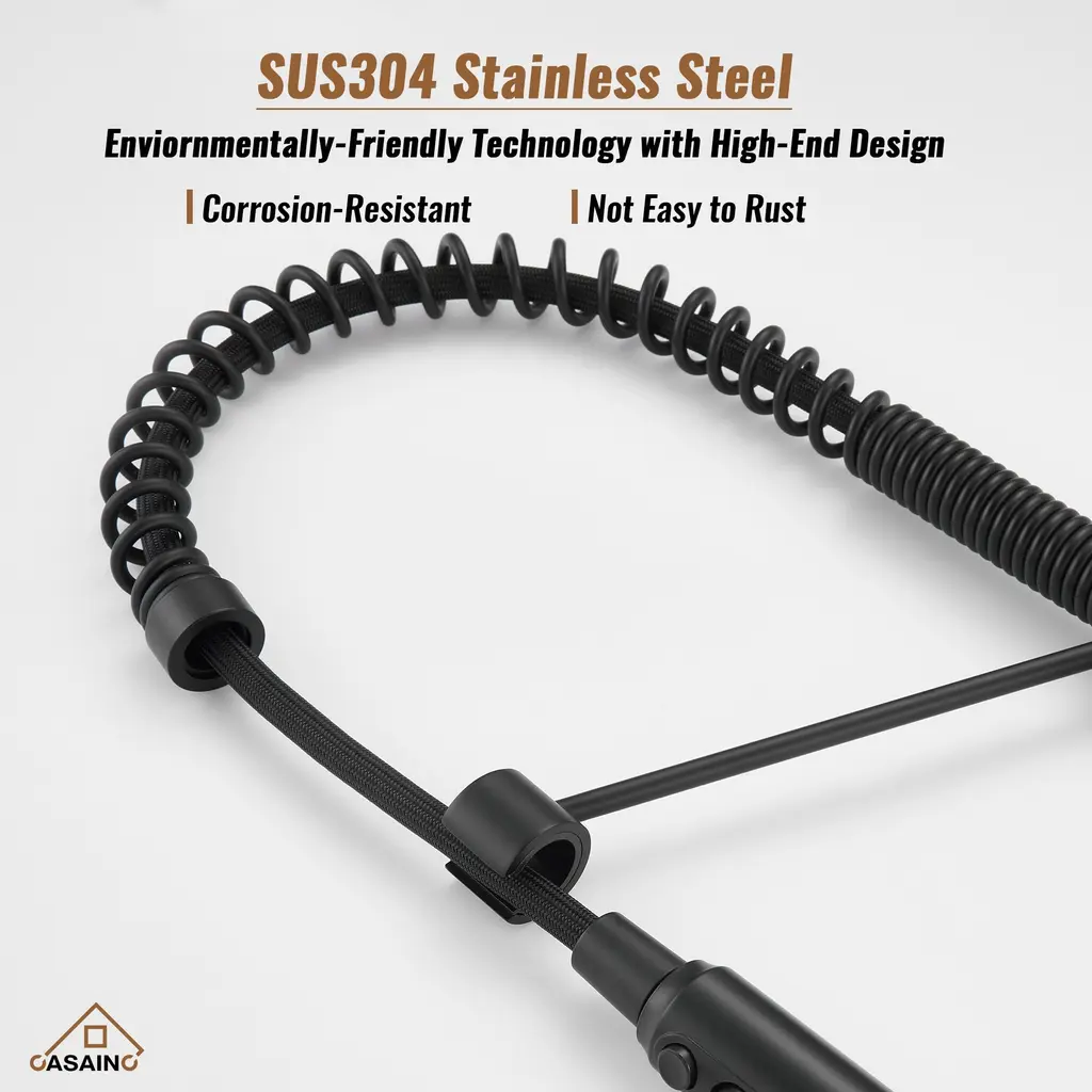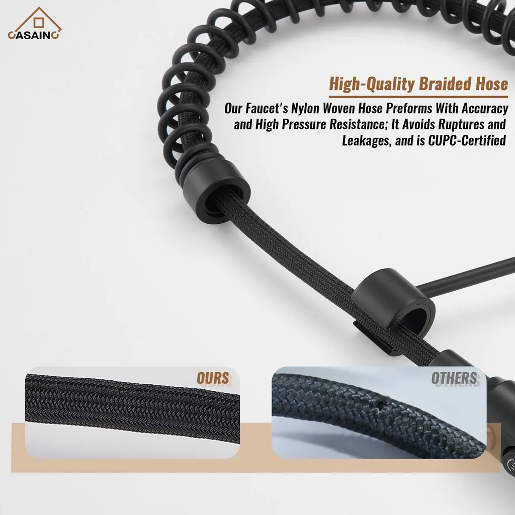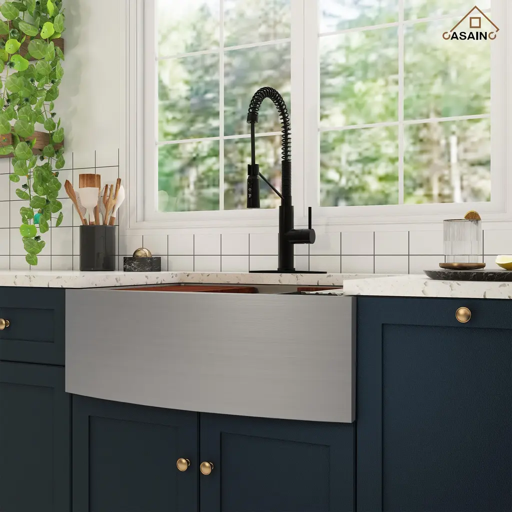 Elevate your kitchen with the CASAINC Kitchen Sink and Faucet Combo, featuring a convenient pull-down sprayer faucet and a sink equipped with a cutting board, colander, roll mat, drainer, and bottom grid - the perfect complement to any kitchen style. Constructed from premium 304 stainless steel, renowned for its corrosion resistance and durability, the sink ensures long-lasting quality. Its 10R round corners facilitate easy cleaning and prevent residue buildup. The classic appeal of the stainless-steel sink, paired with the high-performance faucet, not only enhances your kitchen's aesthetics but also streamlines your culinary tasks, providing an all-in-one solution for your cooking needs.✔The 304 stainless steel, enhanced with a brushed surface treatment, is designed to resist scratches and oil, ensuring durability and longevity✔This farmhouse apron workstation kitchen sink features a unique design that allows the included accessories to slide left and right along a track; it comes with a cutting board, a draining basket, and a rolling drying rack, all designed to glide effortlessly over the counter, making them incredibly convenient to use✔The sink is designed with a scientific X-shaped guideline that ensures effective drainage, preventing water from accumulating inside the sink✔This faucet offers three settings to suit various needs: STREAM for everyday cleaning, SPRAY for splash-free rinsing, and DOUBLE BLADE for tackling large areas and tough stains✔The sink faucet features a cUPC-certified ceramic valve core and has undergone extensive testing, ensuring its longevity and durability✔This kitchen sink faucet is both fingerprint-resistant and spot-resistant, making it a breeze to maintain and keep clean✔The kitchen faucets come with an included deck plate, allowing for versatile installation options, whether you prefer a 1 or 3-hole setup