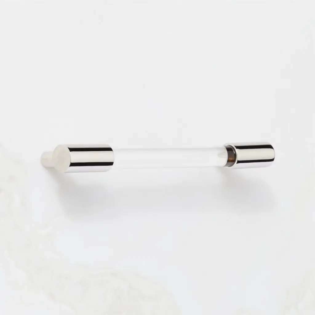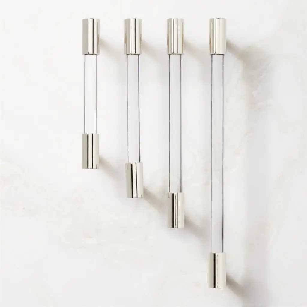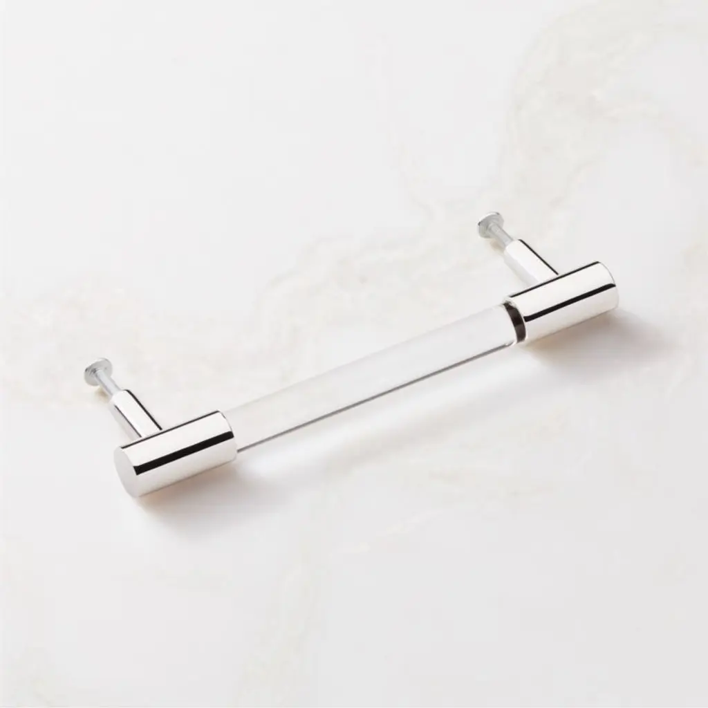 Framed by polished nickel hardware, crystal adds a feminine touch to this elegant handle. Pairs with the Flynn knobs for a cohesive look. CB2 exclusive.