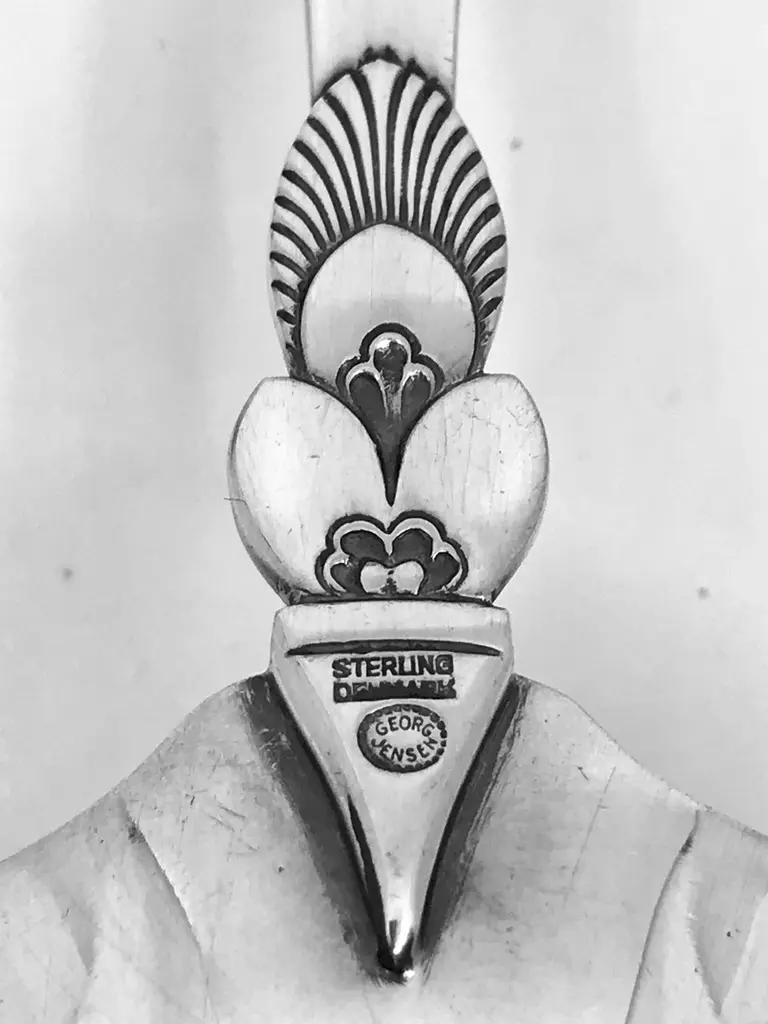 Sterling silver Georg Jensen gravy ladle with curved handle, item 153 in the Cactus pattern, design #30 by Gundorph Albertus from 1930.Additional information:Material: Sterling silveStyle: Art DecoHallmarks: With Georg Jensen hallmark, made in Denmark.Dimension: Measures 7 1/4″ (18.5cm) in length.Condition: Excellent vintage condition