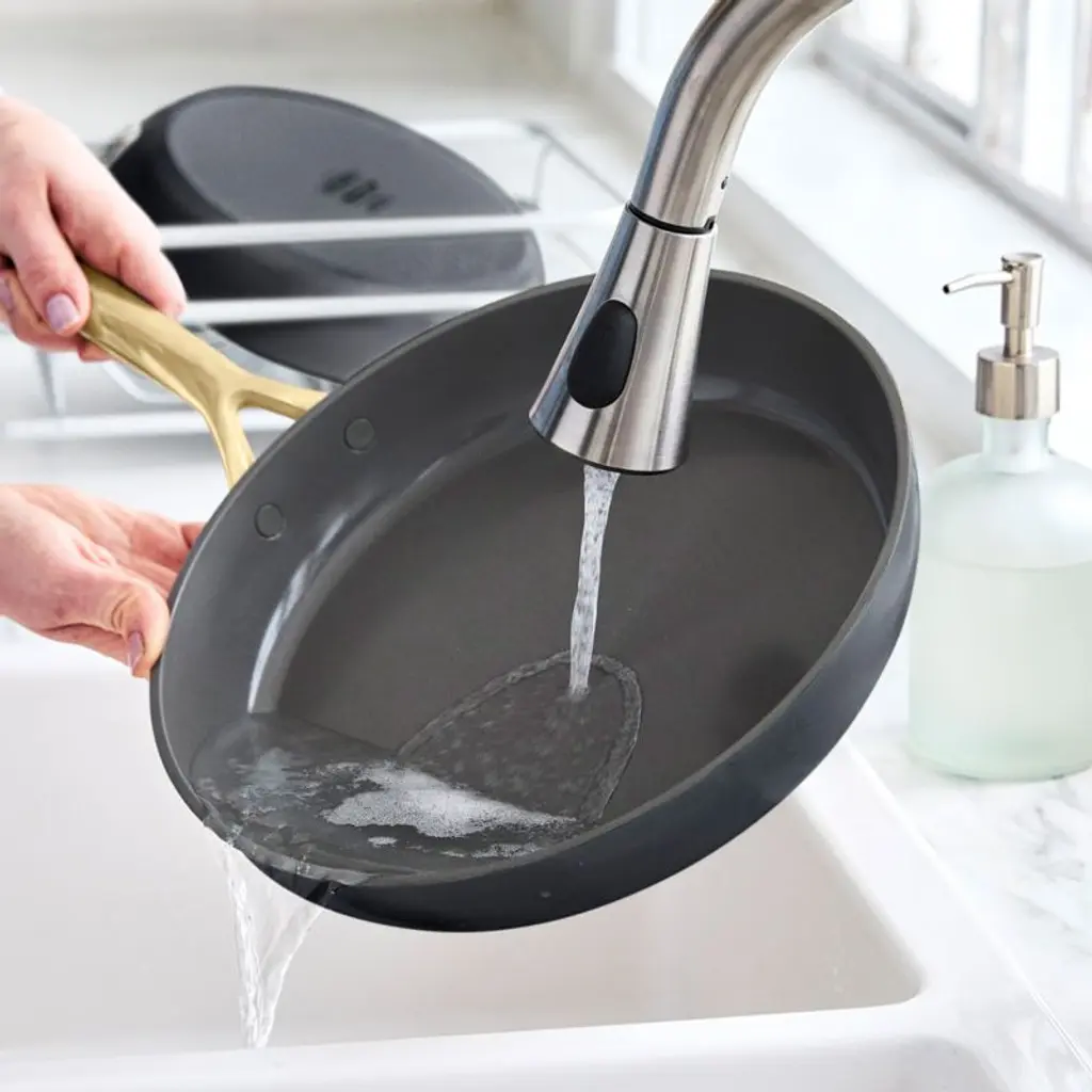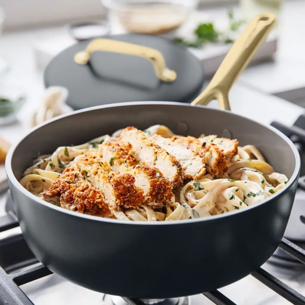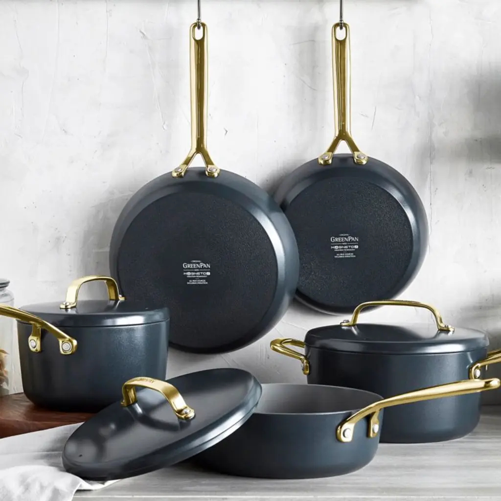 GreenPan's new advanced ceramic non-stick cookware represents 15 years of innovation. This versatile GP5 cookware set fries, sears, simmers, stews, bakes and more. Infused with diamonds, the multilayer ceramic non-stick coating stands up to metal utensils, high heat, dishwashers and daily use. Heavy-gauge aluminum bases heat evenly, flexing to keep the pans flat so cooking oils don't pool. Fitted with champagne gold-finished handles that stay cooland look glamon the stovetop, the slate grey pans go from kitchen to table for a beautiful presentation.