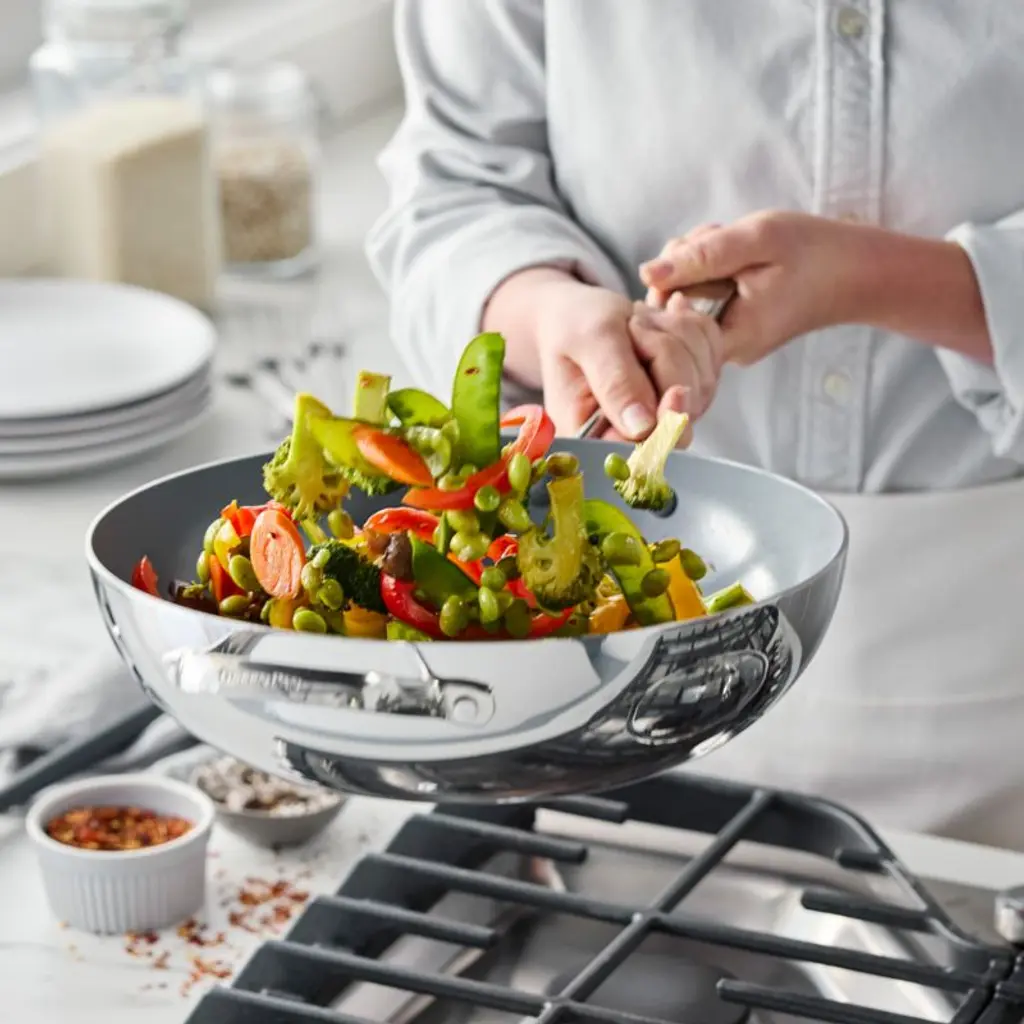 Stylish and durable, this multi-layer stainless steel wok is coated with a patented ceramic non-stick coating that heats effectively to sear and brown beautifully. The pale grey finish stands up to metal utensils and is reinforced along the rim to prevent chipping. Polished to a mirror finish, the exterior and handles shine on the stove, table or pot rack. The glass lid seals in heat and moisture for effective steaming and braising. This gently sloped wok ably stir-fries, poaches and deep fries, pairing with the rest of GreenPan's Valencia Pro cookware collection for a well-rounded kitchen.