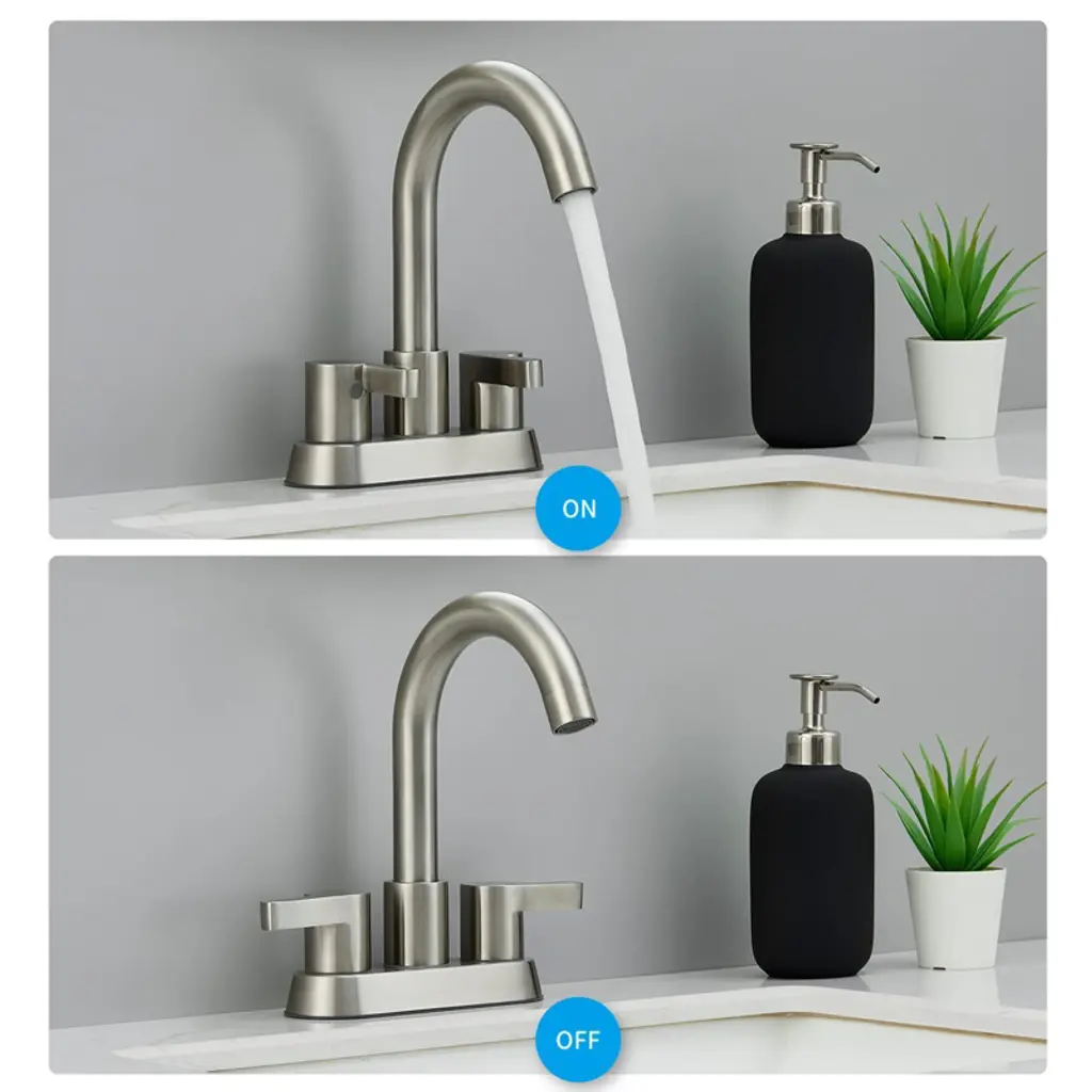 Elevate your bathroom with the Gulches Brushed Nickel Centerset Faucet. Crafted from high-quality 304 stainless steel, this faucet features a fingerprint-free finish and a lead-free waterway for safe use. The 360° swivel spout and double handles provide precise control over water temperature and flow. With easy installation and included pop-up drain assembly, this faucet is perfect for any bathroom design, combining style and functionality effortlessly.