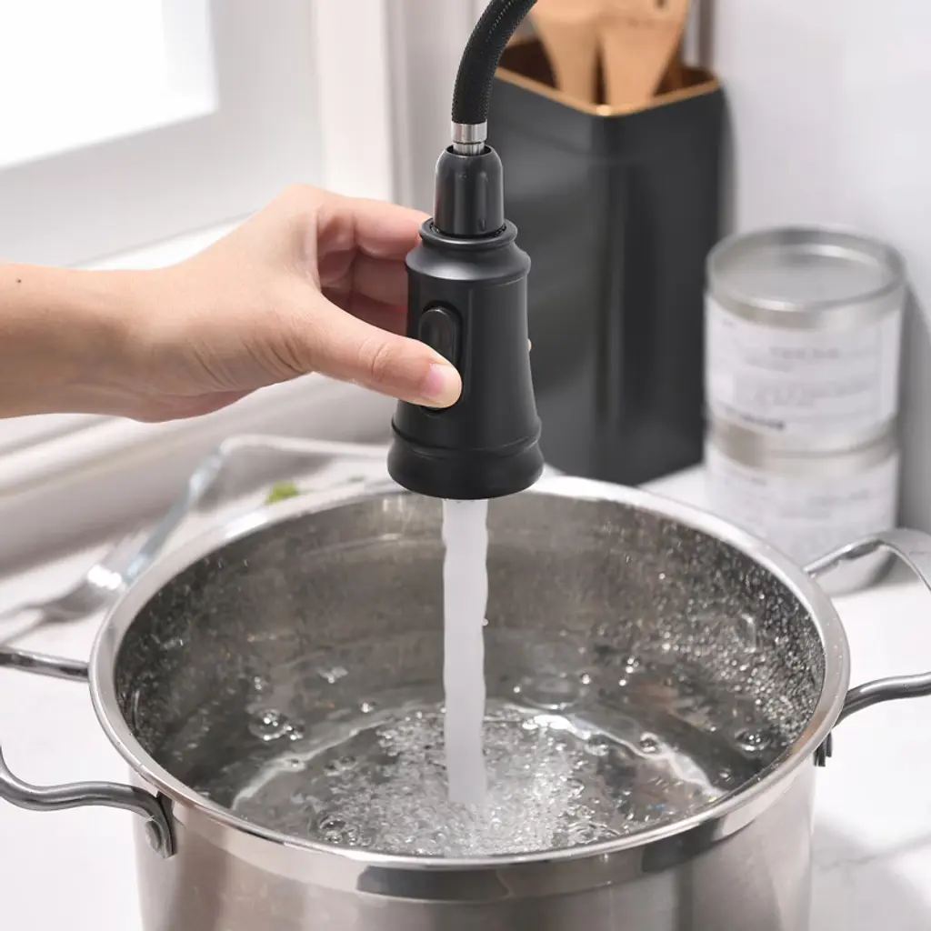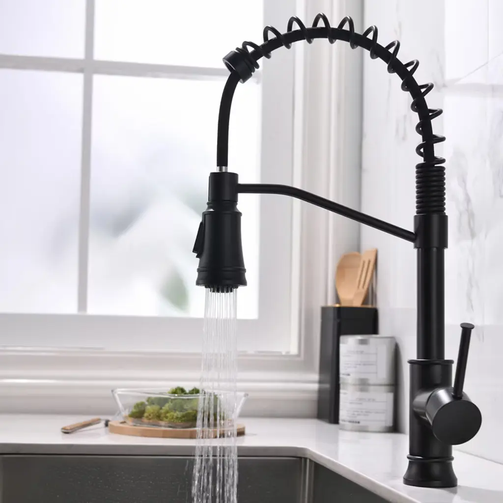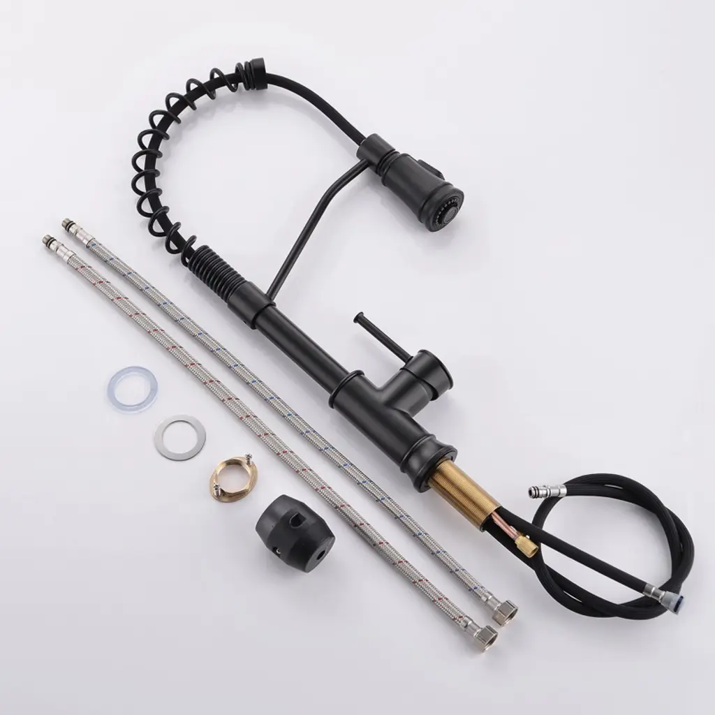 [RELIABLE QUALITY]: The kitchen faucet is made of solid brass construction inside, durable and lead-free for greater safety. Provide you with clean kitchen water at all times. Black coating on the surface, simple and beautiful, not easy to rust or dirty. [TWO ROTATABLE SPOUTS]: The kitchen faucet with pull out sprayer provides splash-free powerful spray to rinse dirt from dishes. The injected spout also allows 360¡ã of rotation to provide a soft aerated stream of water for easy filling of pots and pans. These two spouts could open at the same time and you can save more time.Single Handle:The water flow and temperature can be easily adjusted to the right level with the single handle. The faucet body can 360¡ã rotated, so you can install the handle in any position. These will give you a more enjoyable use experience. Perhaps you have never found that your kitchen can be so wonderful.