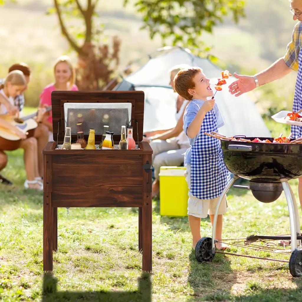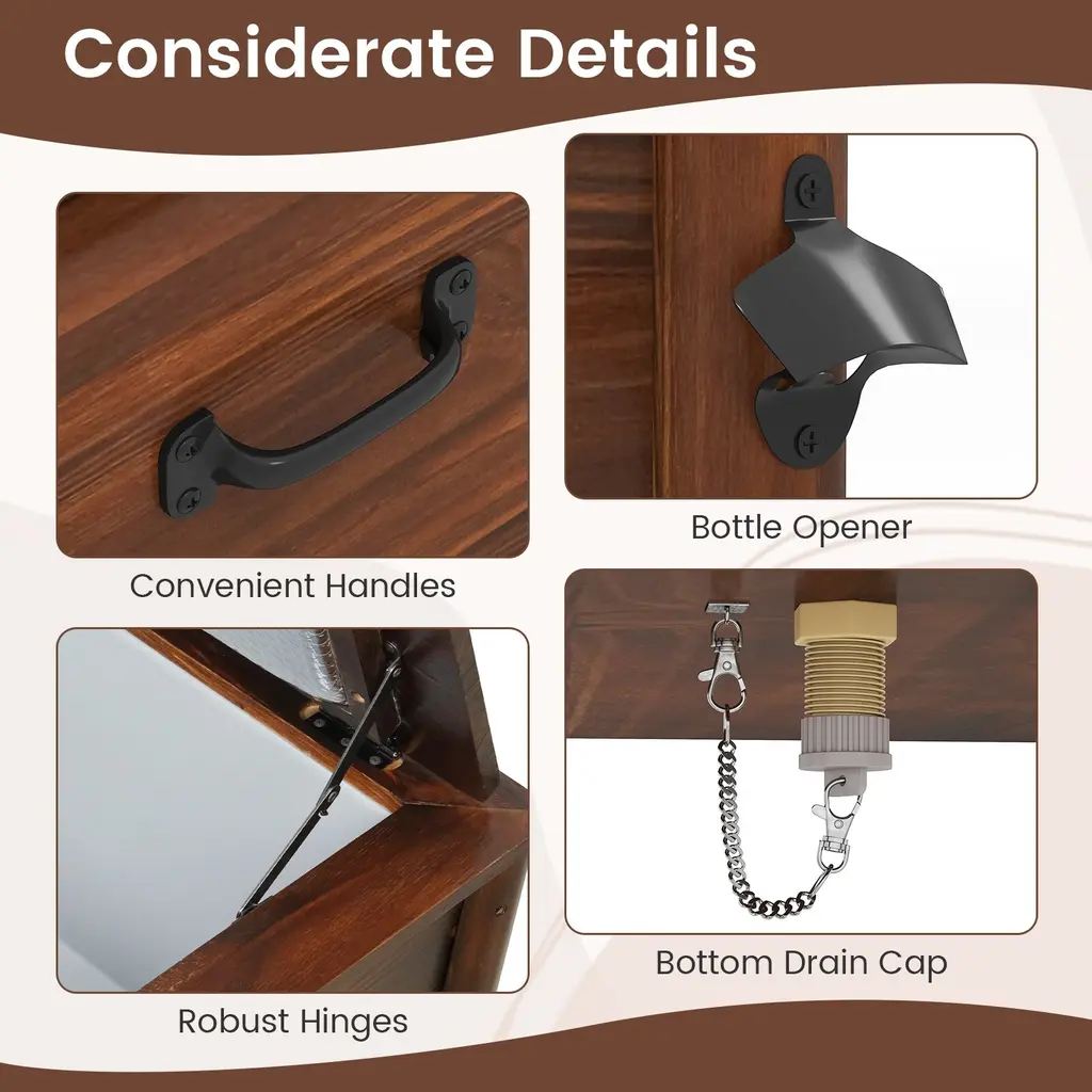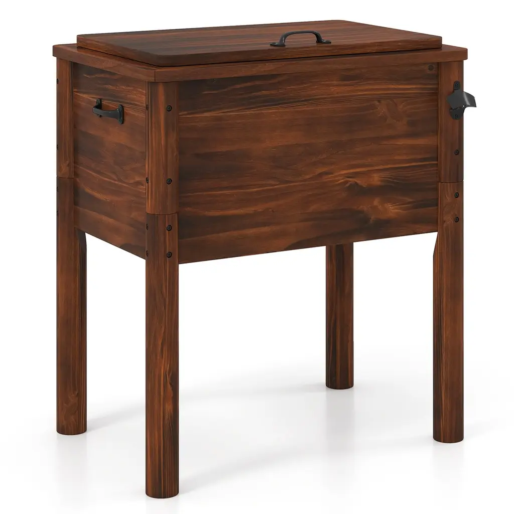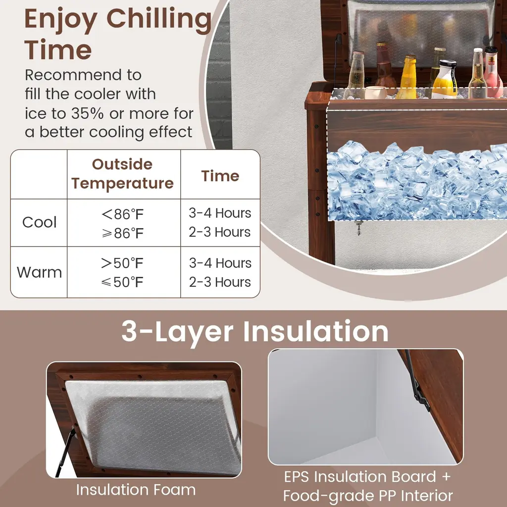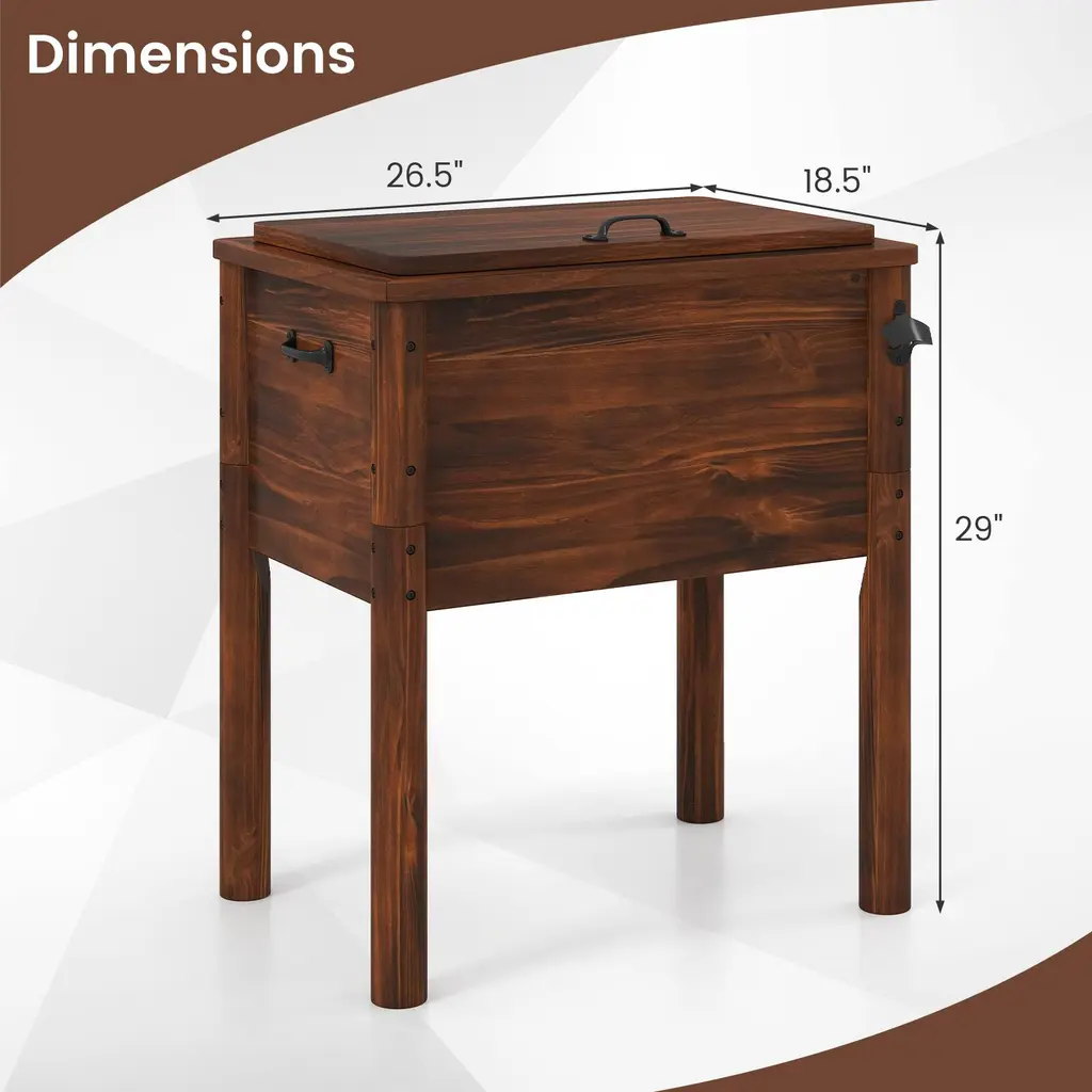 Elevate your outdoor gatherings with this wooden cooler. Engineered with exceptional insulation, this ice chest keeps drinks chilled or food warm for hours. The 54-quart capacity allows for storing up to 72 cans, perfect for parties. Crafted from solid pine wood with high-temperature treatment, it offers durability and weather resistance. Convenient features include a bottle opener, and side handles for portability. Recommended to fill the box with ice to 35% or more to achieve below effect.Features:54 quart large capacity for storing up to 72 cans (320 ml/can) Designed with 3-layer insulation structure Made of solid pine wood for stability and longevityColor: Brown Material: Pine Wood, PP, EPS Overall Dimension: 26.5'' x 18.5'' x 29'' (L x W x H) Internal Dimension: 21'' x 13'' x 12.5'' (L x W x H) Capacity: 54 Quart Holding Time (Cool): 3-4 Hours (<86℉), 2-3 Hours (≥86℉) Holding Time (Warm): 3-4 Hours (>50℉), 2-3 Hours (≤50℉) Net Weight: 29.5 lbs Package Includes: 1 x Wooden Patio Cooler 1 x Instruction