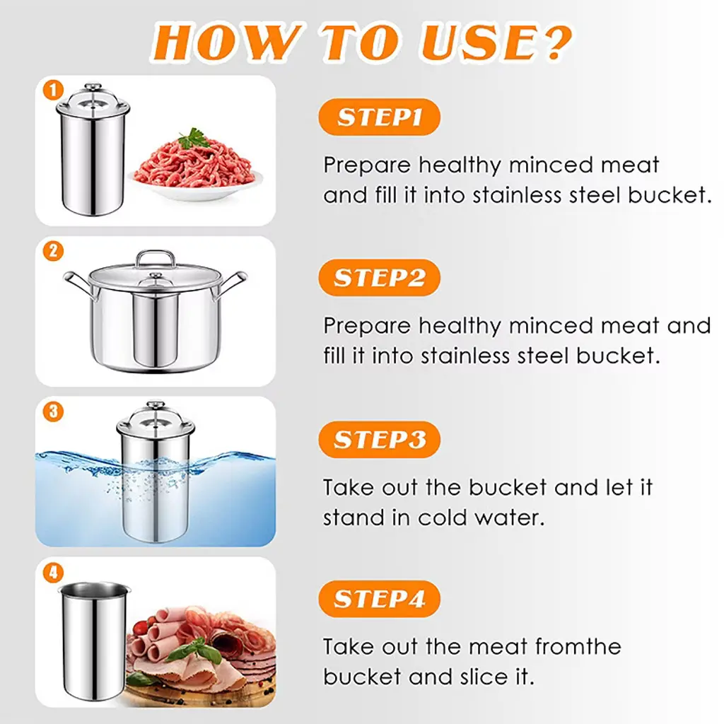 Description: Product Name:Ham Maker Meat Press, Sandwich Lunch Meat Press Maker, Homemade Ham Maker Meat Press Tool with Cooking Thermometer, Stainless Steel Main Color:Silver Main Material:Stainless Steel Style:Sheet handle/Wire handle Packing List:Ham Maker Meat Press, Sandwich Lunch Meat Press Maker, Homemade Ham Maker Meat Press Tool with Cooking Thermometer, Stainless Steel x 1 Note: 1. Due to manual measurement, please allow 1-3cm error. Make sure you don't mind before bidding. 2. Due to the difference of different monitors, the picture may not reflect the actual color of the product. Thanks.