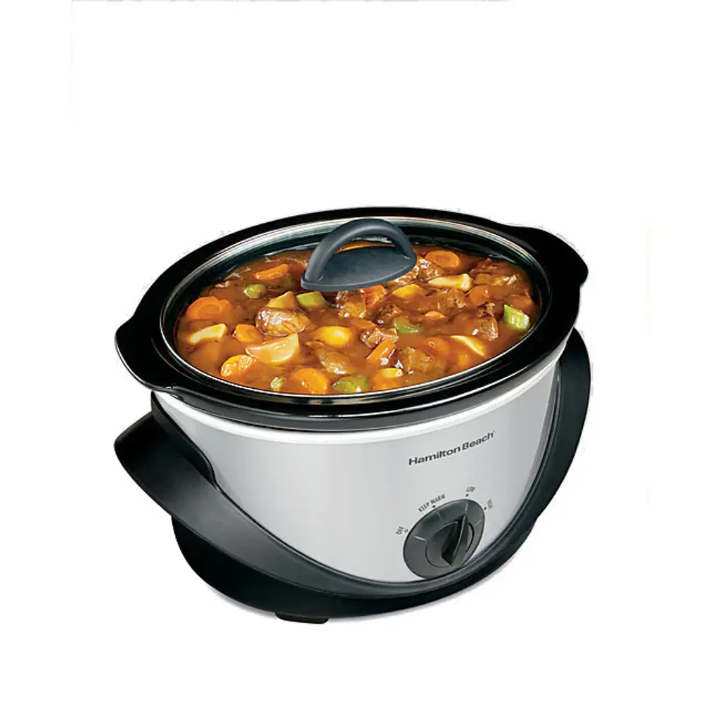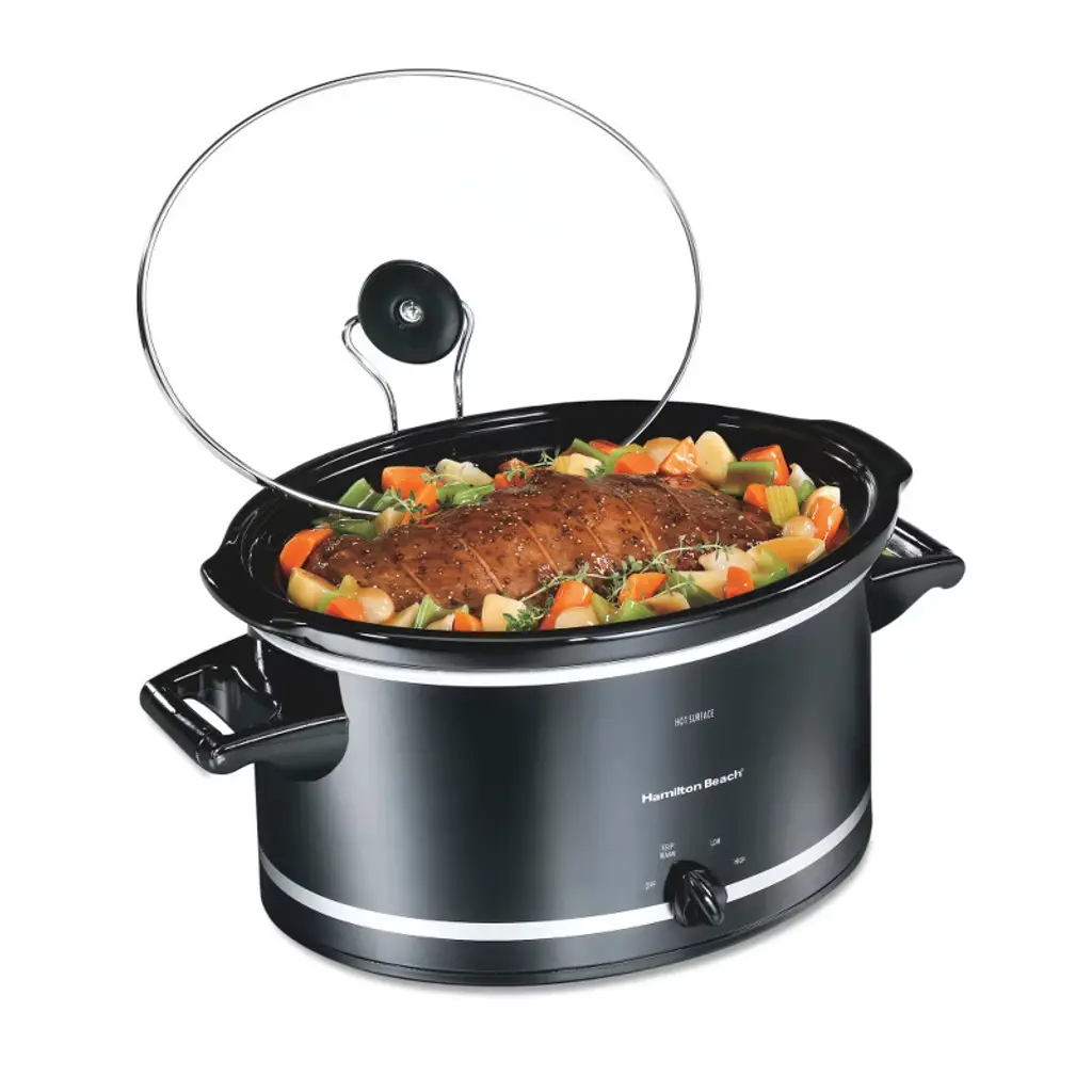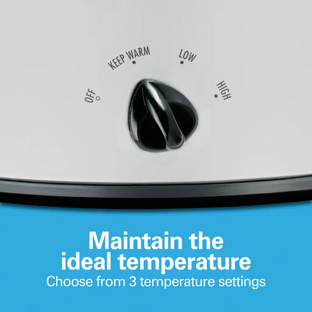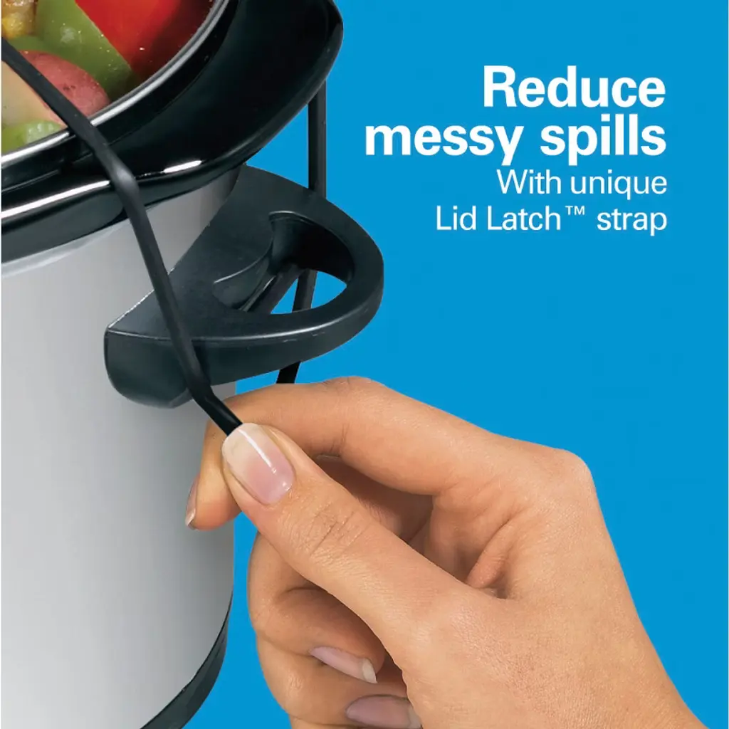 The Hamilton Beach® 7 Quart Portable Slow Cooker has a Lid Latch™ strap that attaches to the slow cooker handles to securely hold the lid in place when carrying meals. Take hot meals to family gatherings, potlucks or serve at the table without worrying about spills. The slow cooker is the perfect size for family meals and serves 8+ people. The stoneware crock fits a variety of foods, from lasagna and desserts to large cuts of meat. It holds a 7 lb. chicken or 5 lb. roast. From chili and stews to savory, slow-cooked meats and rich pasta dishes, you'll easily make delicious, flavorful meals with minimal effort. Simply add your ingredients, turn the dial to choose your heat setting, and let the slow cooker do the rest. You'll get great results whether you're new to cooking or a seasoned home chef. Cook your meal on Low or High, then switch to Keep Warm when cooking is complete to maintain the ideal temperature until you’re ready to eat. The removable stoneware crock and glass lid are dishwasher safe making cleanup a breeze. The brushed silver finish with black accents looks great on the countertop.