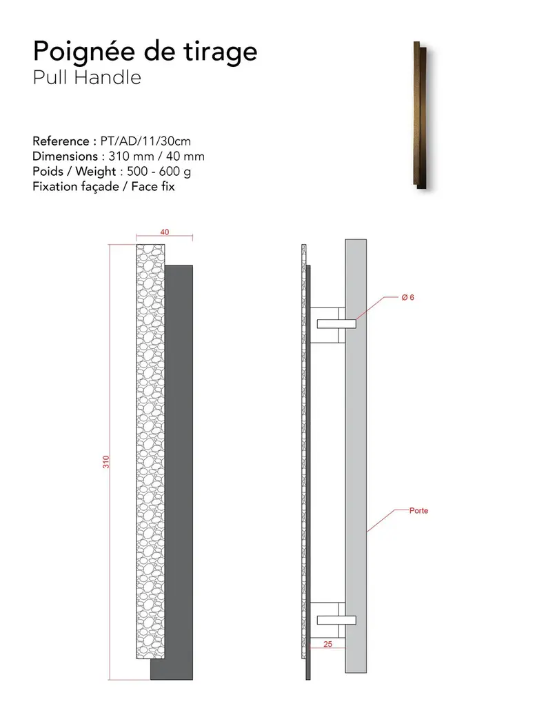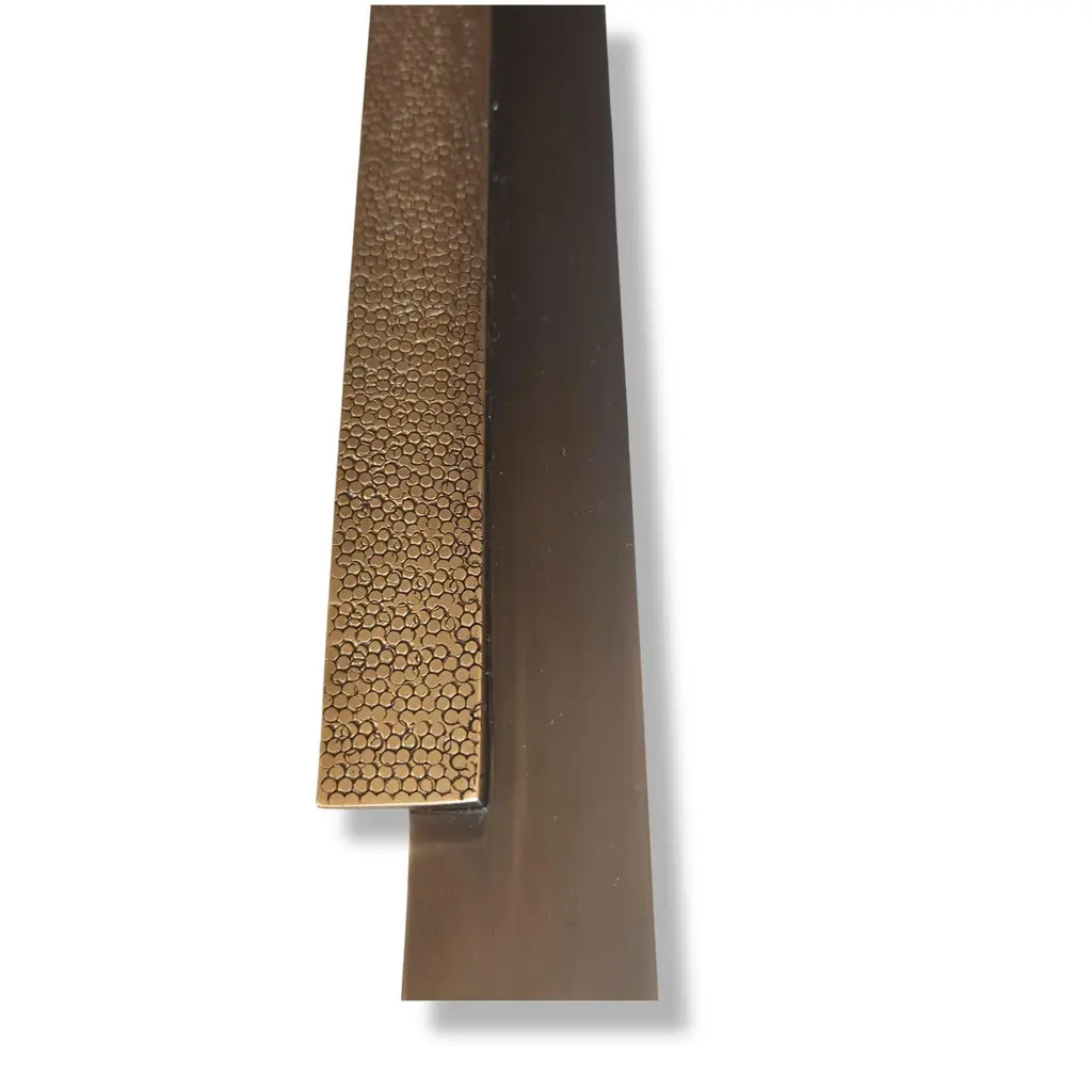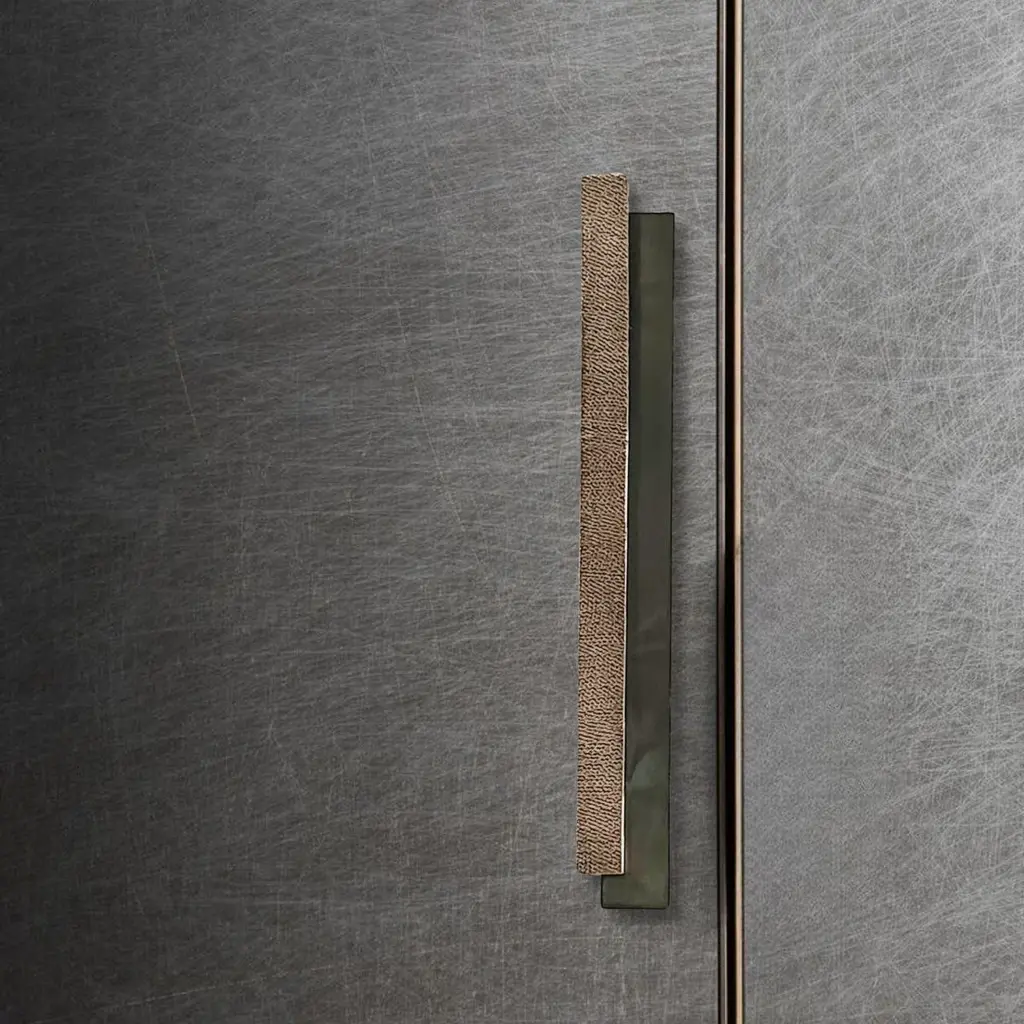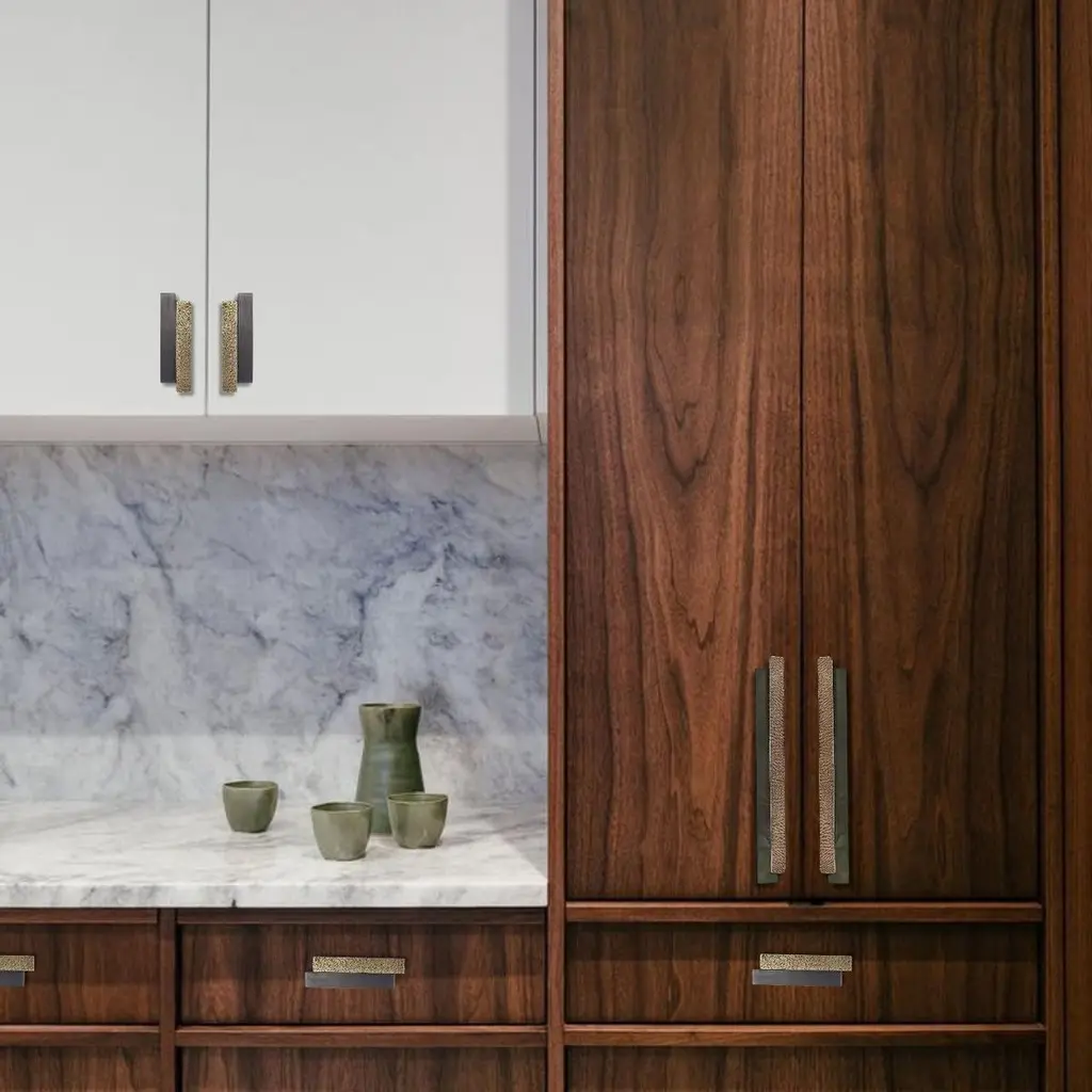 Use: Indoor This brass pull handle, part of the Art Deco collection, blends simplicity and contrast, making it suitable for both doors and furniture pieces. Handcrafted in our workshops, the piece combines two complementary finishes: a hammered brass band with a shagreen effect in an aged gold patina, and a flat plate in gunmetal brass. The interplay of these textures and tones creates a balanced composition, where the subtle warmth of gold contrasts with the depth of the gunmetal.The hammered pattern, with its organic resonance, reflects the graphic language typical of the Art Deco movement while remaining distinctly contemporary. Its slender, linear profile reinforces the piece’s restrained aesthetic.note: Differences from the sample/photo provided should not be considered manufacturing defects, but rather a characteristic of the manual process, which may result in variations in color and uniformity.Brass is a living material that gradually develops a patina over the years.