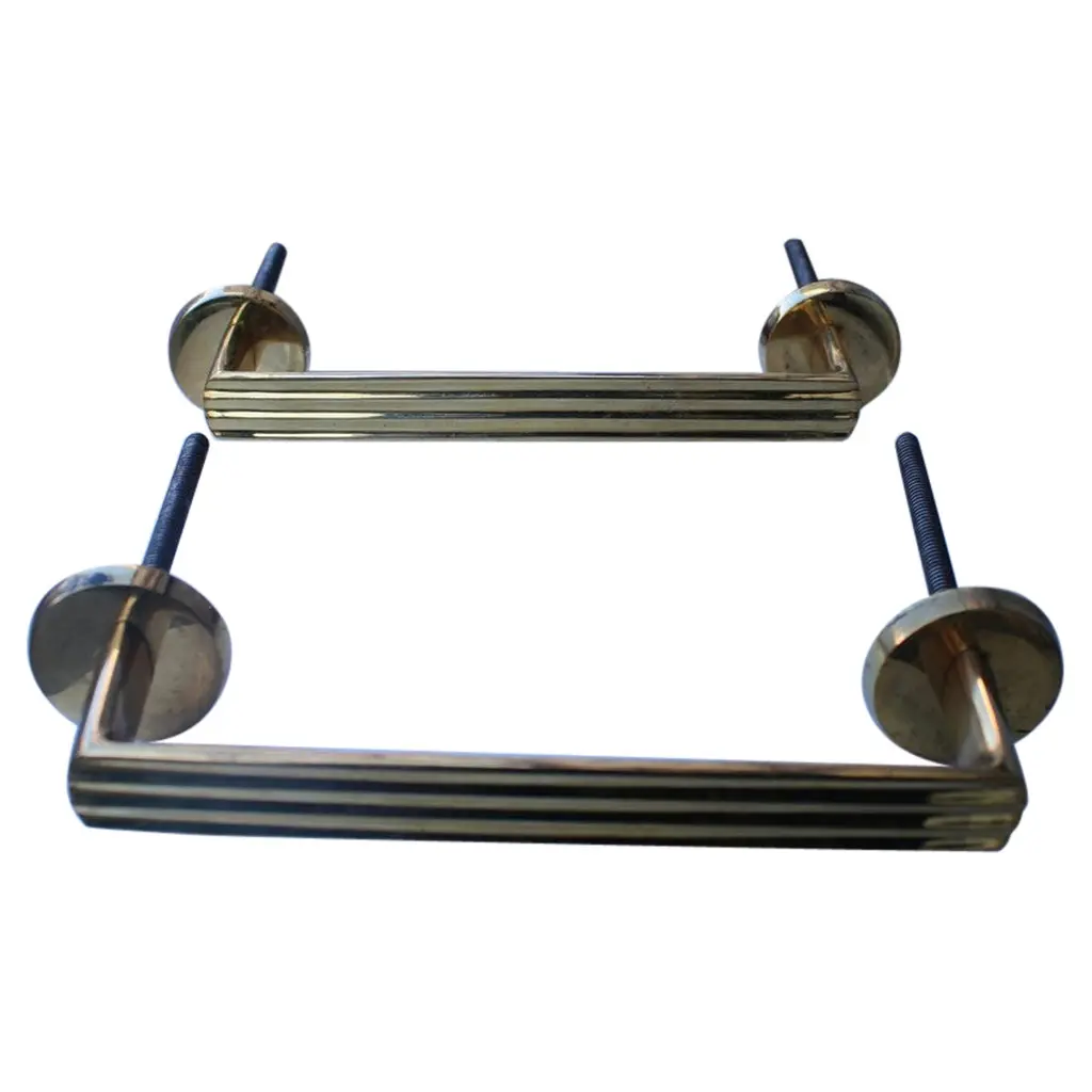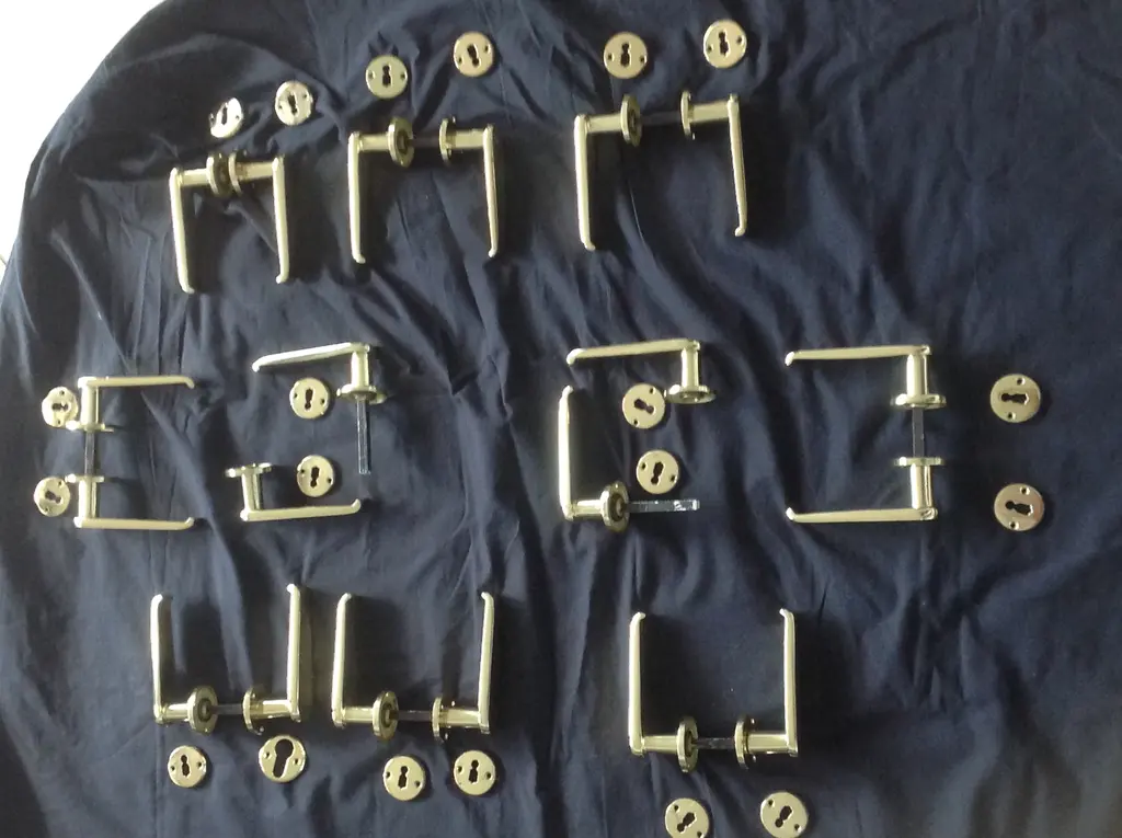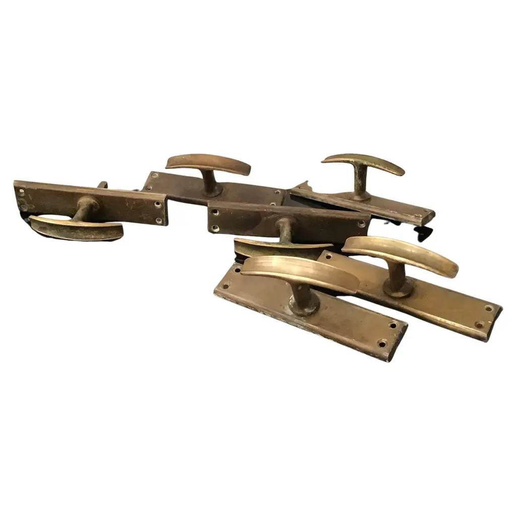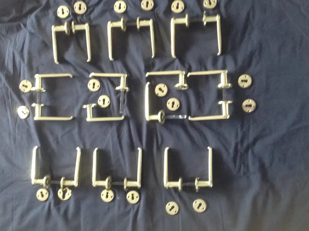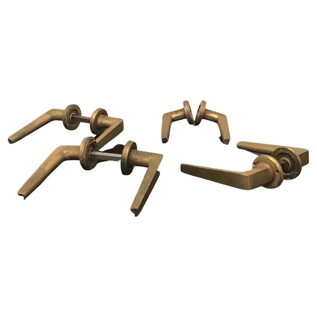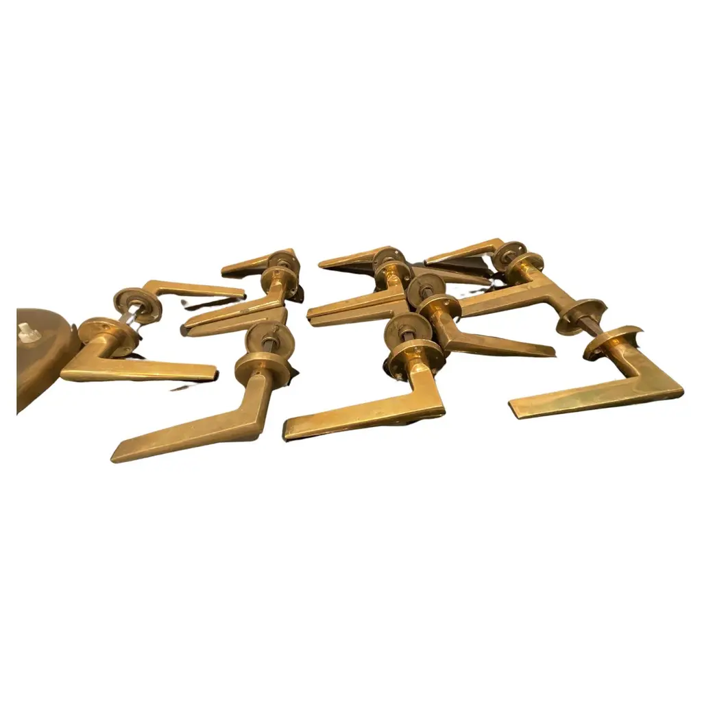 Important set (10) of gilded brass handles, Italian design from the 1950s. Each set consists of 2 handles and 2 keyholes. Handle size: Length 12 cm, height 3 cm, depth 0.8 cm. Keyhole diameter 3.9 cm. Each brass part of the set has been polished and treated with an antioxidant by then baking in the oven.