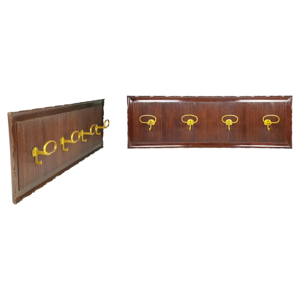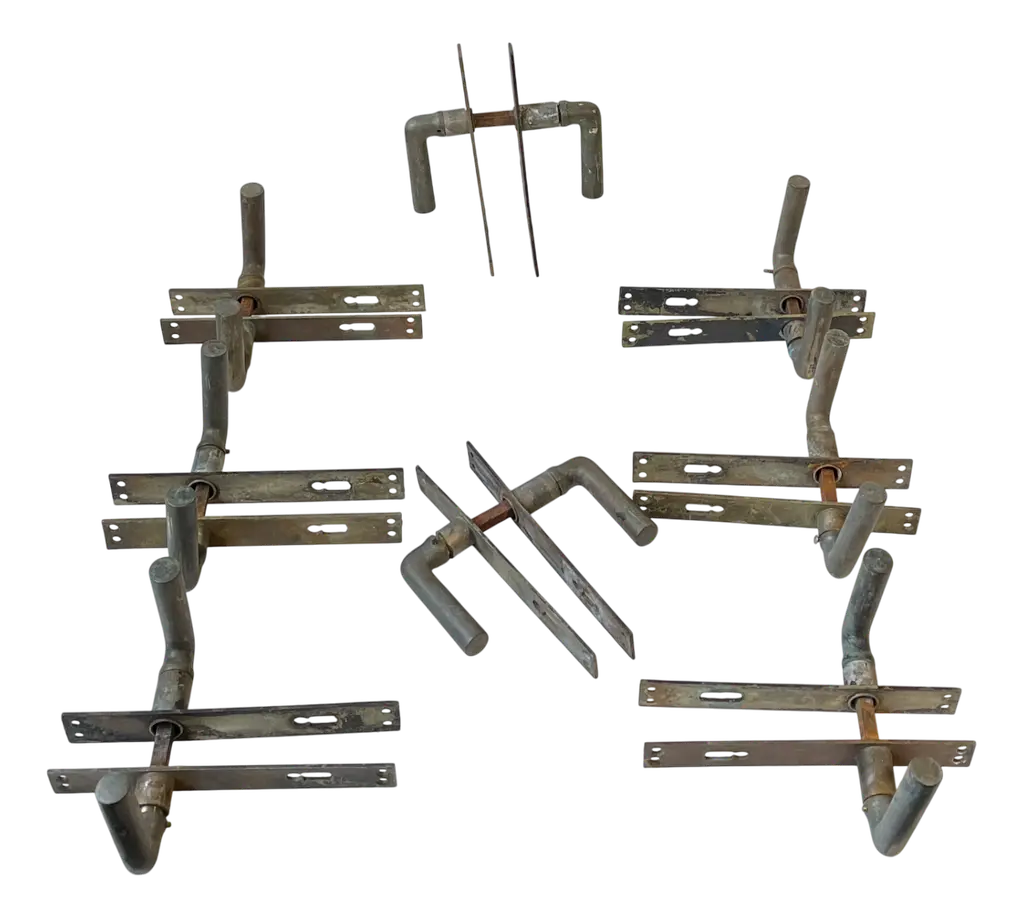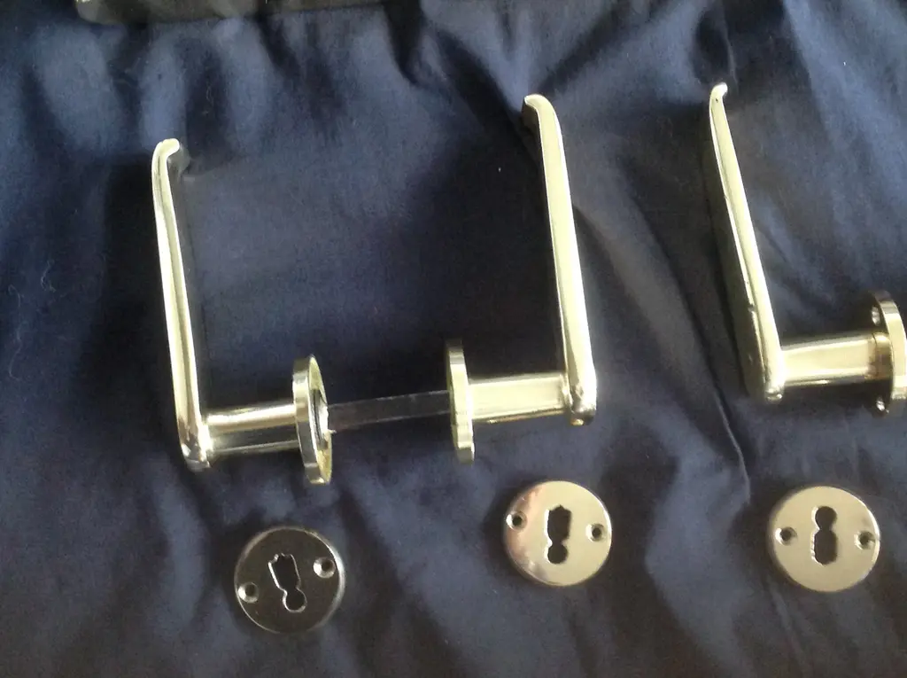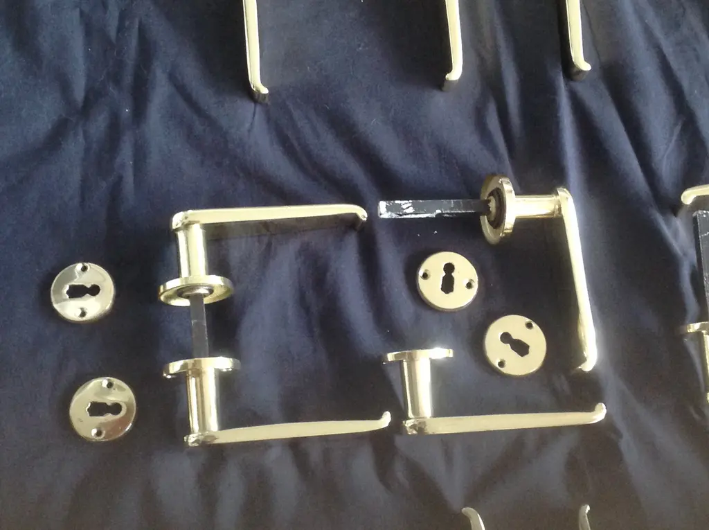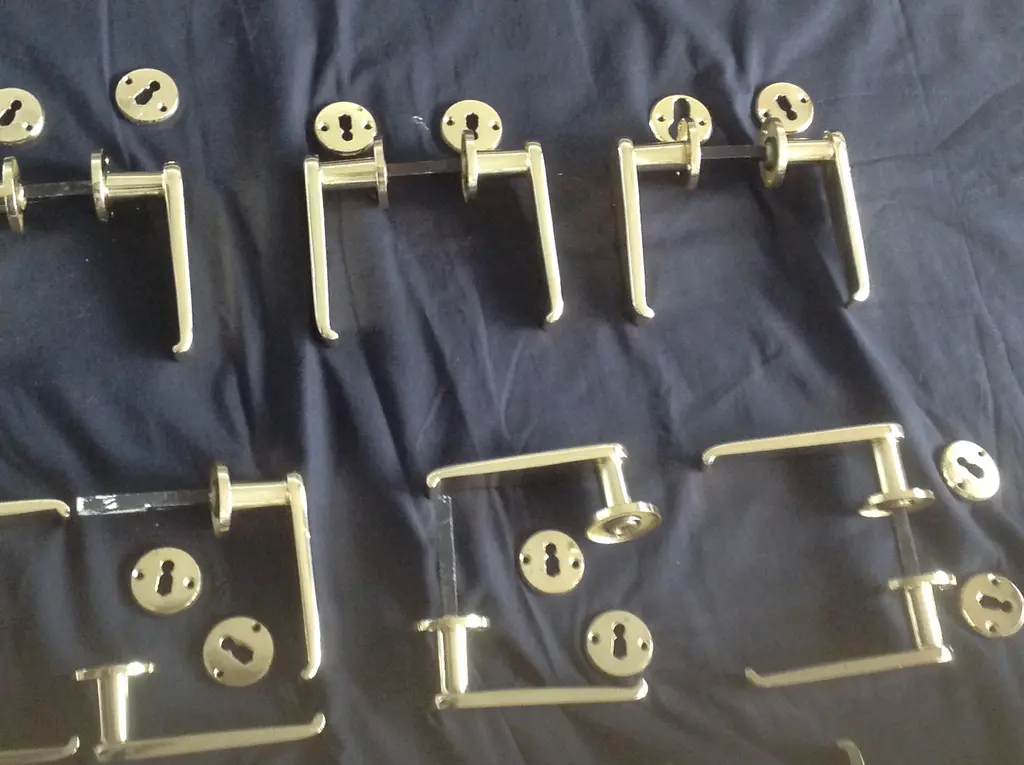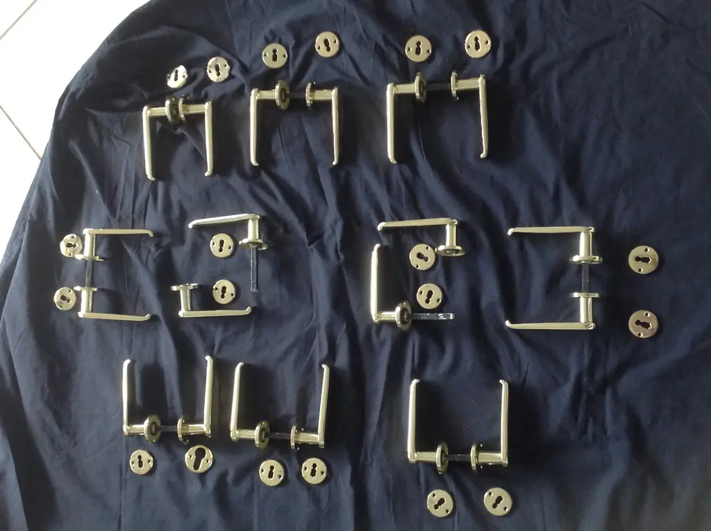 Important set (10) of gilded brass handles, Italian design from the 1950s. Each set consists of 2 handles and 2 keyholes. Handle size: Length 12 cm, height 3 cm, depth 0.8 cm. Keyhole diameter 3.9 cm. Each brass part of the set has been polished and treated with an antioxidant by then baking in the oven.