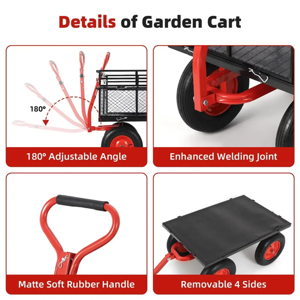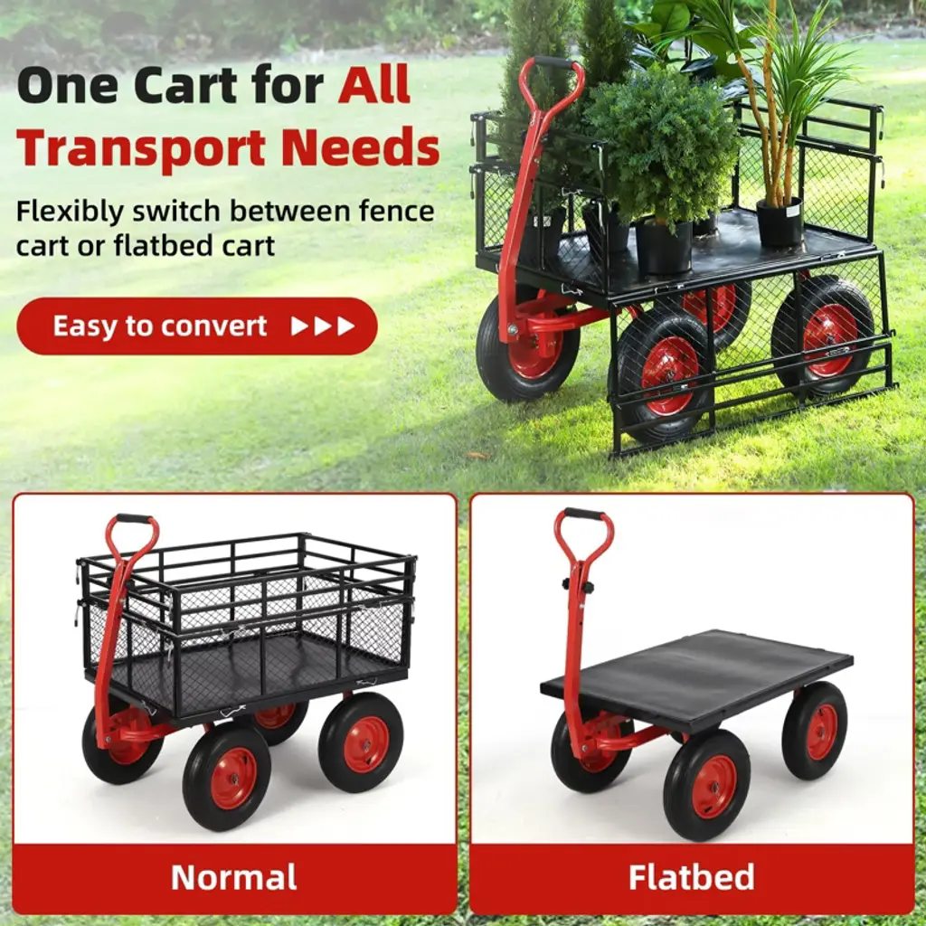 Heavy Duty 1400 Lbs Capacity Mesh Steel Garden Cart, Pullable Garden Wagons Carts On Wheels, Folding Utility Wagon With Removable Sides For Outdoor