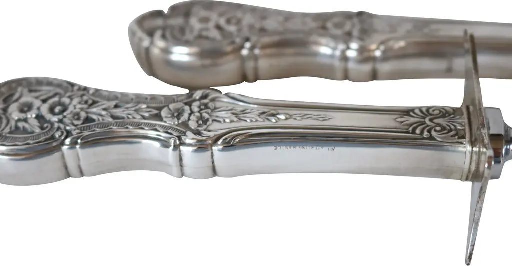 Large 1920s carving set with heavily detailed sterling silver handles. Fork, 11.25"L x 1.75"H; knife, 13.5"L x 1.75"H. Sterling marks on handles and stainless marks on blades. Minimal wear.