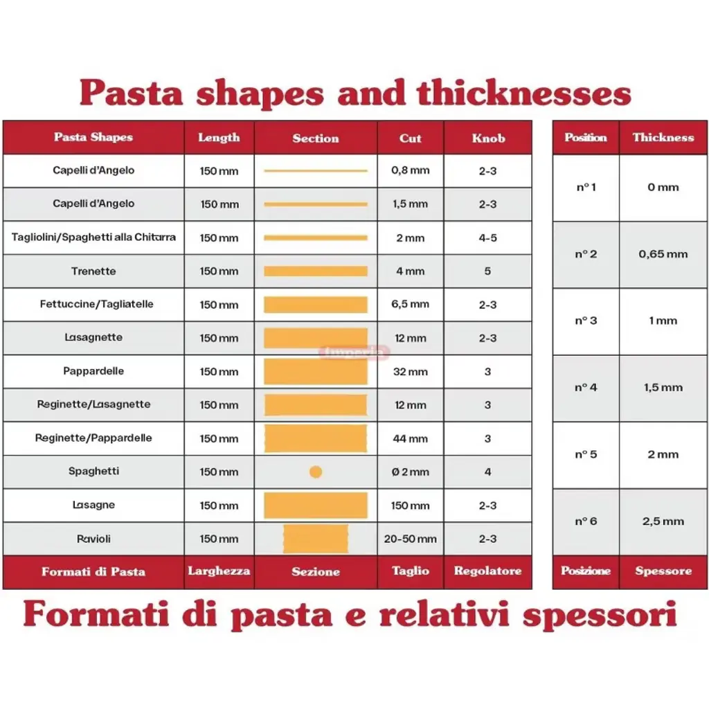 With the IPasta manual machine of the Classic Line and the double cutting accessory, already included in the package, you can make fettuccine (6.5 mm), tagliolini (2 mm) and a 150 mm lasagna sheet. For other long or filled pasta shapes, you can choose from a variety of compatible accessories. The 6-position regulator of the IPasta fresh pasta machine of the Classic Line allows you to create a sheet of different thicknesses, from 0.5 mm up to 2.5 mm, suitable for all pasta shapes.