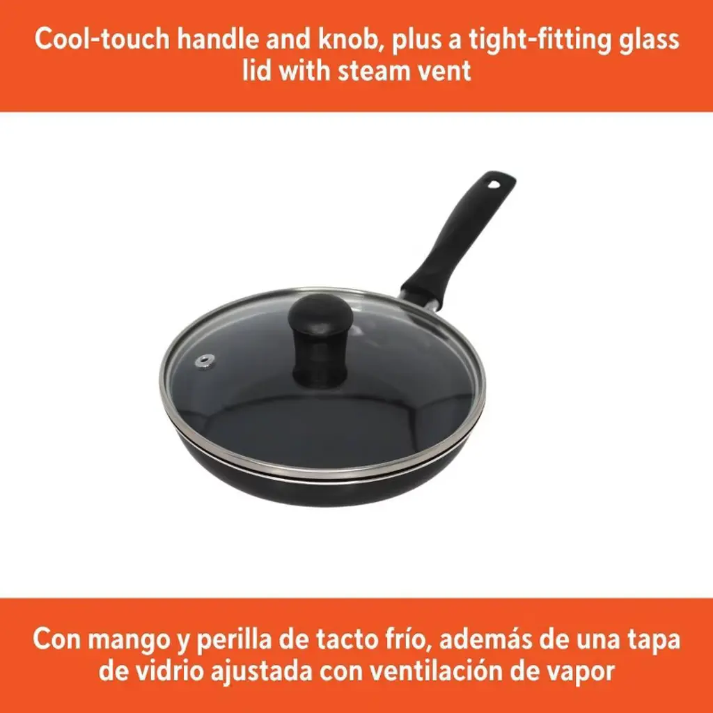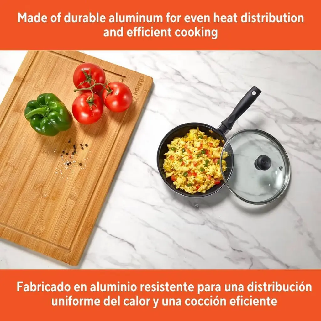 The IMUSA 6.3” Premier Ceramic Egg Pan is designed for efficient and precise cooking of small portions. Crafted from durable aluminum and coated with a gray speckled Ceramic interior and a matte black exterior, it provides excellent non-stick performance and a sleek look. The Ceramic coating ensures effortless food release and promotes healthier cooking by requiring less oil. The pan features a cool-touch handle and knob for safe, comfortable handling, and a tight-fitting glass lid with a steam vent to help control moisture while cooking. Ideal for making eggs, mini omelets, hash browns, mini crepes, and other single-serving dishes, this pan is perfect for preparing individual portions or small meals. Its compact size and efficient heat distribution make it a convenient choice for quick and easy meal preparation. Trust the IMUSA Premier Ceramic Egg Pan as your go-to kitchen helper. It will surely become your kitchen's beloved companion simplifying and enhancing your culinary endeavors.