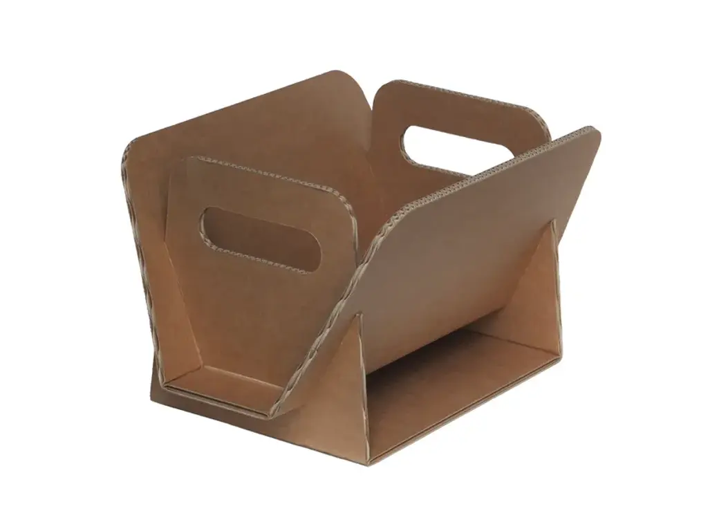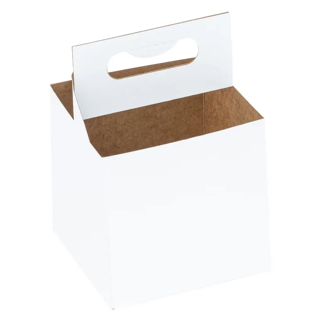 This heavy-duty, recyclable beverage carrier securely holds four juice bottles, each with dimensions of 2.24" D x 2.24" W x 7.25" H. Constructed from white clay-coated paperboard (outside) and uncoated brown paperboard (inside), these carriers offer a printable surface and barrier protection. Ideal for food service businesses, personal use, or transporting Naked Smoothies, these handled carriers provide grab-and-go convenience for hot or cold drinks. No PFAS added.