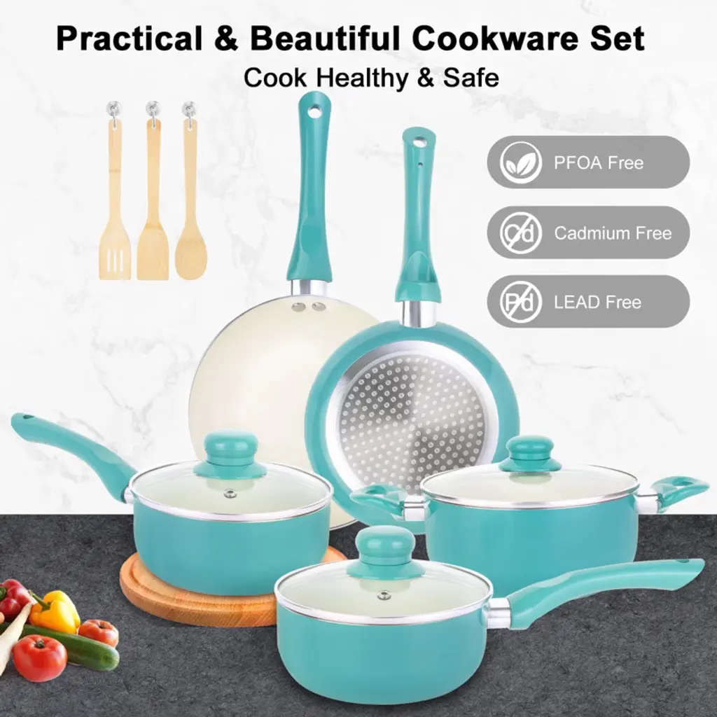 Itopfox 11-piece Nonstick Cookware Set With Bamboo Utensils, Ceramic Coating, Stay Cool Handles, Induction Compatible, Turquoise