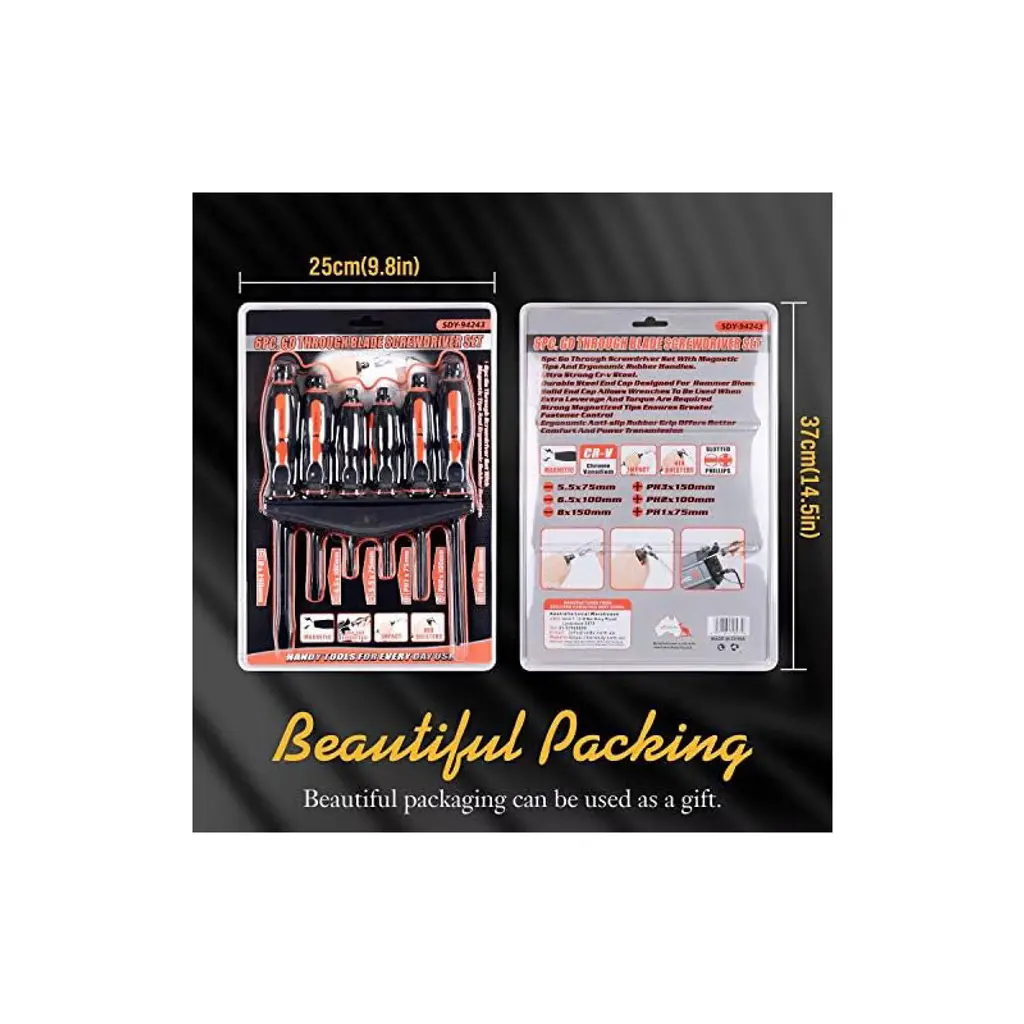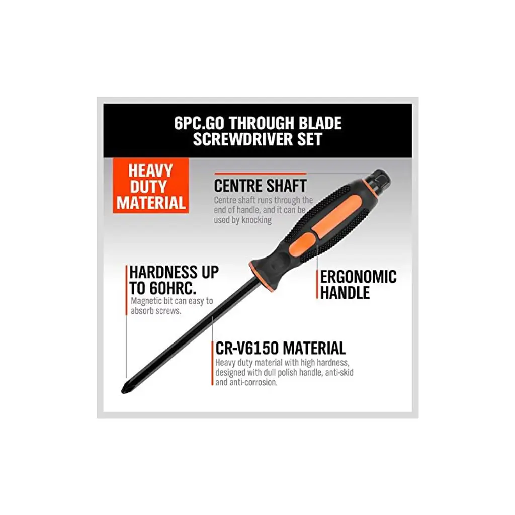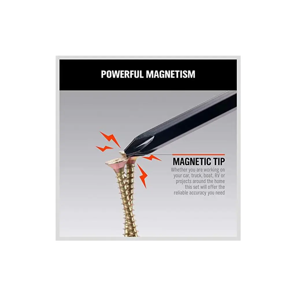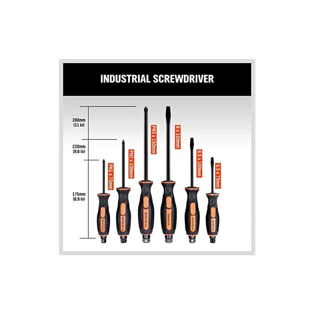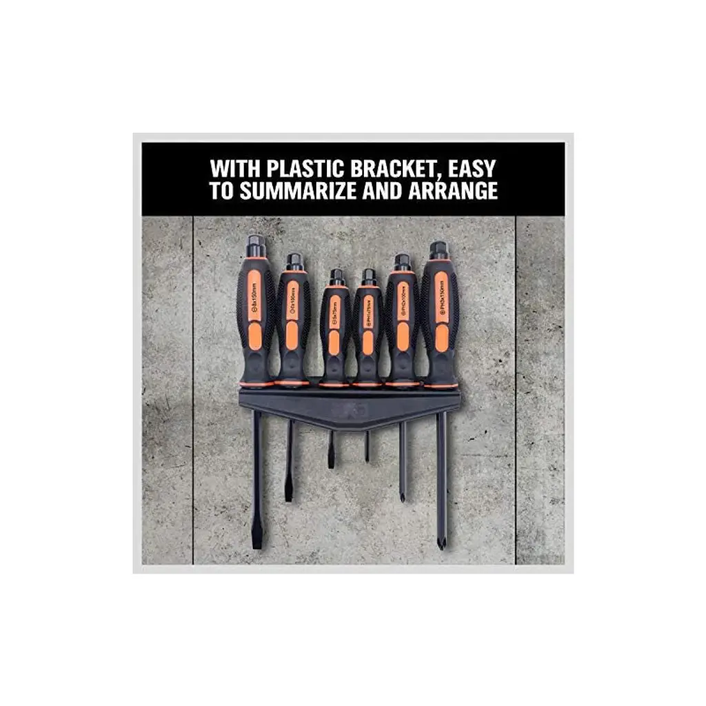 Discover this 6 - piece magnetic screwdriver set perfect for fastening, chiseling, and loosening seized screws. The set is made of heat - treated Cr - v steel, which offers high hardness and good toughness. The ergonomic TPR handle with a cushion grip and a button makes it extremely easy to use. The black - finished blades have magnetic tips that can attract screws conveniently. There's an extra - tough Pound - thru blade that can withstand hammering, avoiding splintering. The hexagon rotating cap allows for more torque when used with a wrench or precise control with fingertips. It includes 3 slotted tips (5.5, 6.5, 8) and 3 Phillips tips (Ph1, PH2, PH3), suitable for a wide range of tasks. And with the included wall - mounting rack, storage and tool retrieval are a breeze, bringing convenience to your daily DIY projects and professional work.