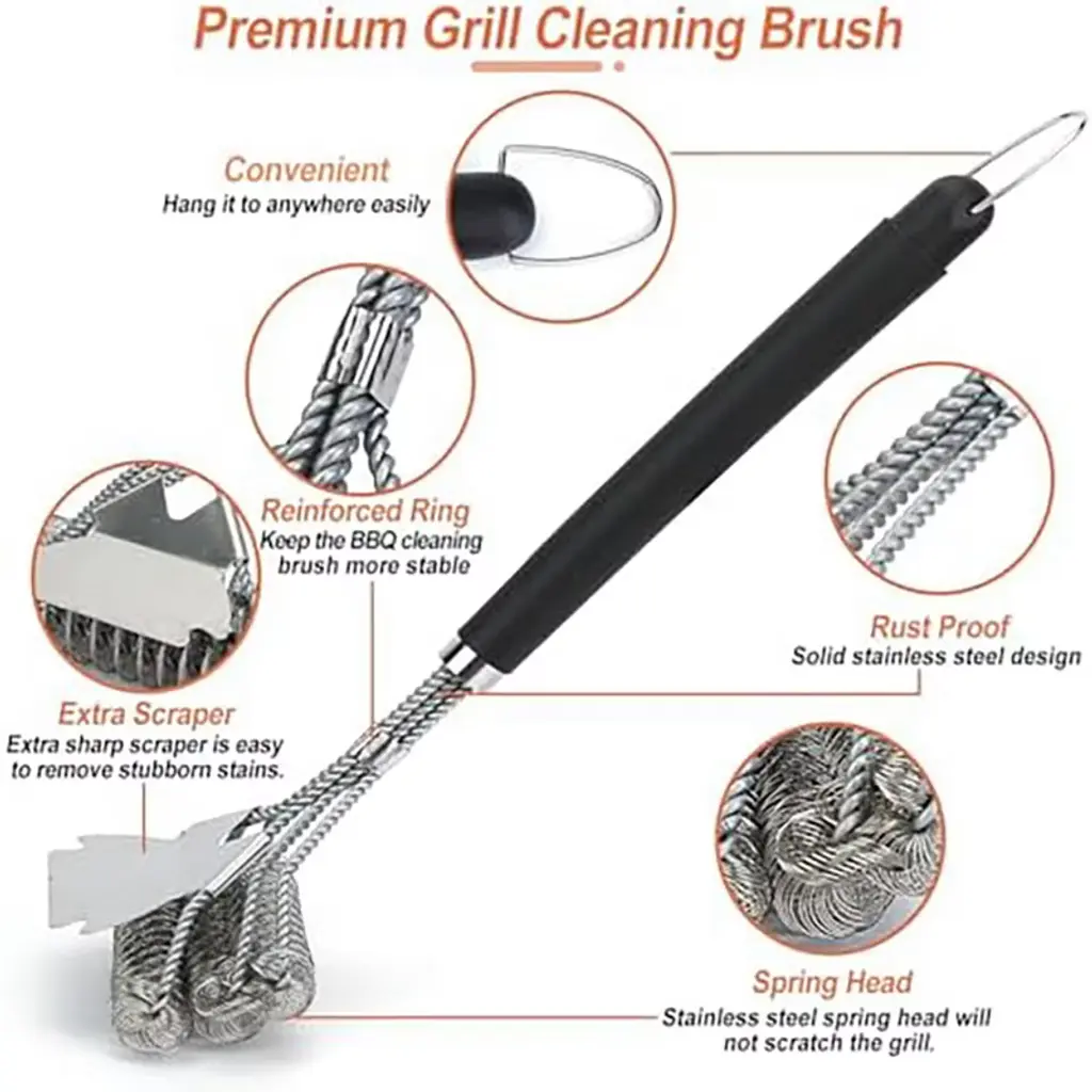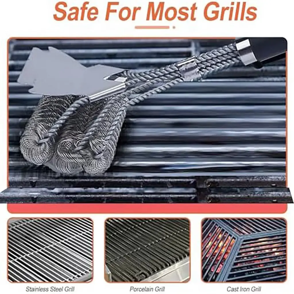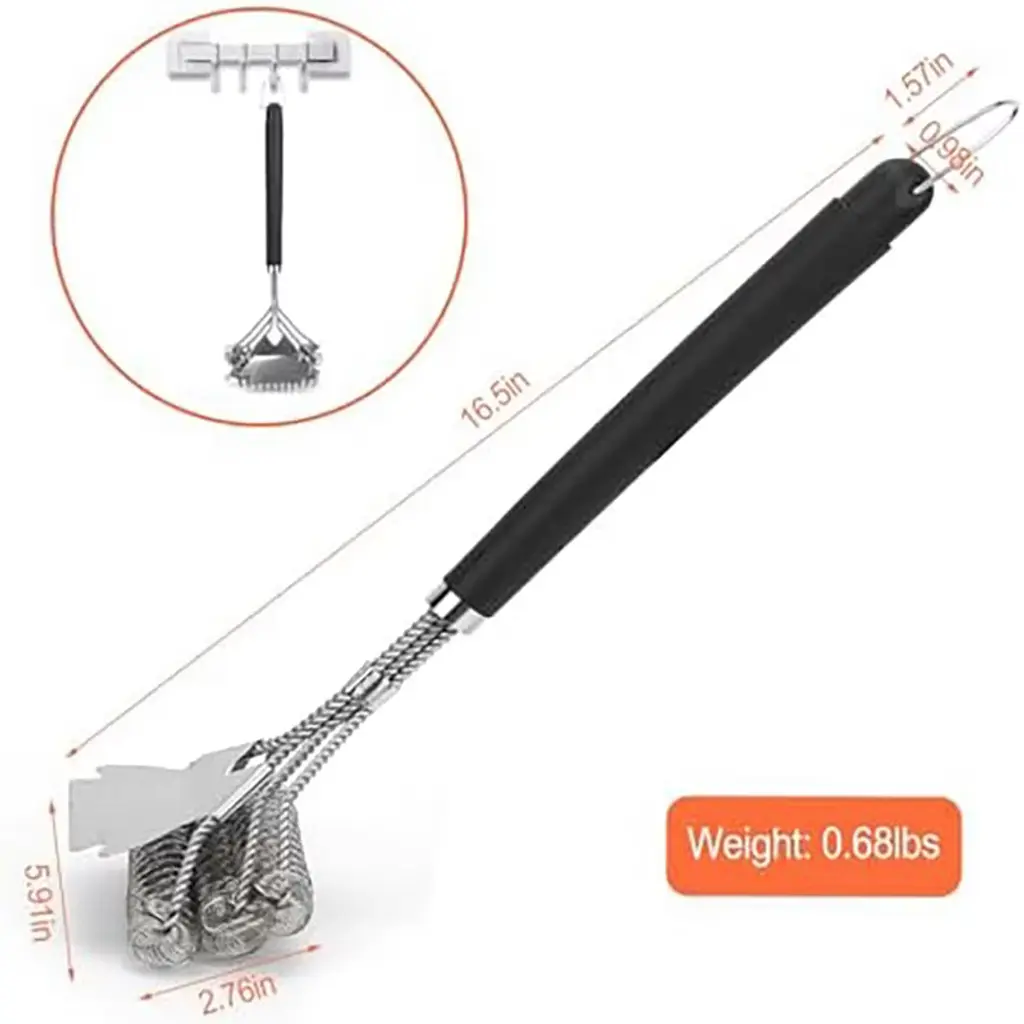 Upgrade your barbecue cleaning routine with this grill brush with scraper. Made of high - quality stainless steel and a PP handle, it's built to last and resist rust. The 16.5 - in handle provides a comfortable grip, allowing you to clean hard - to - reach areas without getting burned. The unique design includes 3 rows of brush heads and an internal scraper. The stainless steel spring head cleans the grill from all angles without scratching it. After use, simply rinse it with dish soap under water and hang it to dry. It can be stored in a box or hung up for easy access. This grill cleaner is suitable for a wide range of barbecue grills, including those made of porcelain, cast iron, and ceramic, whether they're square or rectangular. Say goodbye to stubborn stains and hello to a clean grill with this essential barbecue tool.
