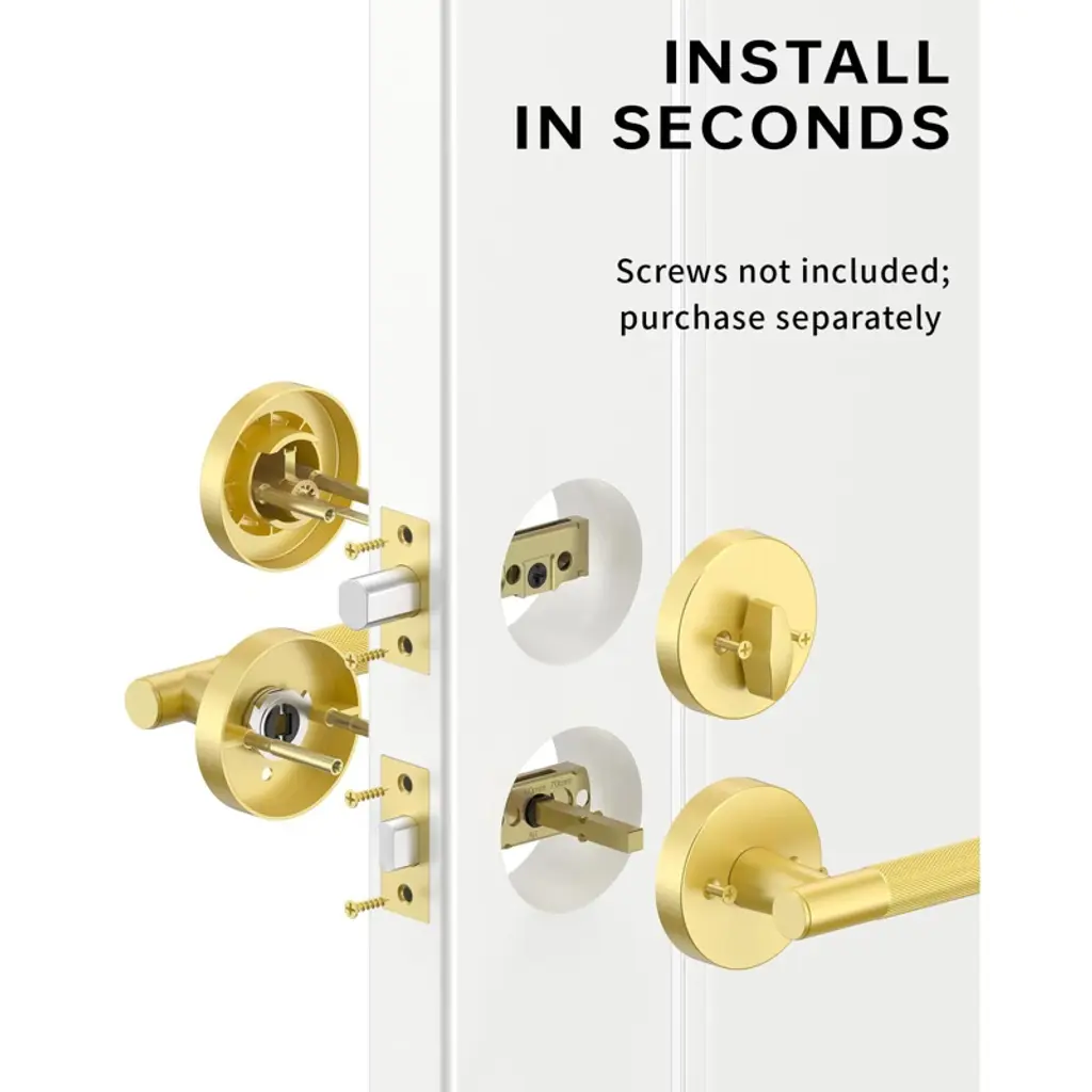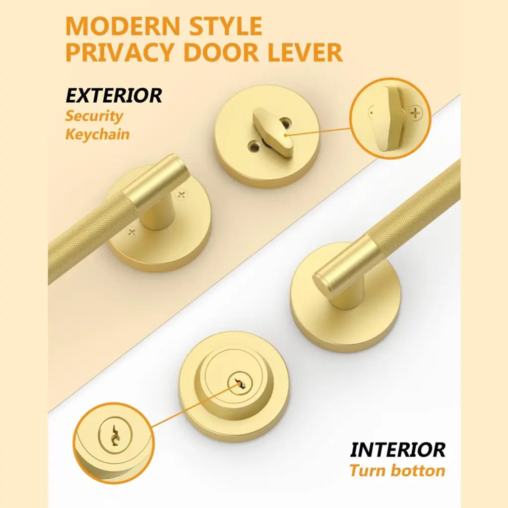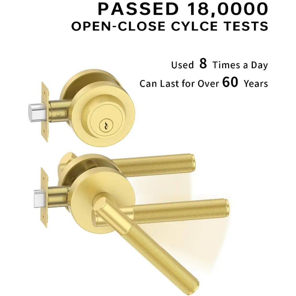 Upgrade your home's security and style with this premium front door lock set. It features a double - cylinder deadbolt and heavy - duty security handles. The set includes both a deadbolt and a lever handle, with all keys alike for ultimate convenience. The brushed gold zinc - alloy passage door knobs are not only stylish but also functional. They can enhance the look of any room, from bedrooms to bathrooms. Installation is a breeze; just use a screwdriver and follow the clear instructions. Crafted from top - grade materials, these door knobs are built to last, offering smooth operation and reliability. They are versatile, fitting a variety of door sizes and configurations, and are suitable for both right - handed and left - handed doors. With this lock set, you can enjoy enhanced security and a touch of sophistication in your home.