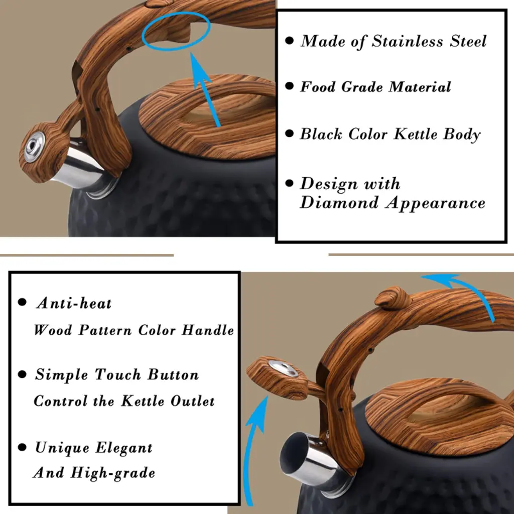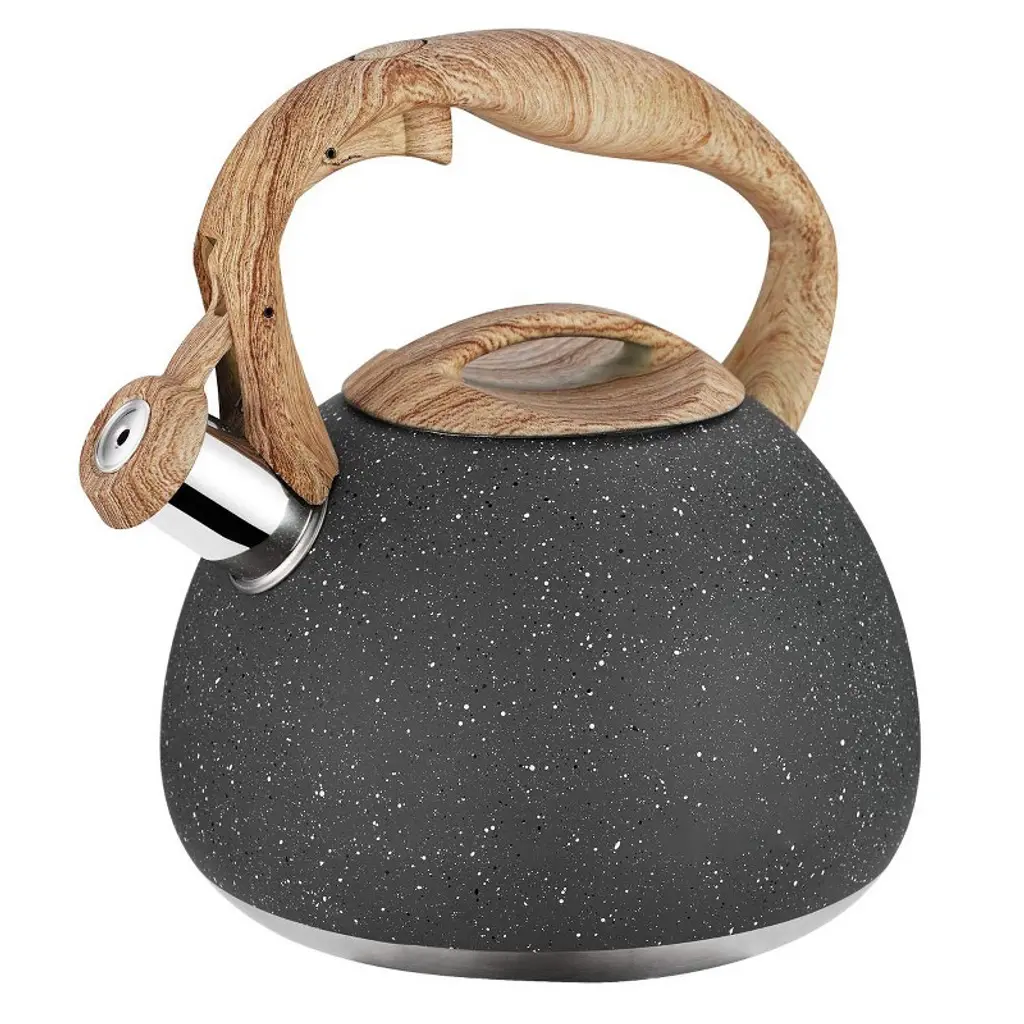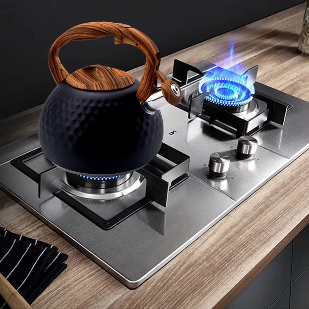 Discover this remarkable tea kettle perfect for your kitchen needs. Crafted from heavy stainless steel, it features a sleek black body with a diamond - like appearance and a wood - pattern handle, adding a touch of elegance. With a 3 - liter capacity, it's great for families or small gatherings, allowing you to boil enough water for about 12 cups in one go, saving you time. When the water boils, it emits a loud whistle, so you can focus on other activities. The anti - heat, ergonomic handle with a simple - touch button makes it easy and safe to use. It's suitable for all types of stovetops, including induction, electric, gas, and natural gas. Whether you're having breakfast or enjoying a tea break, this kettle is a practical and stylish choice for your daily routine.