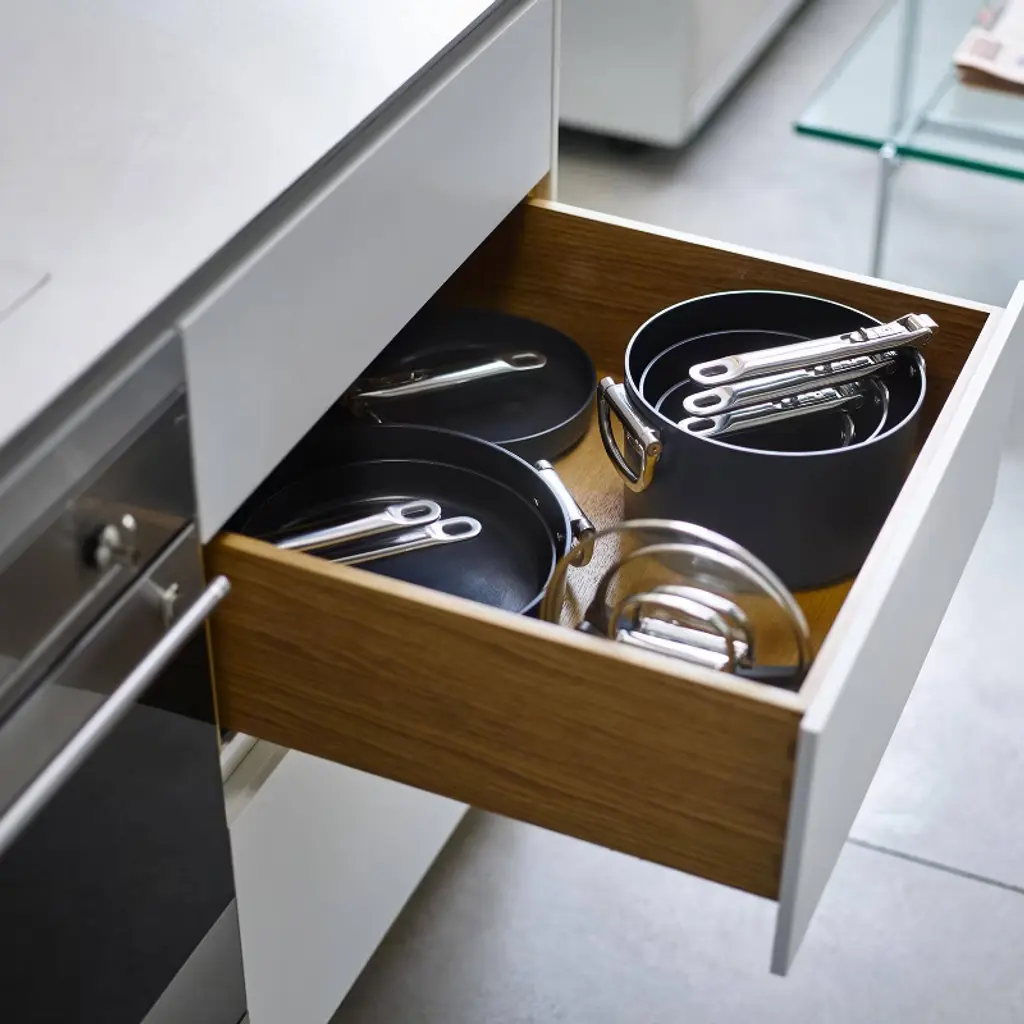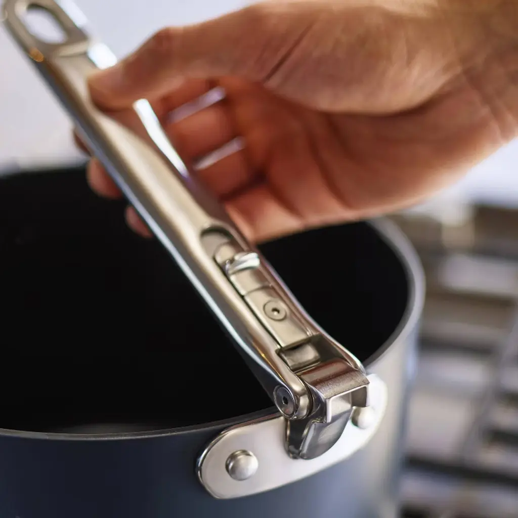 Goodbye clutter, hello Space! This 15 cm (1.4 qt) non-stick saucepan has a clever, folding stainless-steel handle that saves up to 50% more space than a standard pan when stored. Engineered to last, the handle features our patented and fail-safe SwingLock™ Mechanism that locks the handle securely into position during use and optimises space when folded. When it comes to cooking performance there's no compromise either. The professional quality, heavy-gauge aluminium body ensures even heat distibution that eliminates hot spots and is built to last. The high performance, ceramic non-stick coating is super durable, easy to clean and allows you to achieve exceptional cooking results. It's healthier to cook with too as it's free from PTFE, PFAS, PFOA, Lead and Cadmium, which means you can prepare all your favourite recipes with confidence. It comes with a tempered glass lid that also has a folding handle, making storage even easier. Suitable for all stove, including induction, this pan is part of the Space cookware range - created for cooks, made for storage.