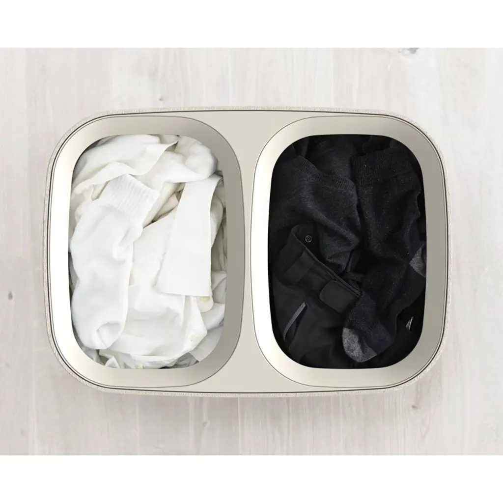 This smart laundry basket features a host of practical features that help make wash day less of a chore. Beneath the lid it has two 45-litre fabric tote bags allowing you to separate washing into light and dark/coloured fabrics. Each bag has handles at the top enabling you to conveniently lift and carry it straight to the machine and a helper handle on the base to make emptying easier. When replacing each bag in the basket there’s no fiddly ties or buttons to do up either as the self-locating rim ensures it drops perfectly back into place, ready for the next load. The stylish fabric exterior is designed to compliment a range of interior styles and decors making it perfect for storing in the bathroom, bedroom or utility room. Comes flat-packed with full assembly instructions.