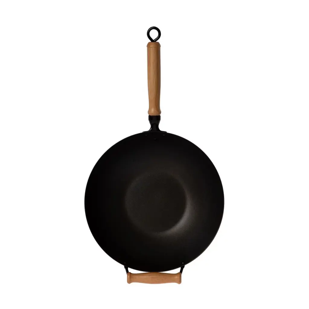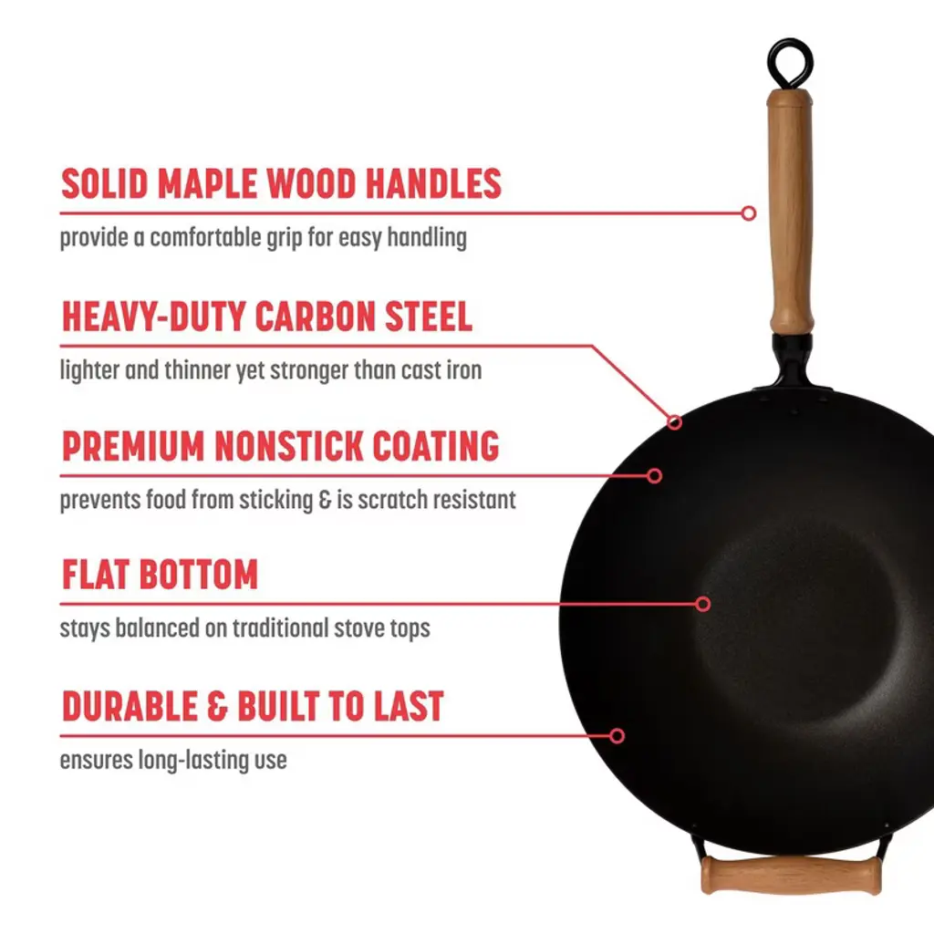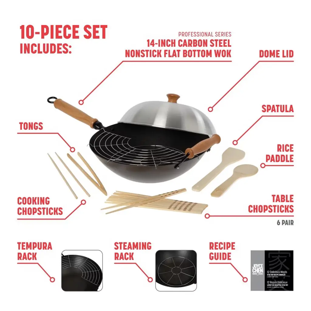 Joyce Chen had a passion for creating healthy, flavorful meals and making Asian cuisine approachable for home cooks everywhere—leaving a lasting impact on food, culture, and culinary curiosity. Inspired by her legacy, JOYCE CHEN® Kitchenware offers a full line of tools to help you bring authentic Asian flavors into your home kitchen. The Joyce Chen Professional Series 14-Inch Carbon Steel Excalibur Nonstick Flat Bottom Wok Set includes everything you need to start cooking right away: a flat bottom wok with lid, tempura rack, bamboo spatula, tongs, rice paddle, cooking chopsticks, six pairs of table chopsticks, a steaming rack, and a recipe booklet to guide your culinary adventures. Crafted from 2.0mm gauge carbon steel, the wok heats quickly and evenly—lighter and more durable than cast iron—while the Excalibur nonstick coating ensures effortless food release and easy cleanup. Comfortable maple wood handles provide secure grips for smooth handling and lifting. Whether you're stir-frying, steaming, or serving, this wok set is a versatile and stylish addition to any kitchen, making it easy and enjoyable to prepare your favorite Asian dishes at home.