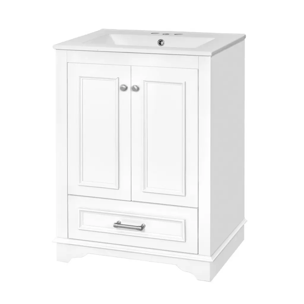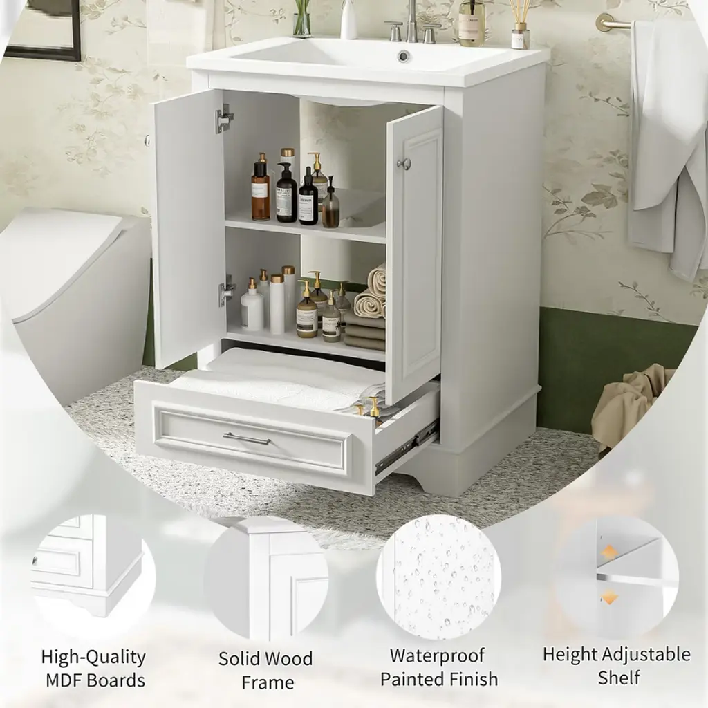 Upgrade your bathroom with this elegant 24-inch vanity, combining modern design with practical functionality. The bathroom vanity features a solid wood frame and high-quality MDF construction, paired with a smooth white ceramic sink that is waterproof and easy to clean. Three adjustable shelves and full drawers provide versatile storage for toiletries, towels, and bathroom essentials, keeping your space organized and clutter-free. Sleek silver handles and clean lines add a touch of contemporary elegance, making it a stylish centerpiece for any bathroom. Compact yet spacious, it is ideal for small to medium-sized bathrooms. Assembly is straightforward with clearly marked parts and step-by-step instructions included.