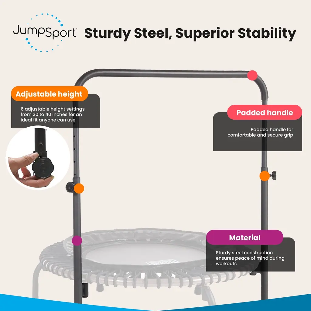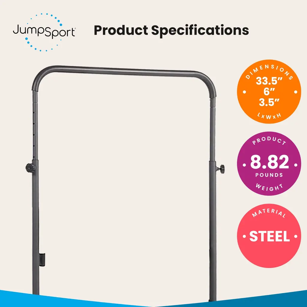 Low-impact exercise has never been easier with the JumpSport Handle Bar Accessory for 39-Inch Arched Leg Fitness Trampolines. The sporty handlebar is constructed out of durable steel for peace of mind when you work out. The exercise handle bar for 39-inch frames is specially designed for the JumpSport Fitness Trampoline Models 220, 250, 350, 350f, 370, 350 PRO, and 370 PRO. It provides additional jumper stability, increased safety, and the ability to do dynamic upper-body workouts. The trampoline bar attachment is flush-fitting and ultra-sturdy with 6 adjustable height settings (30 inches to 40 inches above the mat), a padded handle, and wide legs for superior frame stability. The handlebar legs will be installed in place of 2 trampoline legs. A great accessory for your mini trampoline Note: JumpSport Fitness Trampoline is NOT included. Fits 39-inch arched leg JumpSport Fitness Trampolines (will NOT work on 44-inch Fitness Trampolines). Whether you are training or trying to lose weight, trust the JumpSport Handle Bar Accessory for all your exercise needs. Sporty handlebar set for your arched leg fitness trampoline or rebounder Wide-leg equipment is safe to use for added stability and balance while you jump 6 adjustable height settings from 30 to 40 inches for an ideal fit anyone can use Soft flush-fit handle is comfortable to hold so you can work out with ease Great for physical therapy, upper-body exercise, and low-impact workouts JumpSport Fitness Trampoline is sold separately Material: Steel Color: Black Dimensions (L x W x H): 33.5 x 6 x 3.5 inches Weight: 8.82 pounds