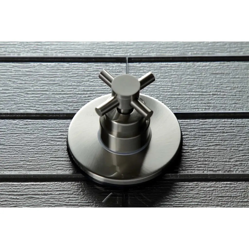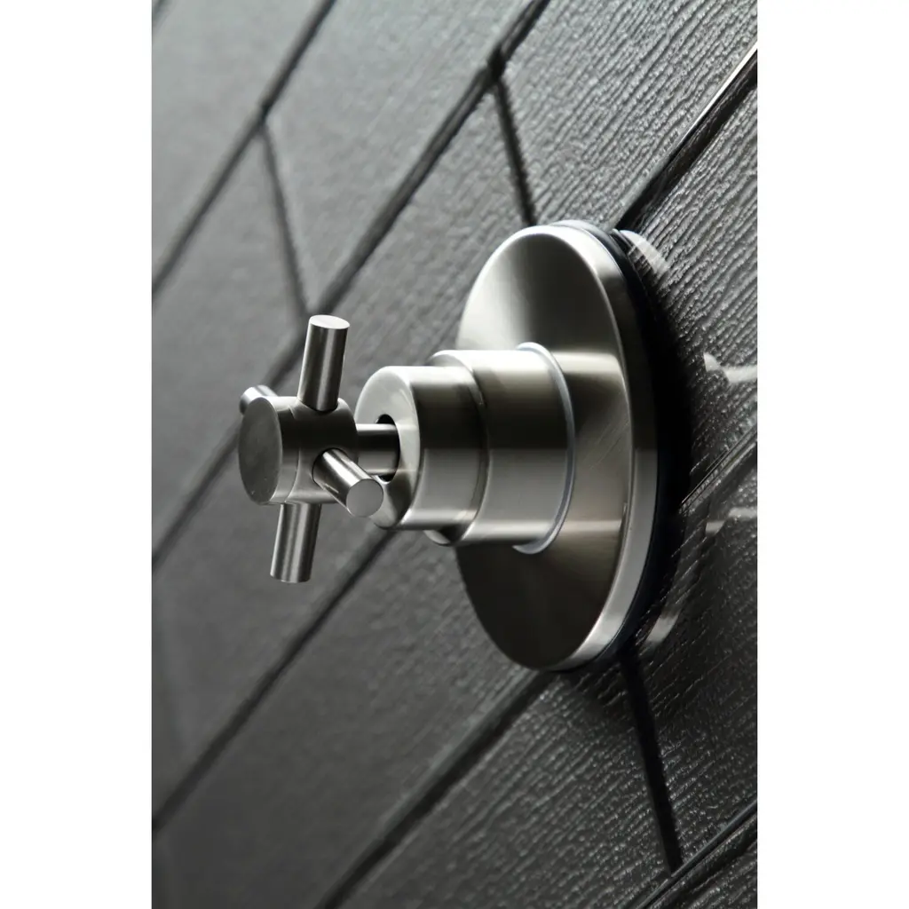 This cross handle, diverter valve and face plate help direct water to divert into three different ways, usually for the shower head, hand shower or tub spout. Each component is crafted with solid brass for durable long-term use. The diverter valve features one inlet to three outlets, to move water to its desired destination. Easy to install, the diverter is usable with hot and cold water and complies with other modern designs.Features1 inlet 3 outlets for added versatilityIn-wall installation1/2-14 NPT female inlet connection4-5/16" faceplate diameterSingle cross handle for easy operationCorrosion-resistant finishDesigned for long-lasting durability