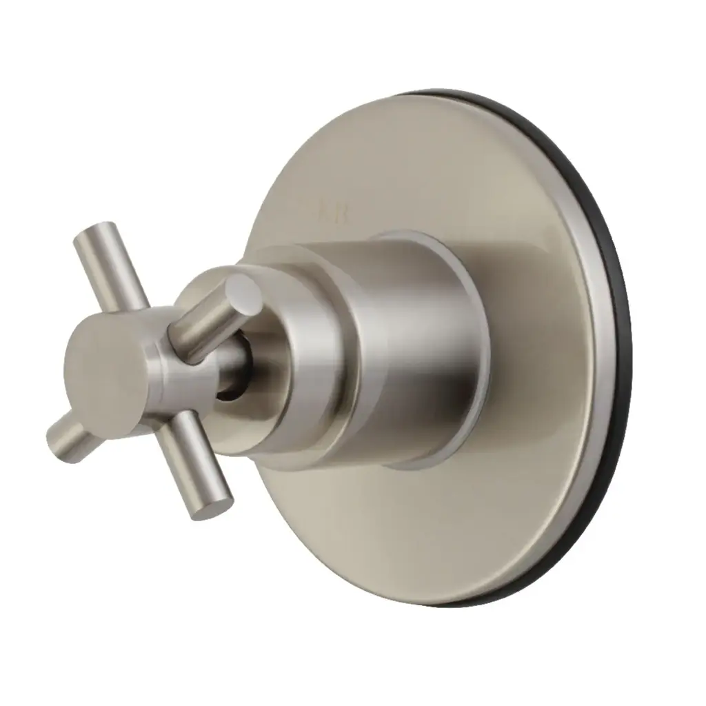 This cross handle, diverter valve and face plate help direct water to divert into three different ways, usually for the shower head, hand shower or tub spout. Each component is crafted with solid brass for durable long-term use. The diverter valve features one inlet to three outlets, to move water to its desired destination. Easy to install, the diverter is usable with hot and cold water and complies with other modern designs.Features1 inlet 3 outlets for added versatilityIn-wall installation1/2-14 NPT female inlet connection4-5/16" faceplate diameterSingle cross handle for easy operationCorrosion-resistant finishDesigned for long-lasting durability