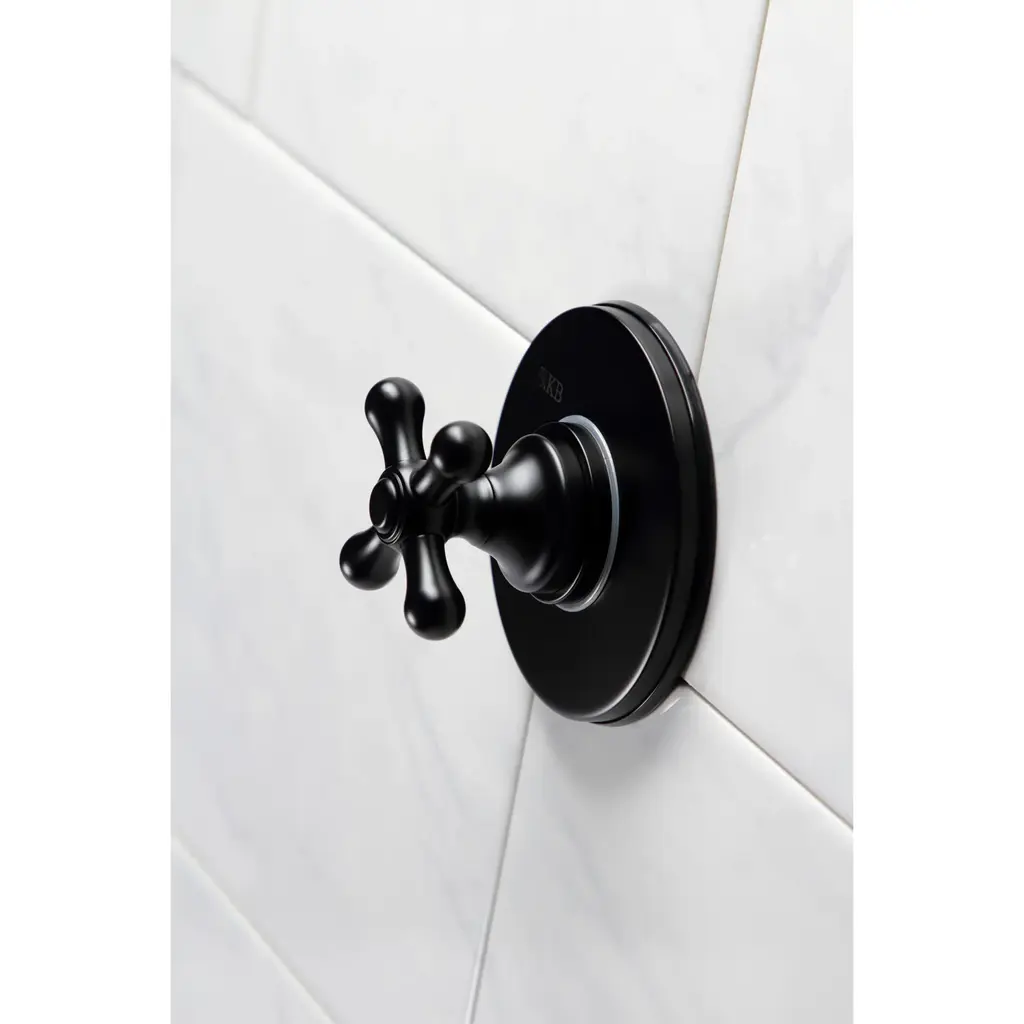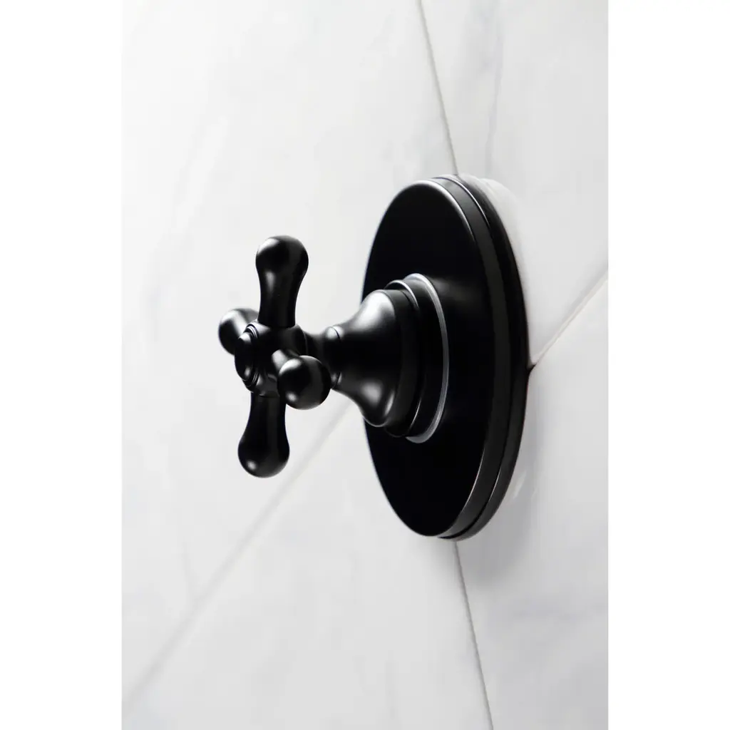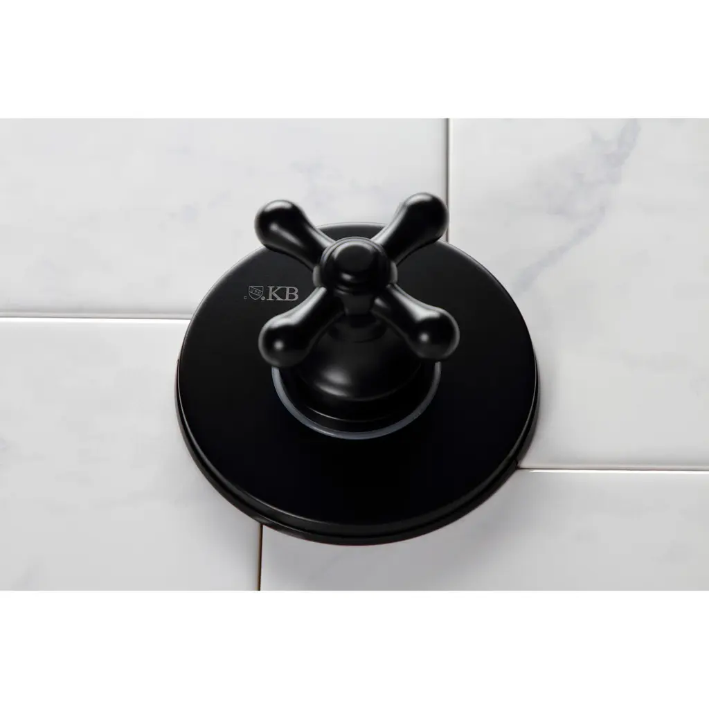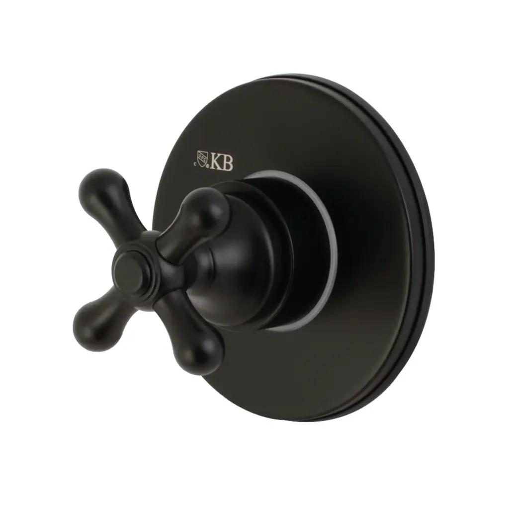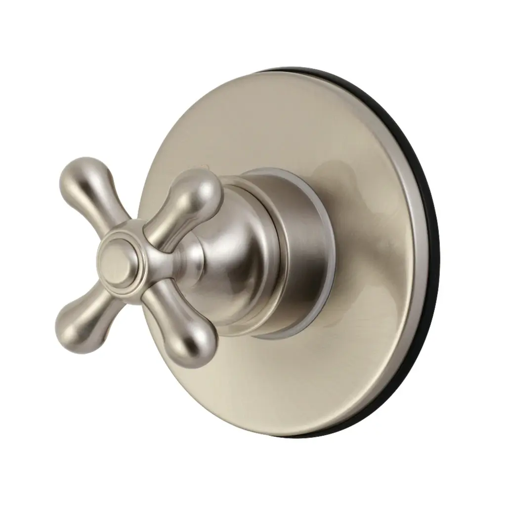 This cross handle, diverter valve and face plate help direct water to divert into three different ways, usually for the shower head, hand shower or tub spout. Each component is crafted with solid brass for durable long-term use. The diverter valve features one inlet to three outlets, to move water to its desired destination. Easy to install, the diverter is usable with hot and cold water and complies with other traditional designs.Features1 inlet 3 outlets for added versatilityIn-wall installation1/2-14 NPT female inlet connection4-5/16" faceplate diameterSingle cross handle for easy operationCorrosion-resistant finishDesigned for long-lasting durability
