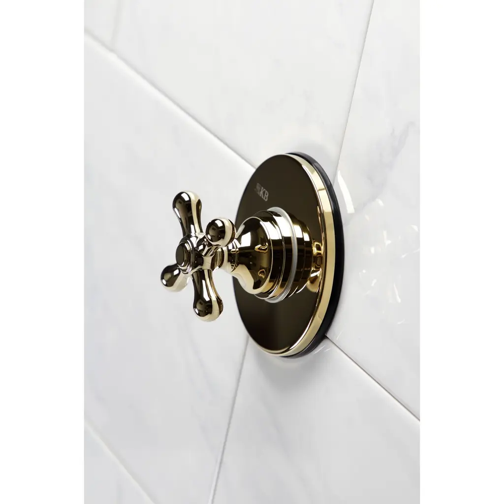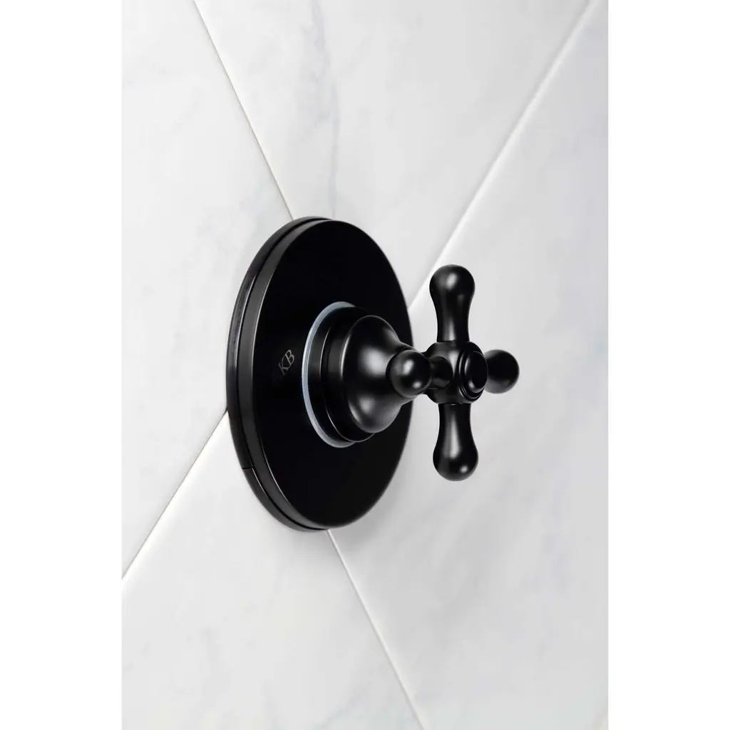 This cross handle, diverter valve and face plate help direct water to divert into three different ways, usually for the shower head, hand shower or tub spout. Each component is crafted with solid brass for durable long-term use. The diverter valve features one inlet to three outlets, to move water to its desired destination. Easy to install, the diverter is usable with hot and cold water and complies with other traditional designs.Features1 inlet 3 outlets for added versatilityIn-wall installation1/2-14 NPT female inlet connection4-5/16" faceplate diameterSingle cross handle for easy operationCorrosion-resistant finishDesigned for long-lasting durability