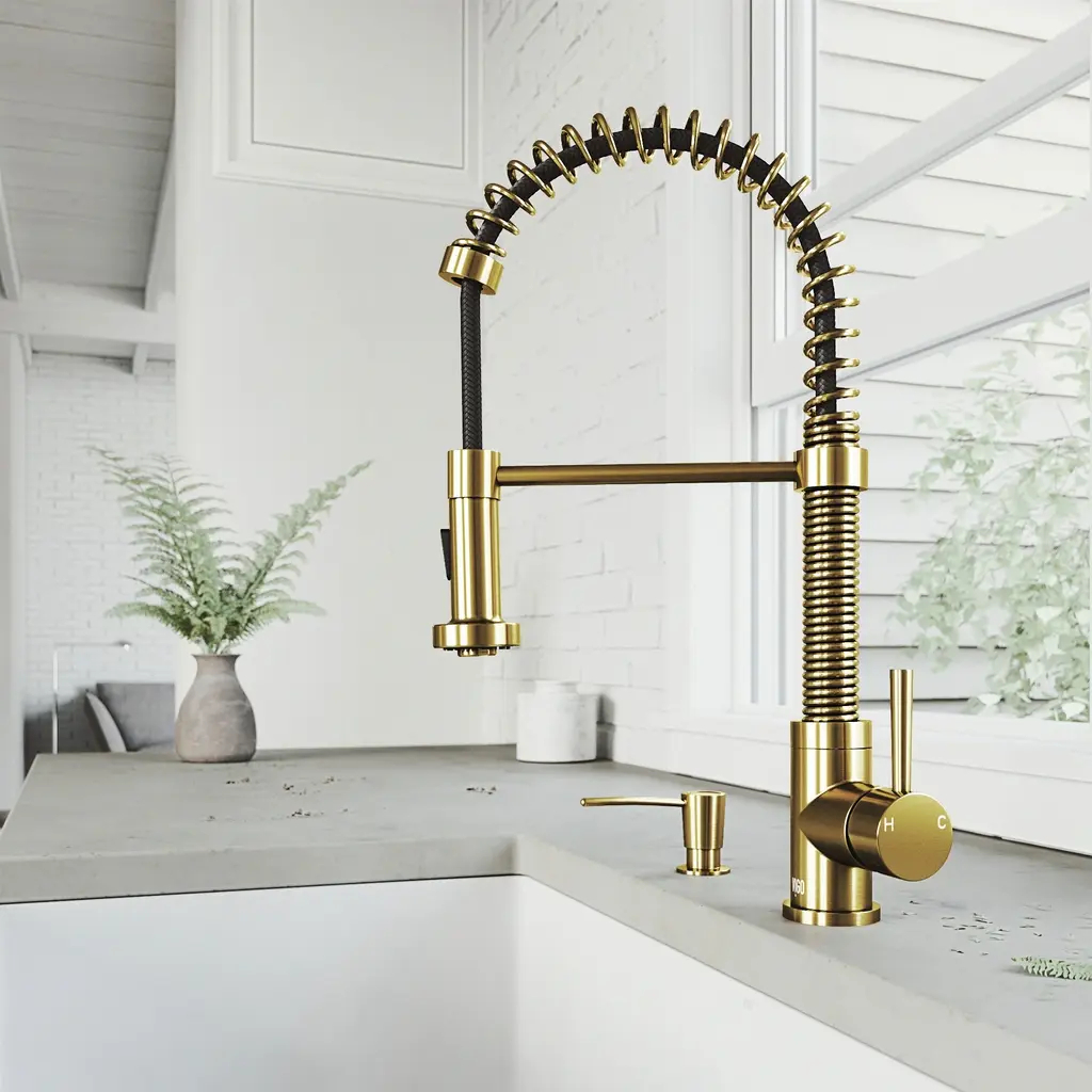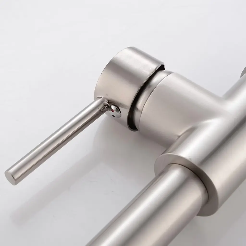 Brushed nickel kitchen faucet with pull-down sprayer, stainless steel body, single handle lever for smooth control.