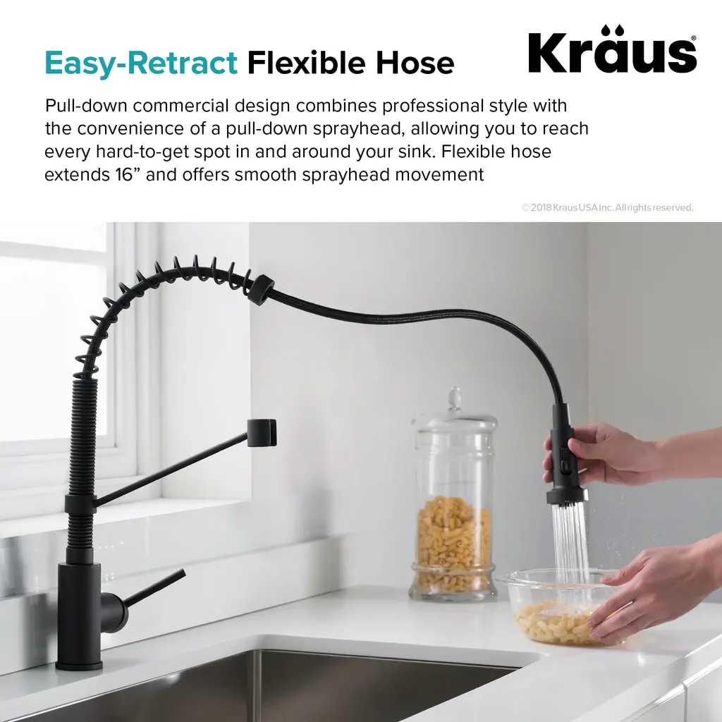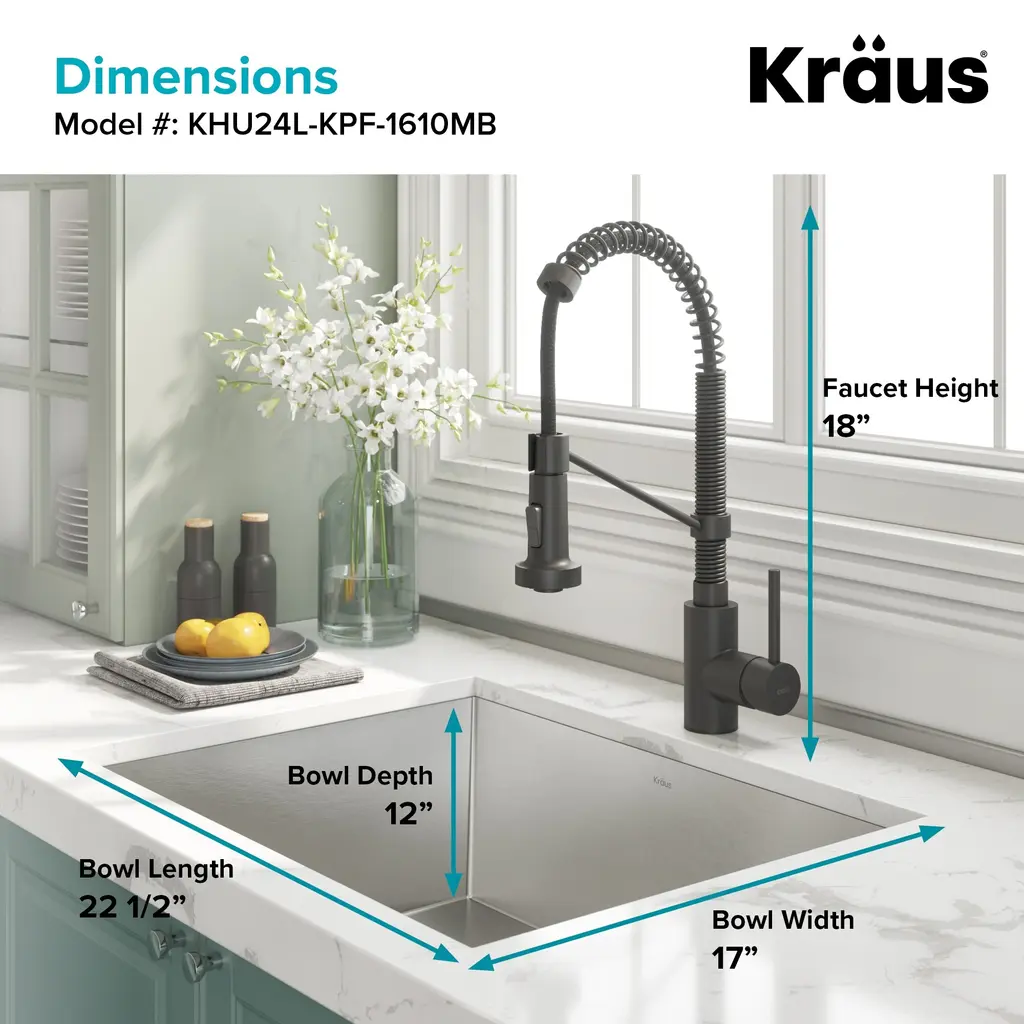 KRAUS KHU24L Pax Zero-Radius 24-inch 18 Gauge Undermount Single Bowl Stainless Steel Laundry and Utility Sink. Scrub stains on clothes or wash big utensils conveniently with this deep, single-bowl, insulated utility sink featuring a square strainer for easy maintenance. Made from heavy-duty, satin-finished stainless steel, this scratch-, rust-, and, corrosion-resistant sink provides lasting use. This sleek undermount sink blends perfectly in your modern kitchen or laundry room.Features: Included: Dimensions: Warranty and certification: KRAUS KPF-1610 Bolden 18-Inch Commercial Kitchen Faucet with Dual Function Pull-Down Sprayhead. The Bolden commercial-style faucet creates a captivating industrial look with a high-arc open coil spout, and offers the advantage of a compact 18 inches height that fits underneath most kitchen cabinets.Features: Included: Finishes: Dimensions: Warranty and certification: